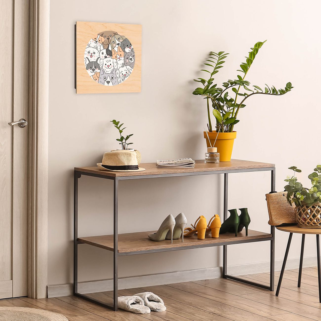 Bringe Ordnung und Eleganz in deinen Eingangsbereich mit dem banjado Schlüsselkasten Motiv Motiv Hundefreunde. Die moderne Schlüsselbox kombiniert funktionales Design mit hochwertiger Verarbeitung und wird so zu einem echten Hingucker in Flur, Büro oder Ferienwohnung. ✅ Stilvolle Schlüsselaufbewahrung mit moderner Holzfront im Motiv Motiv Hundefreunde Der Design-Schlüsselkasten Motiv Motiv Hundefreunde bietet Platz für bis zu 50 Schlüssel, die auf 5 stabilen Reihen mit je 10 Haken übersichtlich verstaut werden. Mit seinen kompakten Maßen von 30 x 30 x 5 cm passt die Schlüsselbox perfekt auch in kleinere Räume. Der schwarz lackierte Korpus mit dem Scharnier auf der rechten Seite harmoniert mit der bedruckten Holzfront und fügt sich nahtlos in jedes Wohnambiente ein. Ob als Schlüsselorganizer für Zuhause oder als praktische Lösung für Büros, Praxen und Gewerbe - der banjado Schlüsselkasten sorgt für Ordnung und Übersicht. Durch die klare Strukturierung der Haken lassen sich auch viele Schlüssel problemlos verwalten. Die Schlüsselbox Motiv Motiv Hundefreunde zur Wandmontage wird inklusive Befestigungsmaterial geliefert und ist schnell angebracht. So hast du deine Schlüssel jederzeit griffbereit und zugleich stilvoll verstaut. Mit diesem banjado Schlüsselkasten Motiv Motiv Hundefreunde kombinierst du praktische Aufbewahrung mit stilvollem Wohndesign. Ob privat oder geschäftlich - die Schlüsselbox sorgt für mehr Ordnung, Übersicht und ein wohnliches Ambiente.Vorteile im Überblick