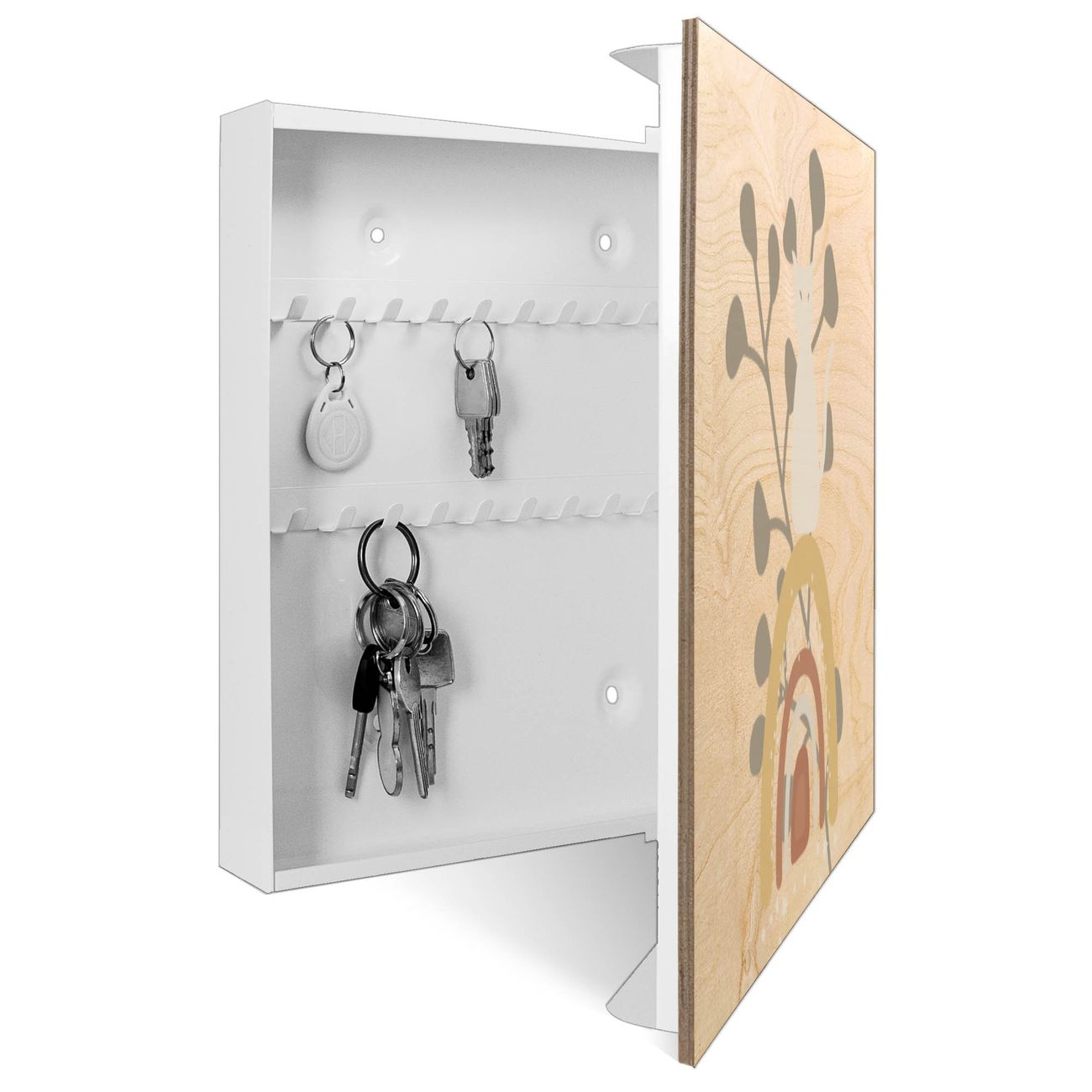 Bringe Ordnung und Eleganz in deinen Eingangsbereich mit dem banjado Schlüsselkasten Motiv Motiv Katzenregenbogen. Die moderne Schlüsselbox kombiniert funktionales Design mit hochwertiger Verarbeitung und wird so zu einem echten Hingucker in Flur, Büro oder Ferienwohnung. ✅ Stilvolle Schlüsselaufbewahrung mit moderner Holzfront im Motiv Motiv Katzenregenbogen Der Design-Schlüsselkasten Motiv Motiv Katzenregenbogen bietet Platz für bis zu 50 Schlüssel, die auf 5 stabilen Reihen mit je 10 Haken übersichtlich verstaut werden. Mit seinen kompakten Maßen von 30 x 30 x 5 cm passt die Schlüsselbox perfekt auch in kleinere Räume. Der weiß lackierte Korpus mit dem Scharnier auf der rechten Seite harmoniert mit der bedruckten Holzfront und fügt sich nahtlos in jedes Wohnambiente ein. Ob als Schlüsselorganizer für Zuhause oder als praktische Lösung für Büros, Praxen und Gewerbe - der banjado Schlüsselkasten sorgt für Ordnung und Übersicht. Durch die klare Strukturierung der Haken lassen sich auch viele Schlüssel problemlos verwalten. Die Schlüsselbox Motiv Motiv Katzenregenbogen zur Wandmontage wird inklusive Befestigungsmaterial geliefert und ist schnell angebracht. So hast du deine Schlüssel jederzeit griffbereit und zugleich stilvoll verstaut. Mit diesem banjado Schlüsselkasten Motiv Motiv Katzenregenbogen kombinierst du praktische Aufbewahrung mit stilvollem Wohndesign. Ob privat oder geschäftlich - die Schlüsselbox sorgt für mehr Ordnung, Übersicht und ein wohnliches Ambiente.Vorteile im Überblick