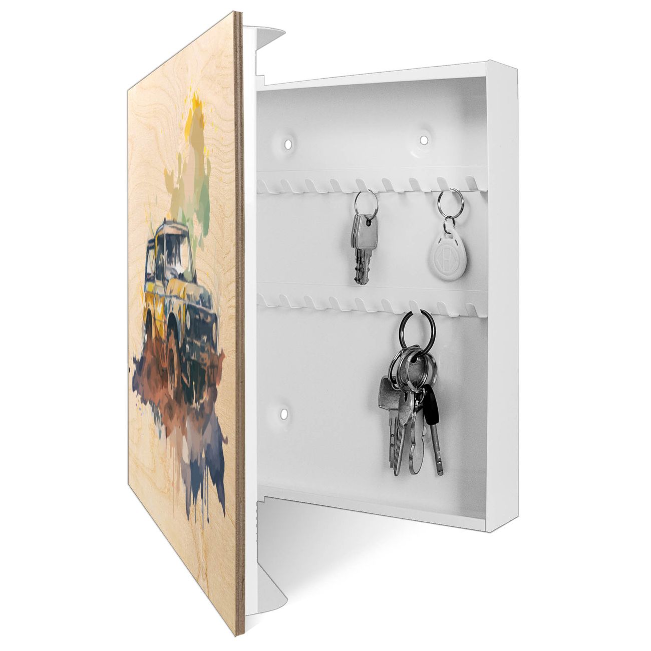 Bringe Ordnung und Eleganz in deinen Eingangsbereich mit dem banjado Schlüsselkasten Motiv Motiv Offroad Abenteuer. Die moderne Schlüsselbox kombiniert funktionales Design mit hochwertiger Verarbeitung und wird so zu einem echten Hingucker in Flur, Büro oder Ferienwohnung. ✅ Stilvolle Schlüsselaufbewahrung mit moderner Holzfront im Motiv Motiv Offroad Abenteuer Der Design-Schlüsselkasten Motiv Motiv Offroad Abenteuer bietet Platz für bis zu 50 Schlüssel, die auf 5 stabilen Reihen mit je 10 Haken übersichtlich verstaut werden. Mit seinen kompakten Maßen von 30 x 30 x 5 cm passt die Schlüsselbox perfekt auch in kleinere Räume. Der weiß lackierte Korpus mit dem Scharnier auf der linken Seite harmoniert mit der bedruckten Holzfront und fügt sich nahtlos in jedes Wohnambiente ein. Ob als Schlüsselorganizer für Zuhause oder als praktische Lösung für Büros, Praxen und Gewerbe - der banjado Schlüsselkasten sorgt für Ordnung und Übersicht. Durch die klare Strukturierung der Haken lassen sich auch viele Schlüssel problemlos verwalten. Die Schlüsselbox Motiv Motiv Offroad Abenteuer zur Wandmontage wird inklusive Befestigungsmaterial geliefert und ist schnell angebracht. So hast du deine Schlüssel jederzeit griffbereit und zugleich stilvoll verstaut. Mit diesem banjado Schlüsselkasten Motiv Motiv Offroad Abenteuer kombinierst du praktische Aufbewahrung mit stilvollem Wohndesign. Ob privat oder geschäftlich - die Schlüsselbox sorgt für mehr Ordnung, Übersicht und ein wohnliches Ambiente.Vorteile im Überblick