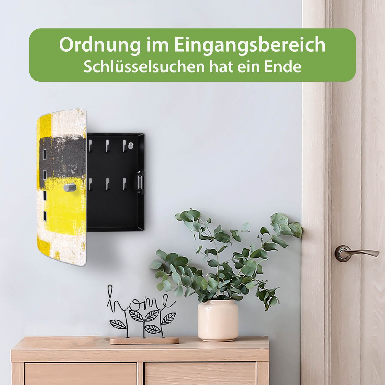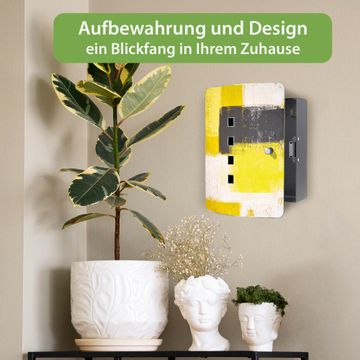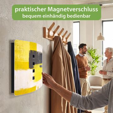 Funktion / Nutzen: Die leicht geschwungene Edelstahltür ist mit einer hochwertigen Motivfolie und dem Motiv Motiv Abstrakt Gelb kaschiert. Ein praktischer Magnetverschluss ermöglicht Ihnen ein schnelles Öffnen und Schließen. Befestigt wird der Schlüsselkasten an 2 Stellen auf der Rückseite, passendes Montagematerial fügen wir bereits bei.