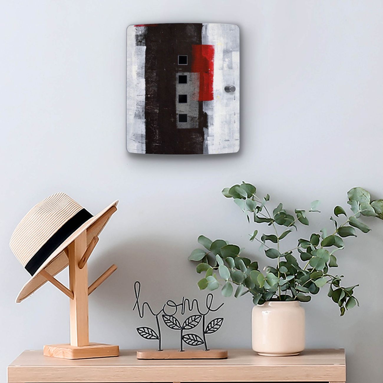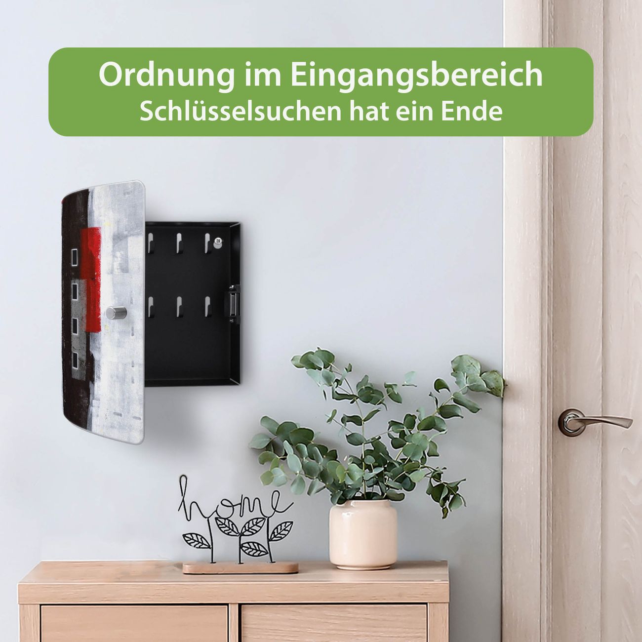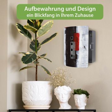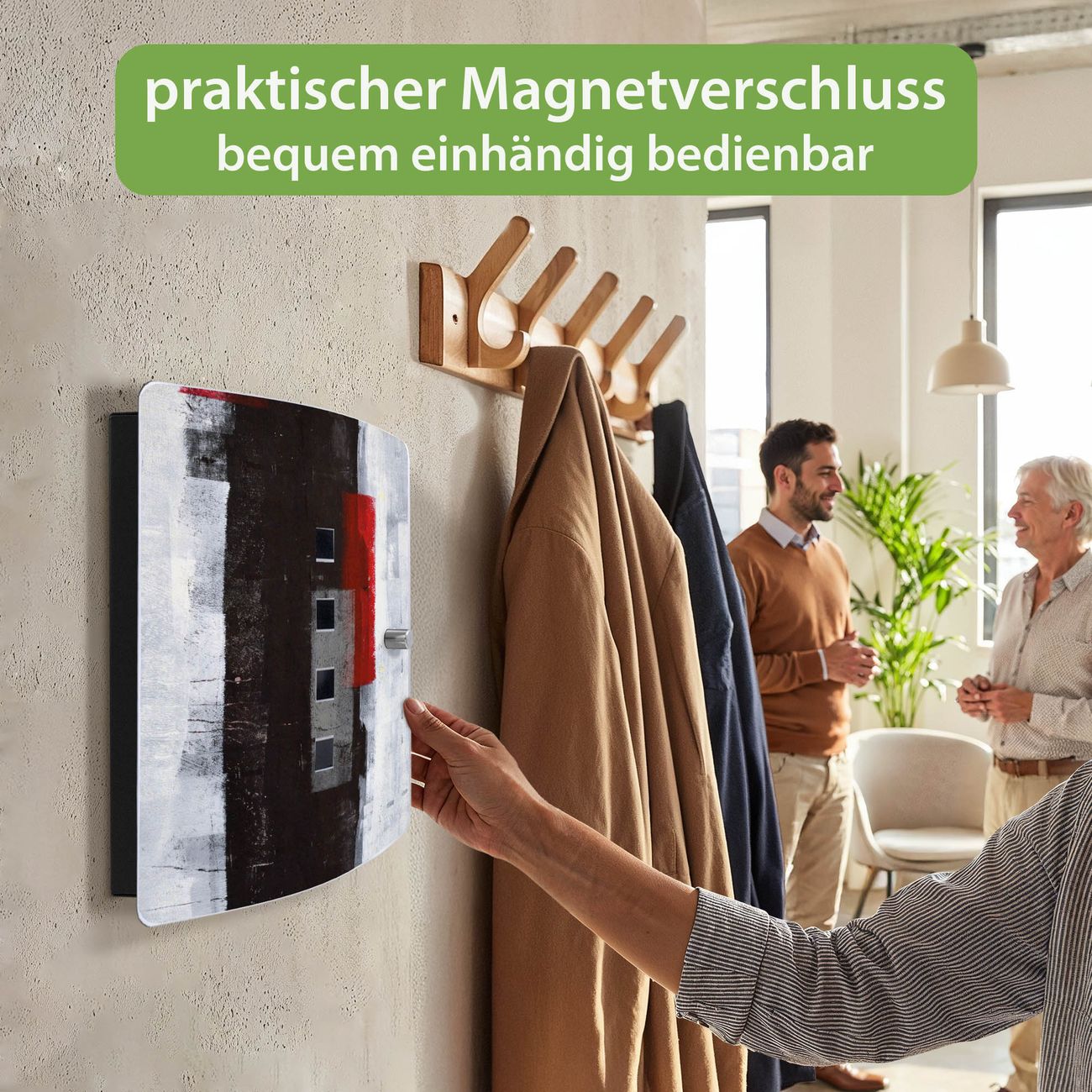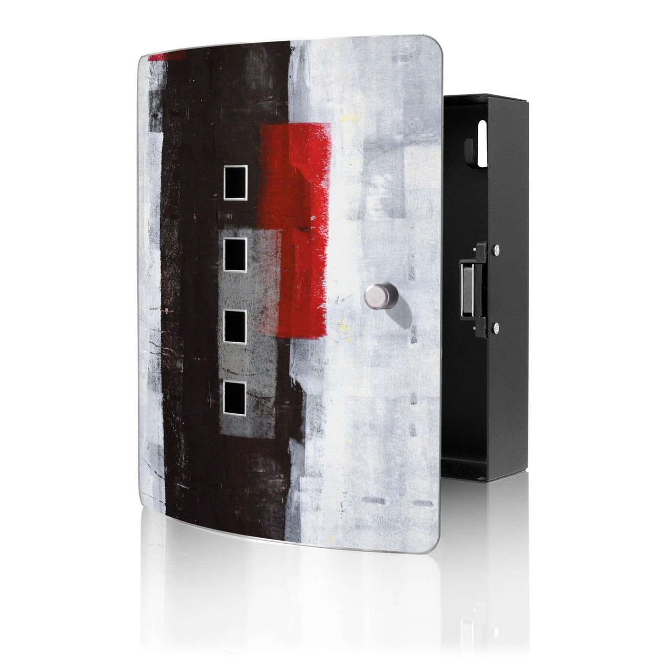 Funktion / Nutzen: Die leicht geschwungene Edelstahltür ist mit einer hochwertigen Motivfolie und dem Motiv Motiv Abstrakt Rot kaschiert. Ein praktischer Magnetverschluss ermöglicht Ihnen ein schnelles Öffnen und Schließen. Befestigt wird der Schlüsselkasten an 2 Stellen auf der Rückseite, passendes Montagematerial fügen wir bereits bei.