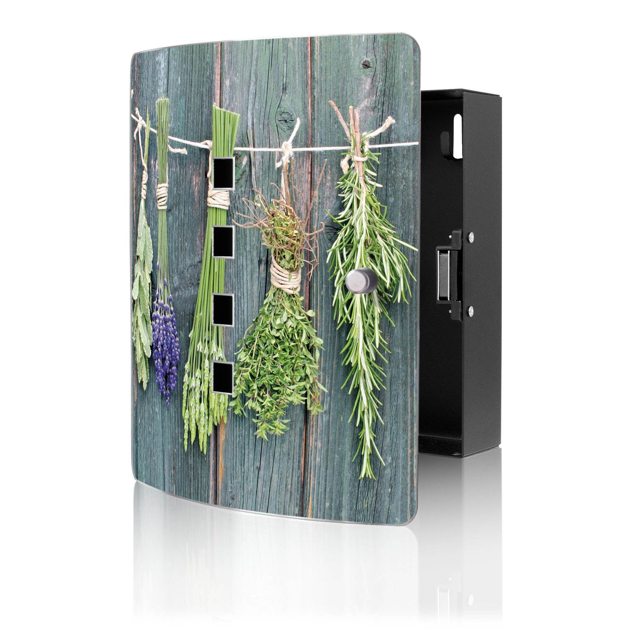 Funktion / Nutzen: Die leicht geschwungene Edelstahltür ist mit einer hochwertigen Motivfolie und dem Motiv Motiv Acht Kräuter kaschiert. Ein praktischer Magnetverschluss ermöglicht Ihnen ein schnelles Öffnen und Schließen. Befestigt wird der Schlüsselkasten an 2 Stellen auf der Rückseite, passendes Montagematerial fügen wir bereits bei.
