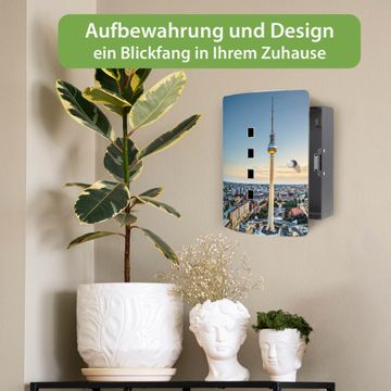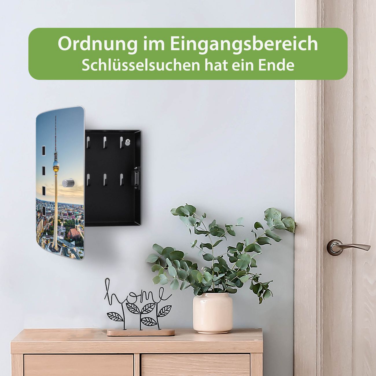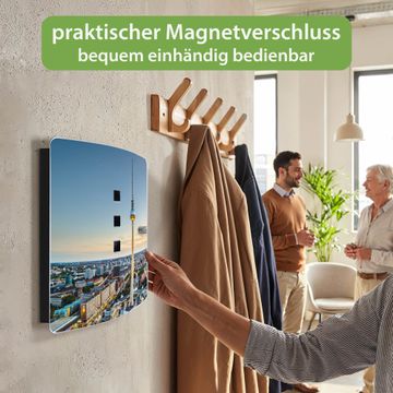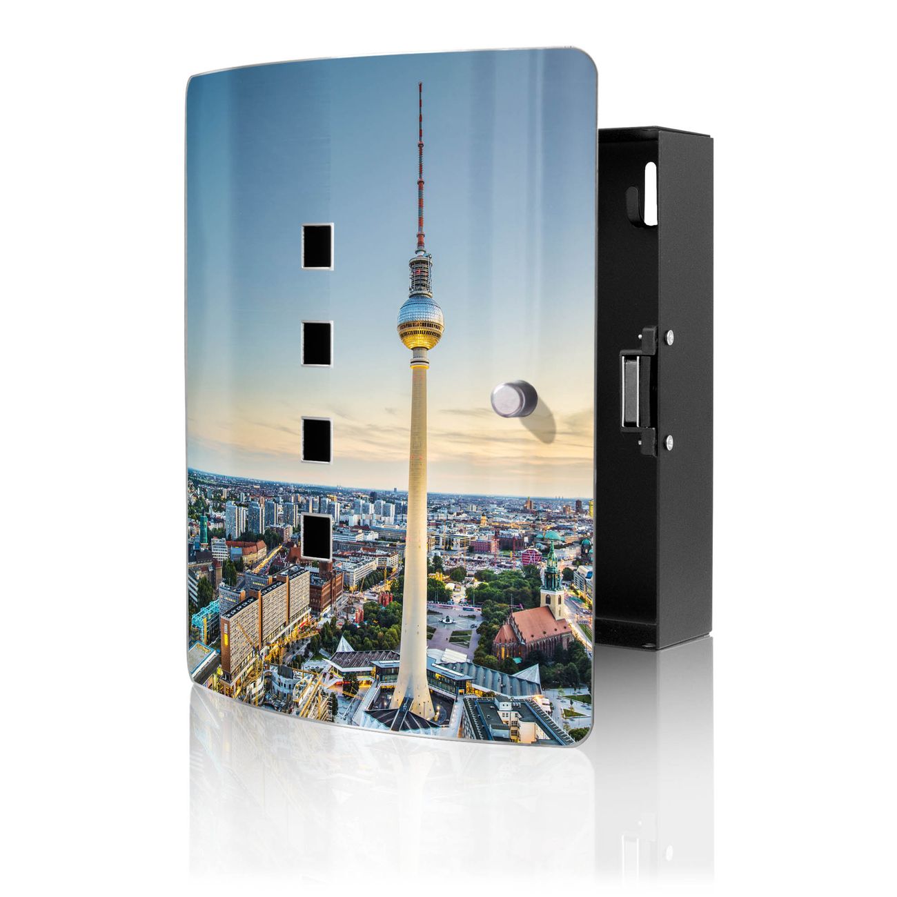 Funktion / Nutzen: Die leicht geschwungene Edelstahltür ist mit einer hochwertigen Motivfolie und dem Motiv Motiv Alexanderplatz kaschiert. Ein praktischer Magnetverschluss ermöglicht Ihnen ein schnelles Öffnen und Schließen. Befestigt wird der Schlüsselkasten an 2 Stellen auf der Rückseite, passendes Montagematerial fügen wir bereits bei.