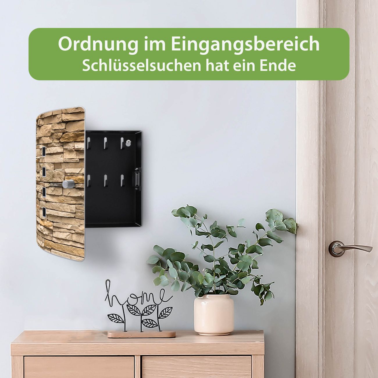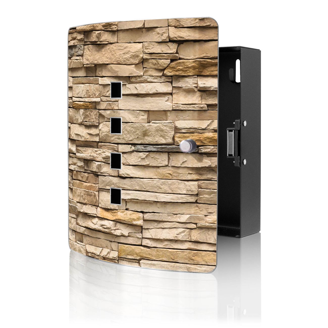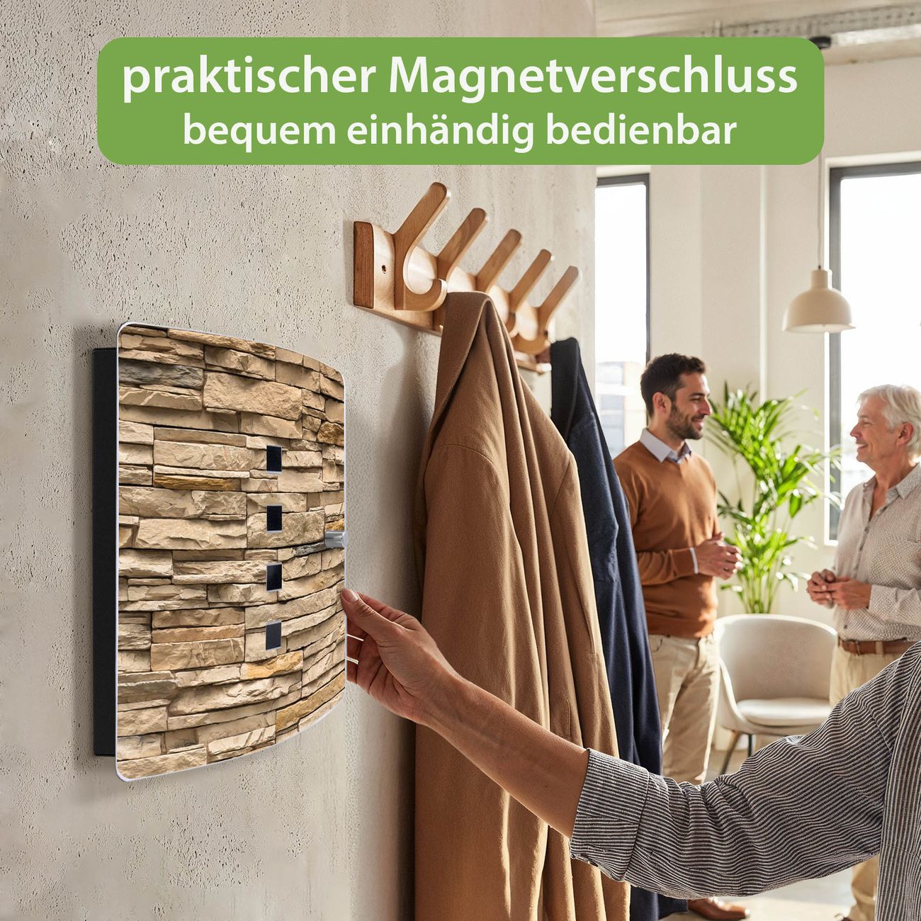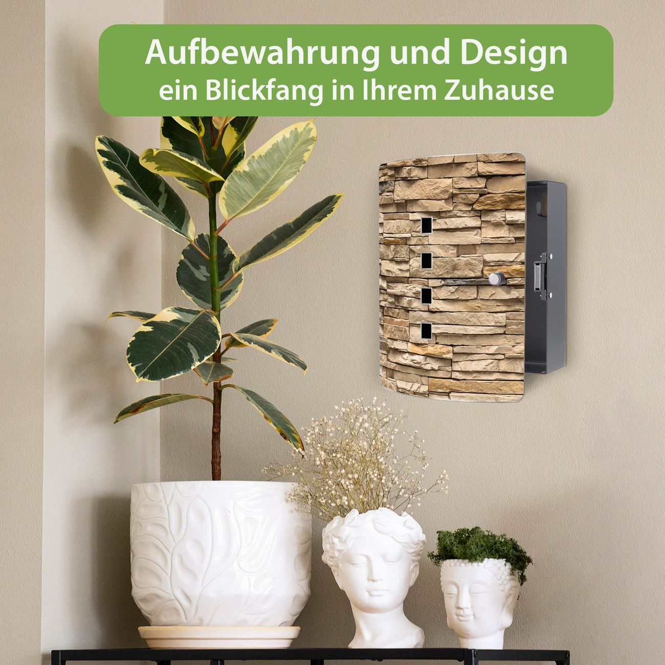 Funktion / Nutzen: Die leicht geschwungene Edelstahltür ist mit einer hochwertigen Motivfolie und dem Motiv Motiv Alte Mauer kaschiert. Ein praktischer Magnetverschluss ermöglicht Ihnen ein schnelles Öffnen und Schließen. Befestigt wird der Schlüsselkasten an 2 Stellen auf der Rückseite, passendes Montagematerial fügen wir bereits bei.