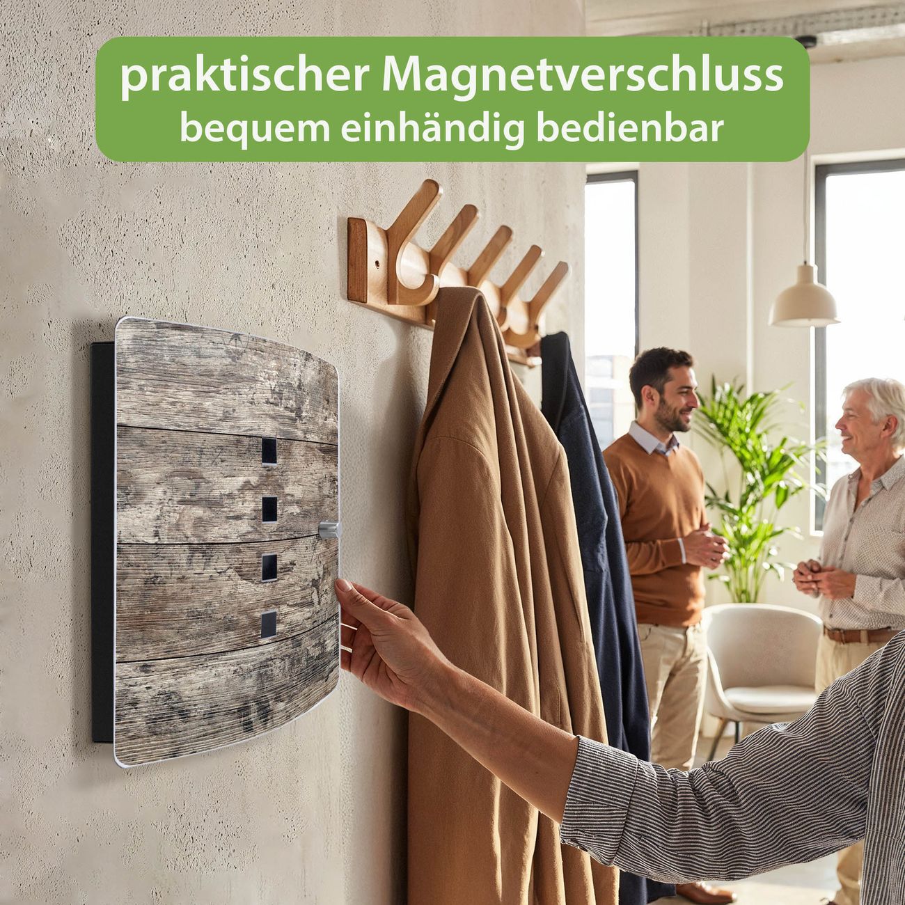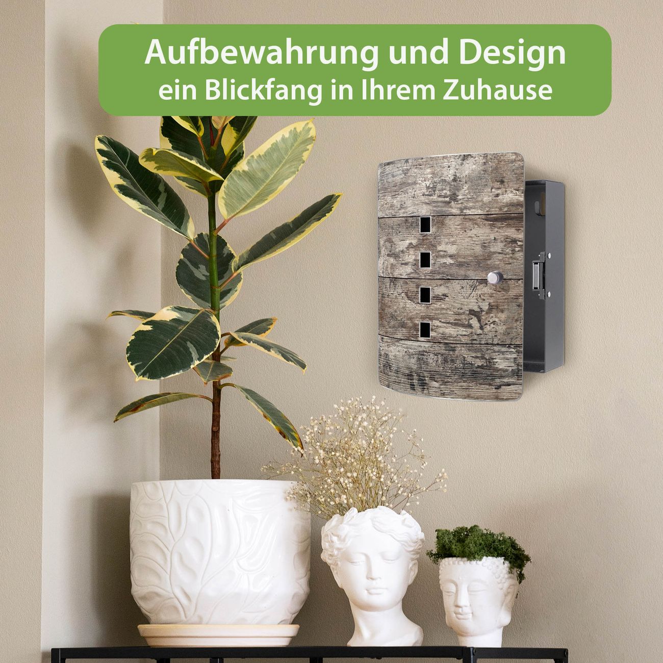 Funktion / Nutzen: Die leicht geschwungene Edelstahltür ist mit einer hochwertigen Motivfolie und dem Motiv Motiv Alte Planken kaschiert. Ein praktischer Magnetverschluss ermöglicht Ihnen ein schnelles Öffnen und Schließen. Befestigt wird der Schlüsselkasten an 2 Stellen auf der Rückseite, passendes Montagematerial fügen wir bereits bei.