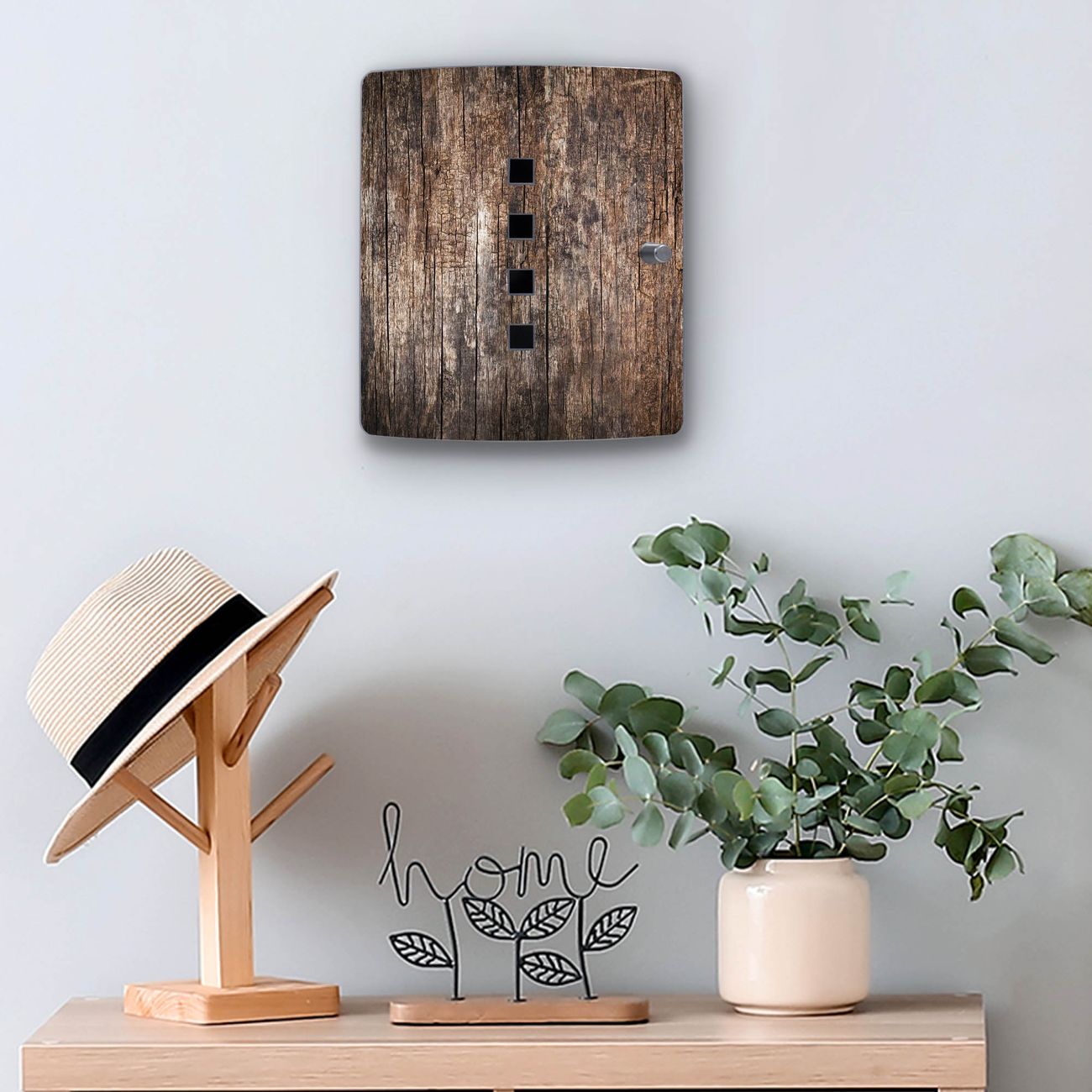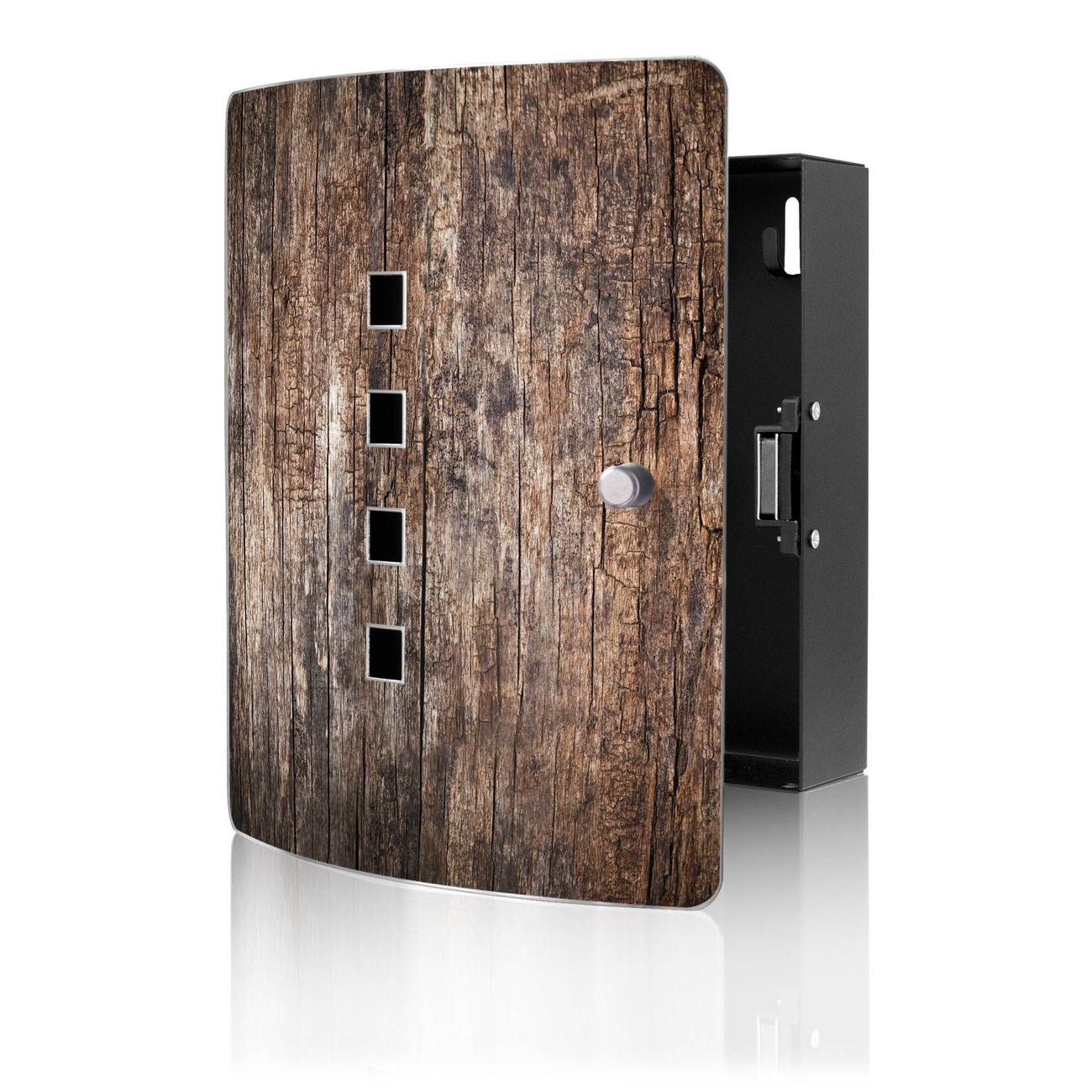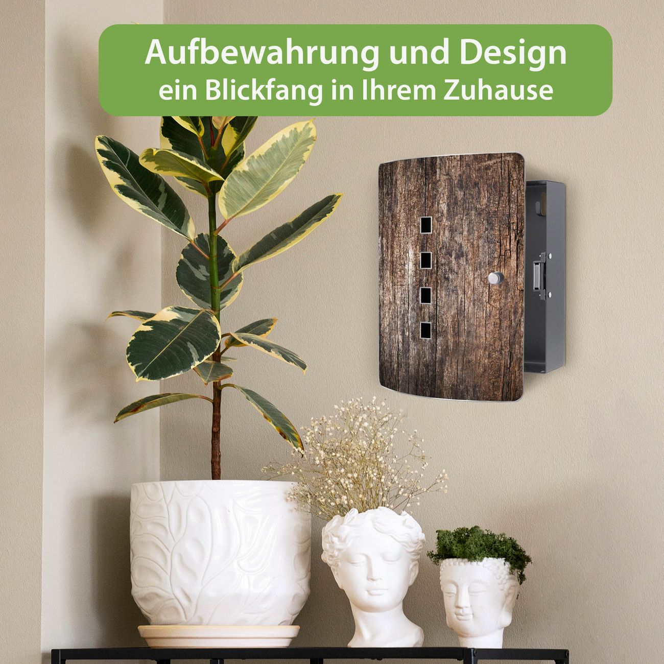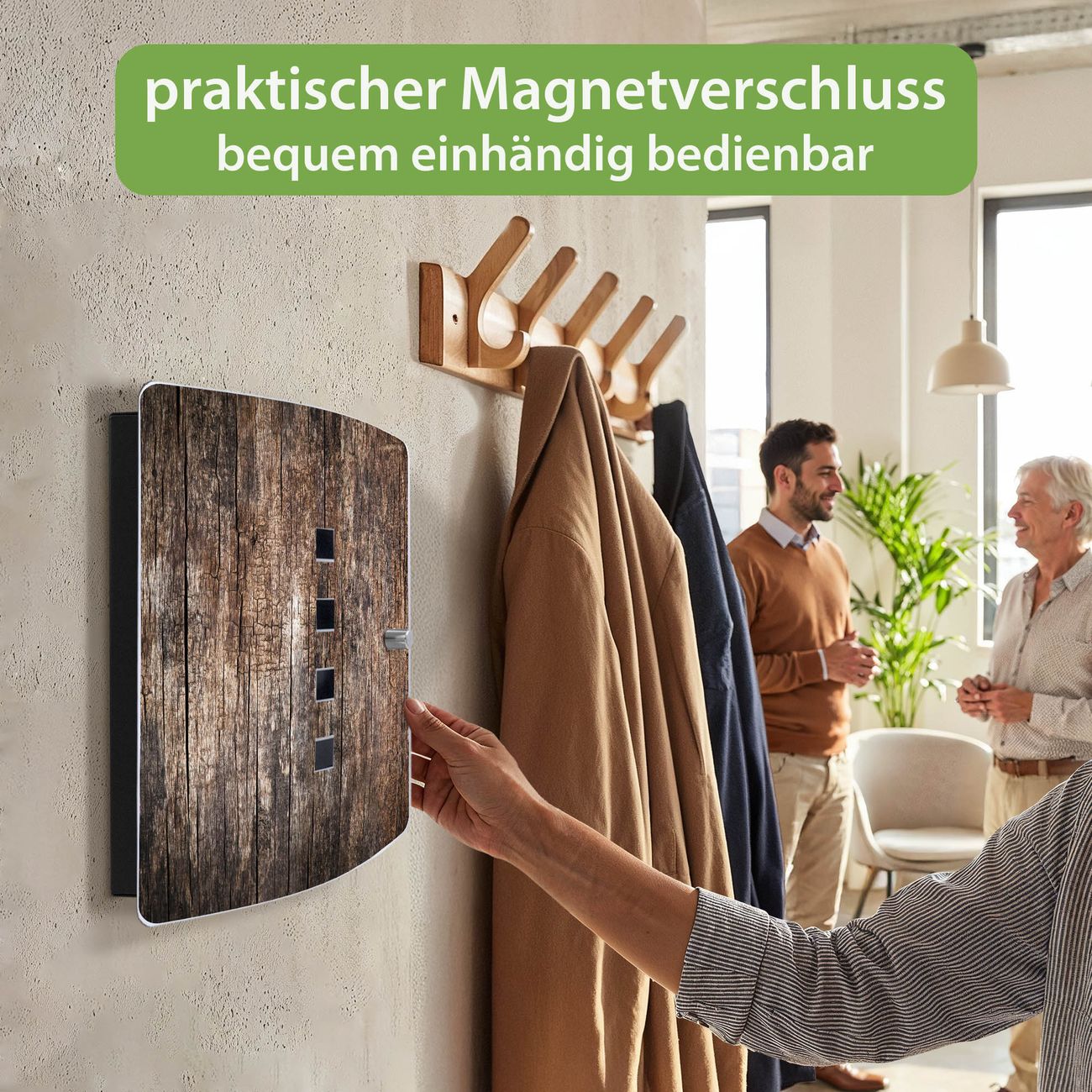 Funktion / Nutzen: Die leicht geschwungene Edelstahltür ist mit einer hochwertigen Motivfolie und dem Motiv Motiv Altes Holz kaschiert. Ein praktischer Magnetverschluss ermöglicht Ihnen ein schnelles Öffnen und Schließen. Befestigt wird der Schlüsselkasten an 2 Stellen auf der Rückseite, passendes Montagematerial fügen wir bereits bei.