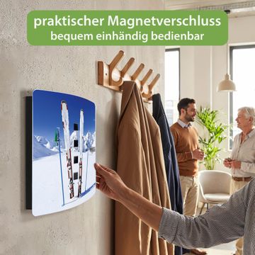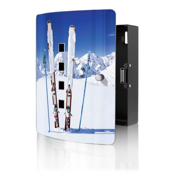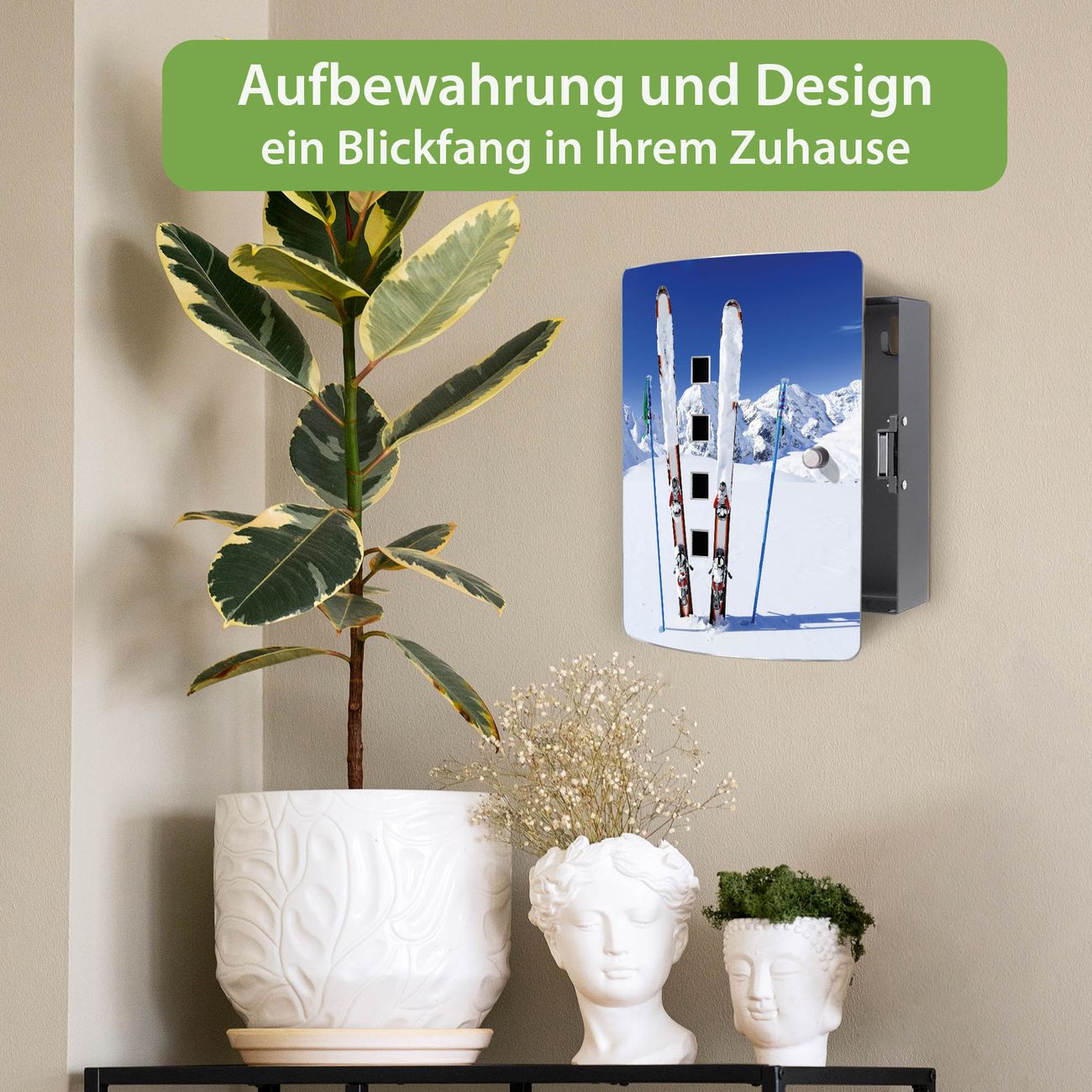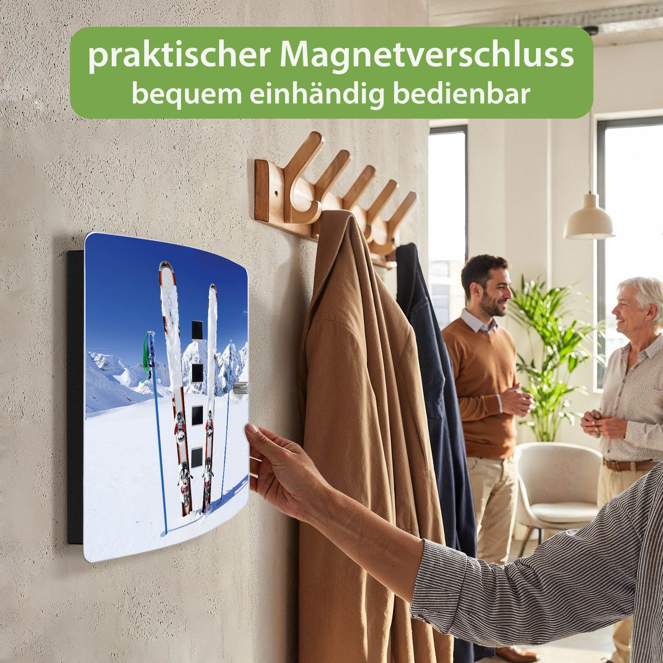 Funktion / Nutzen: Die leicht geschwungene Edelstahltür ist mit einer hochwertigen Motivfolie und dem Motiv Motiv Apres Ski kaschiert. Ein praktischer Magnetverschluss ermöglicht Ihnen ein schnelles Öffnen und Schließen. Befestigt wird der Schlüsselkasten an 2 Stellen auf der Rückseite, passendes Montagematerial fügen wir bereits bei.