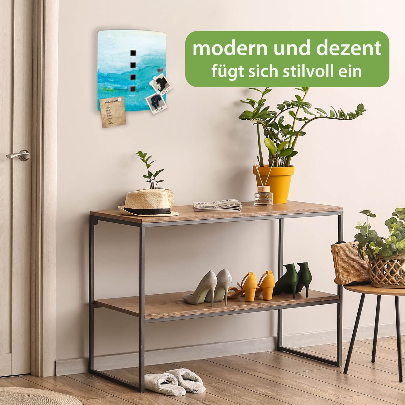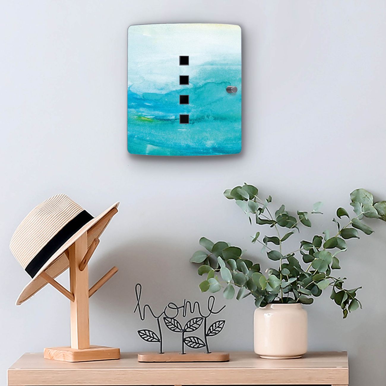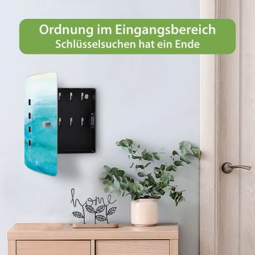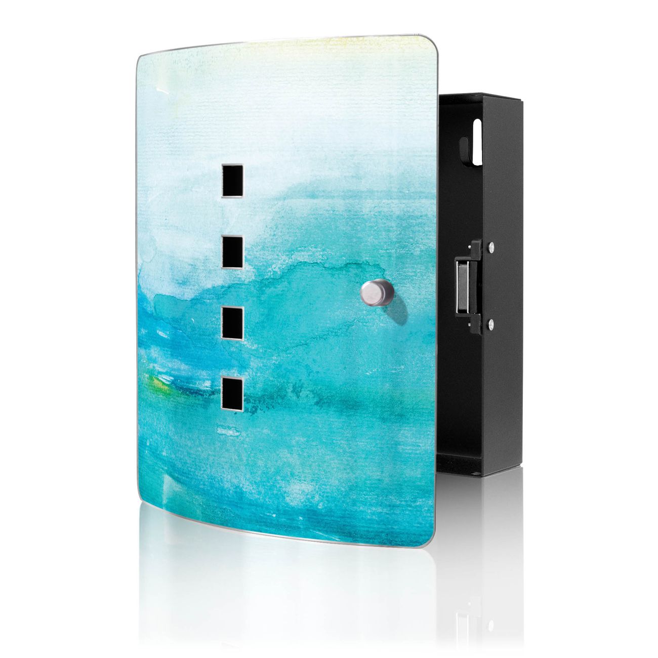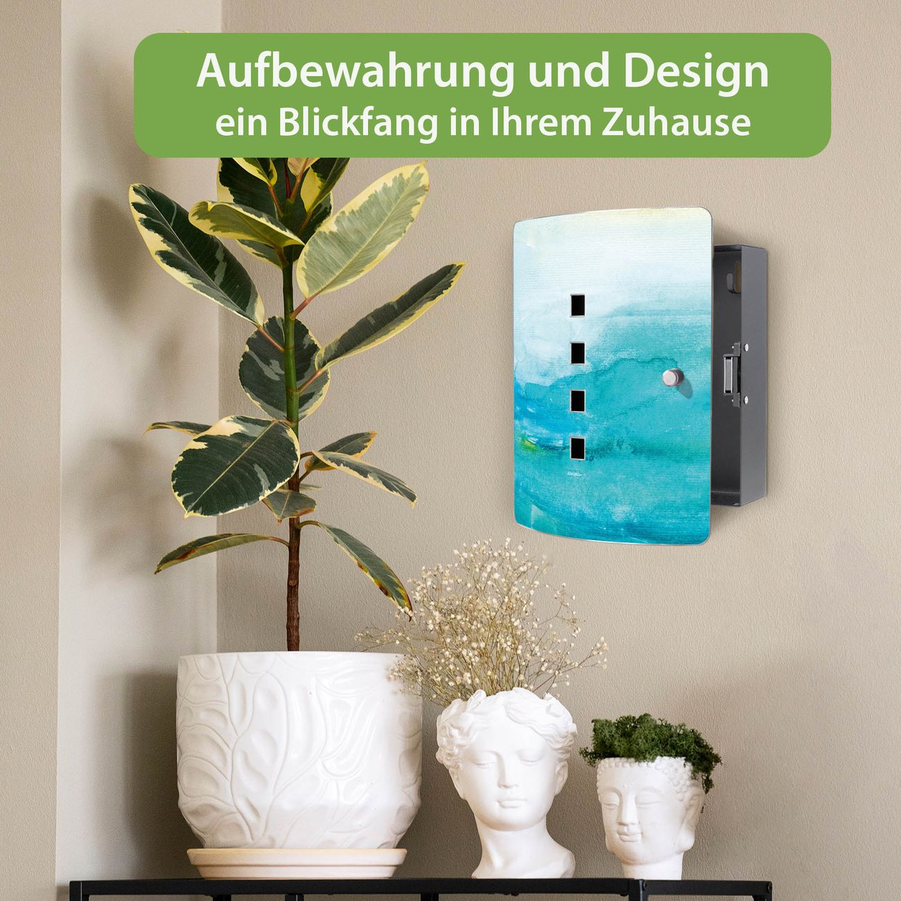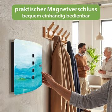 Funktion / Nutzen: Die leicht geschwungene Edelstahltür ist mit einer hochwertigen Motivfolie und dem Motiv Motiv Aquarell Blau kaschiert. Ein praktischer Magnetverschluss ermöglicht Ihnen ein schnelles Öffnen und Schließen. Befestigt wird der Schlüsselkasten an 2 Stellen auf der Rückseite, passendes Montagematerial fügen wir bereits bei.