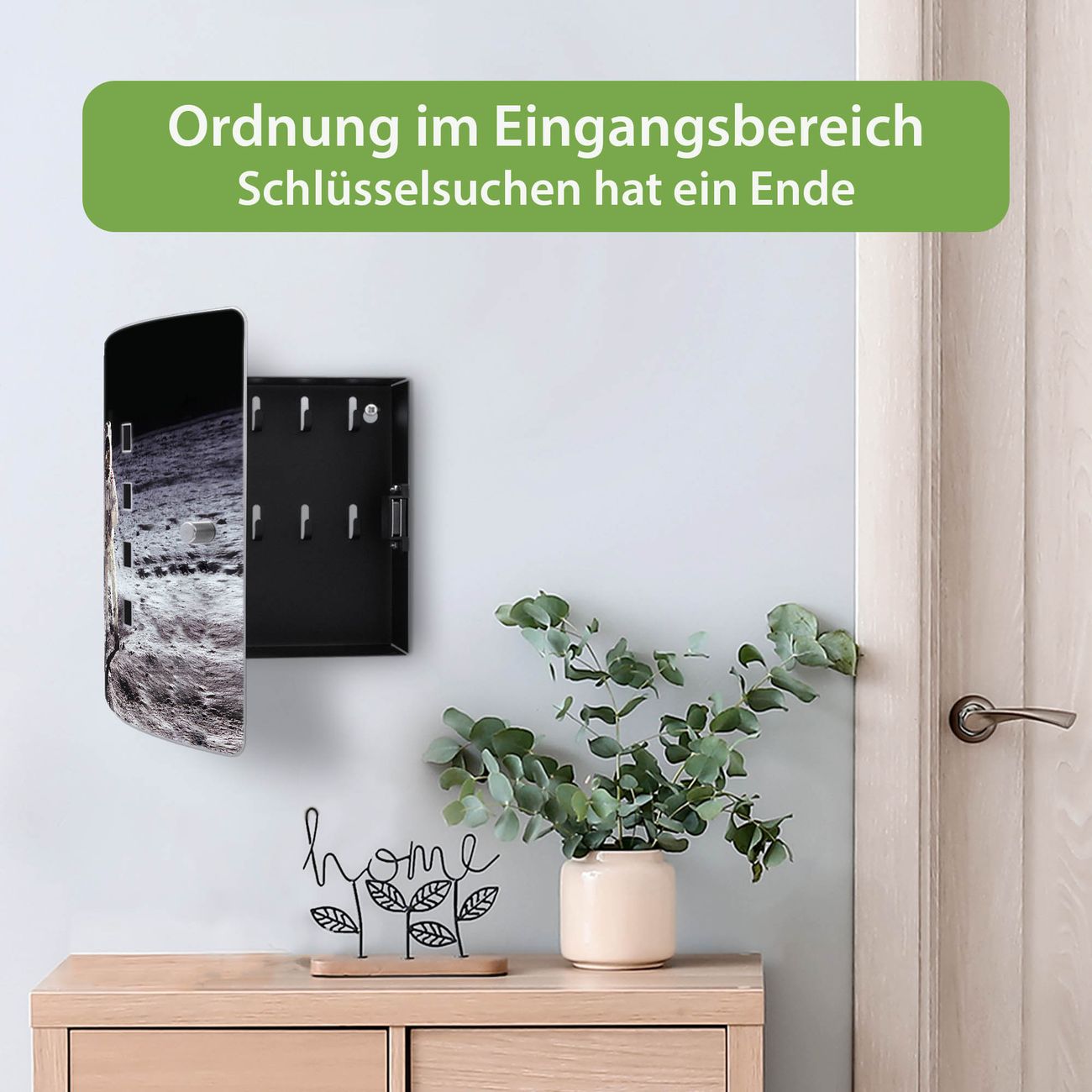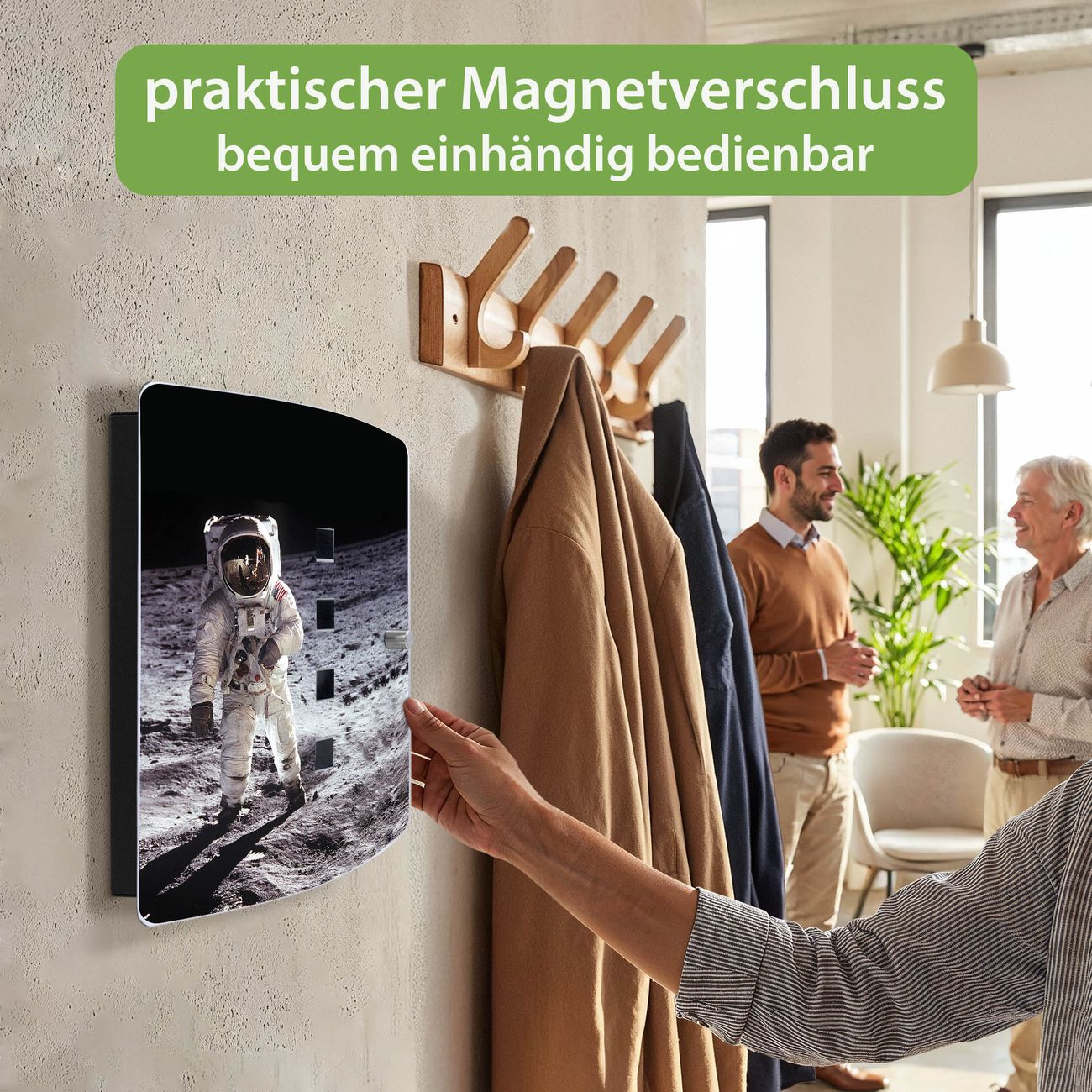 Funktion / Nutzen: Die leicht geschwungene Edelstahltür ist mit einer hochwertigen Motivfolie und dem Motiv Motiv Astronaut kaschiert. Ein praktischer Magnetverschluss ermöglicht Ihnen ein schnelles Öffnen und Schließen. Befestigt wird der Schlüsselkasten an 2 Stellen auf der Rückseite, passendes Montagematerial fügen wir bereits bei.