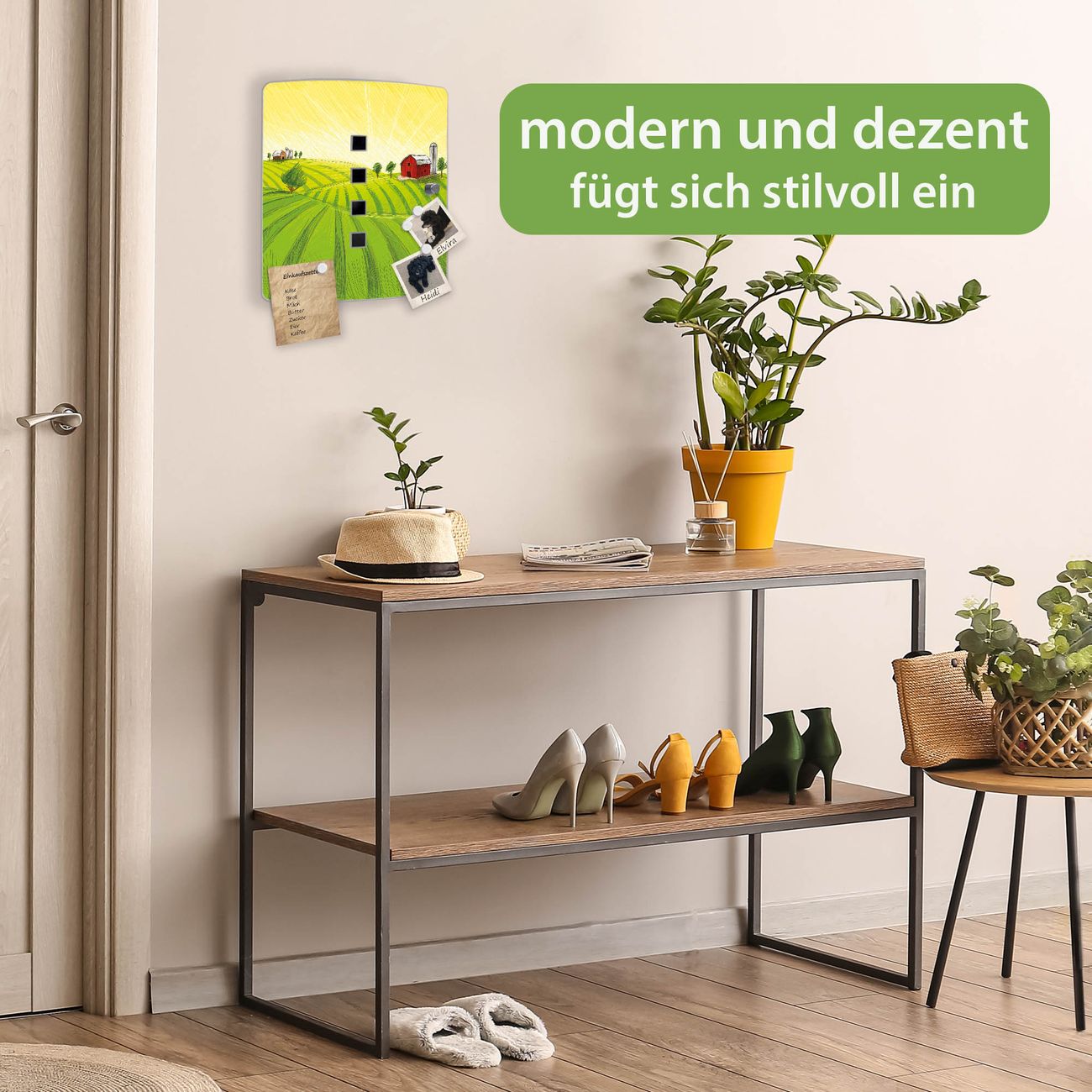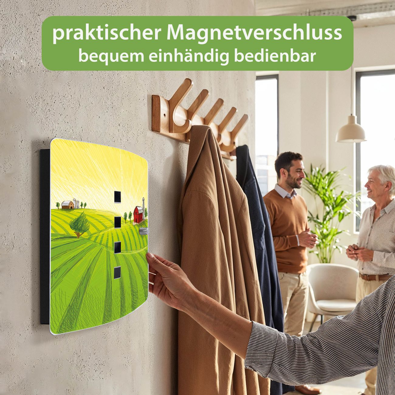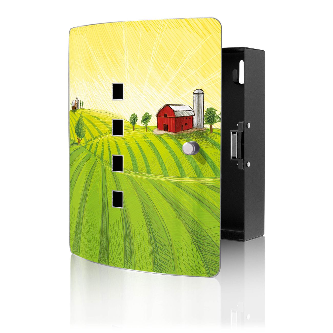 Funktion / Nutzen: Die leicht geschwungene Edelstahltür ist mit einer hochwertigen Motivfolie und dem Motiv Motiv Auf dem Land kaschiert. Ein praktischer Magnetverschluss ermöglicht Ihnen ein schnelles Öffnen und Schließen. Befestigt wird der Schlüsselkasten an 2 Stellen auf der Rückseite, passendes Montagematerial fügen wir bereits bei.
