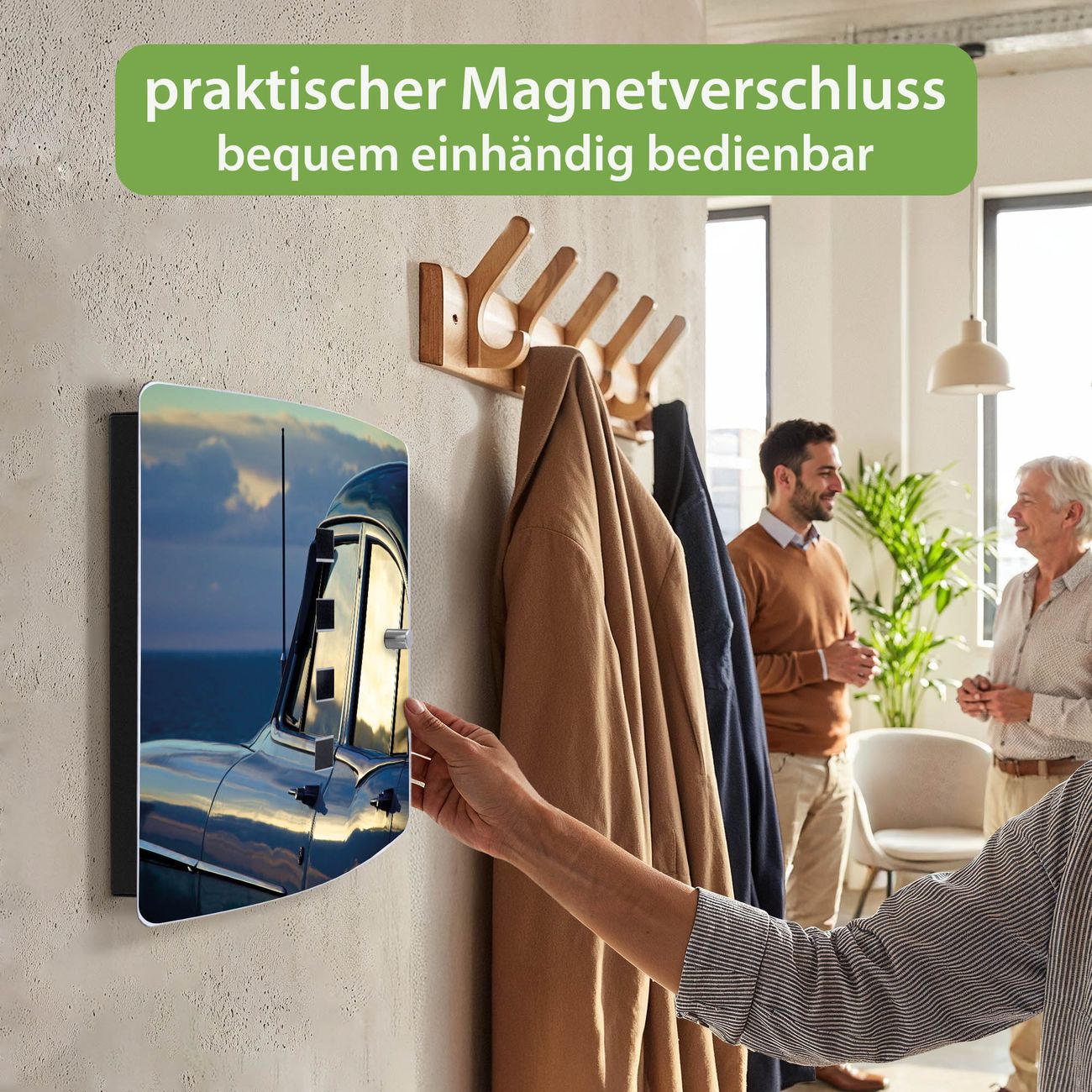 Funktion / Nutzen: Die leicht geschwungene Edelstahltür ist mit einer hochwertigen Motivfolie und dem Motiv Motiv Auto am Strand kaschiert. Ein praktischer Magnetverschluss ermöglicht Ihnen ein schnelles Öffnen und Schließen. Befestigt wird der Schlüsselkasten an 2 Stellen auf der Rückseite, passendes Montagematerial fügen wir bereits bei.