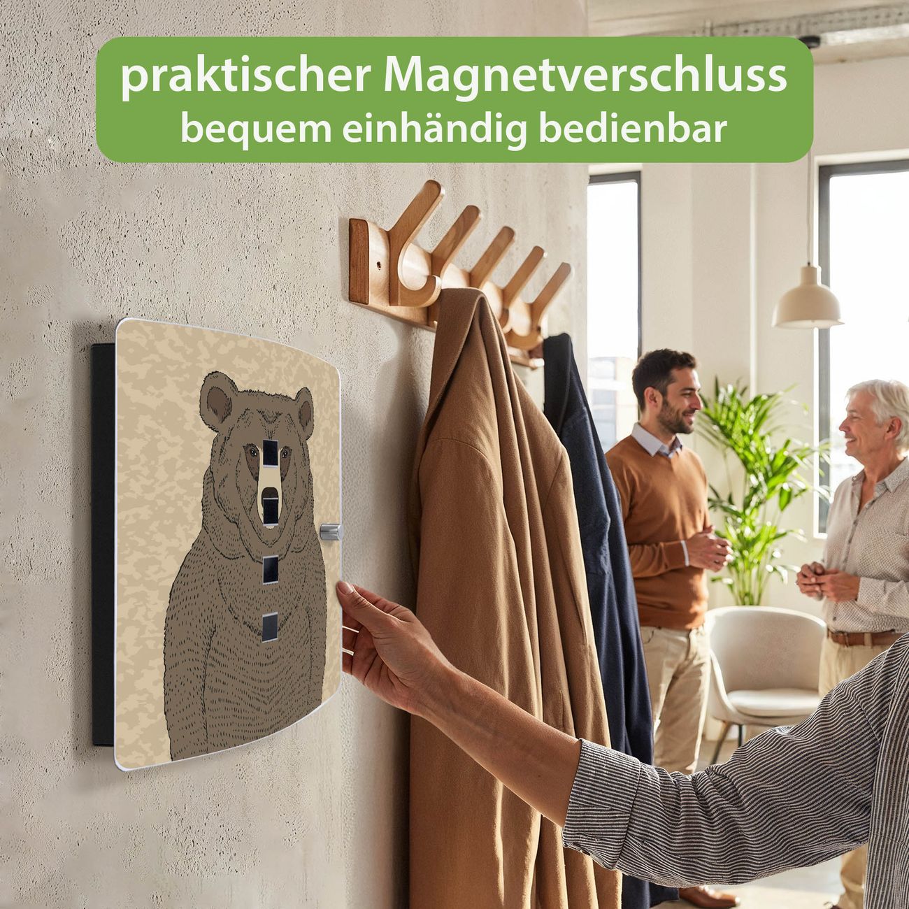 Funktion / Nutzen: Die leicht geschwungene Edelstahltür ist mit einer hochwertigen Motivfolie und dem Motiv Motiv Bär Ohne Brille kaschiert. Ein praktischer Magnetverschluss ermöglicht Ihnen ein schnelles Öffnen und Schließen. Befestigt wird der Schlüsselkasten an 2 Stellen auf der Rückseite, passendes Montagematerial fügen wir bereits bei.