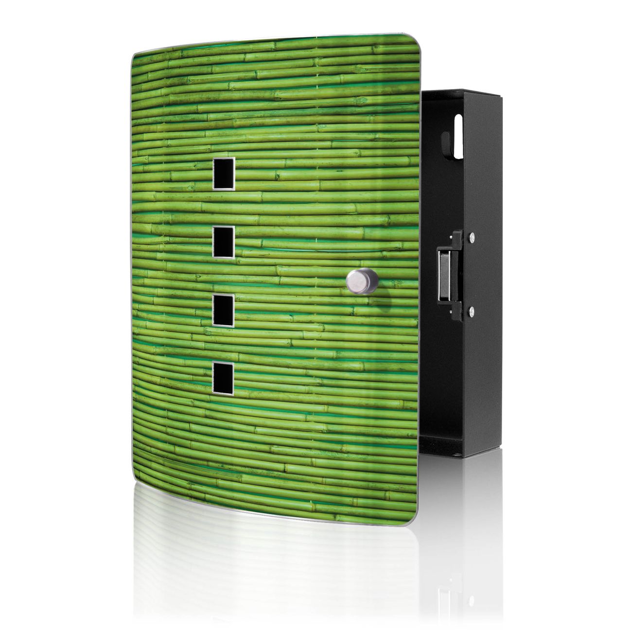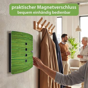 Funktion / Nutzen: Die leicht geschwungene Edelstahltür ist mit einer hochwertigen Motivfolie und dem Motiv Motiv Bambus Grün kaschiert. Ein praktischer Magnetverschluss ermöglicht Ihnen ein schnelles Öffnen und Schließen. Befestigt wird der Schlüsselkasten an 2 Stellen auf der Rückseite, passendes Montagematerial fügen wir bereits bei.