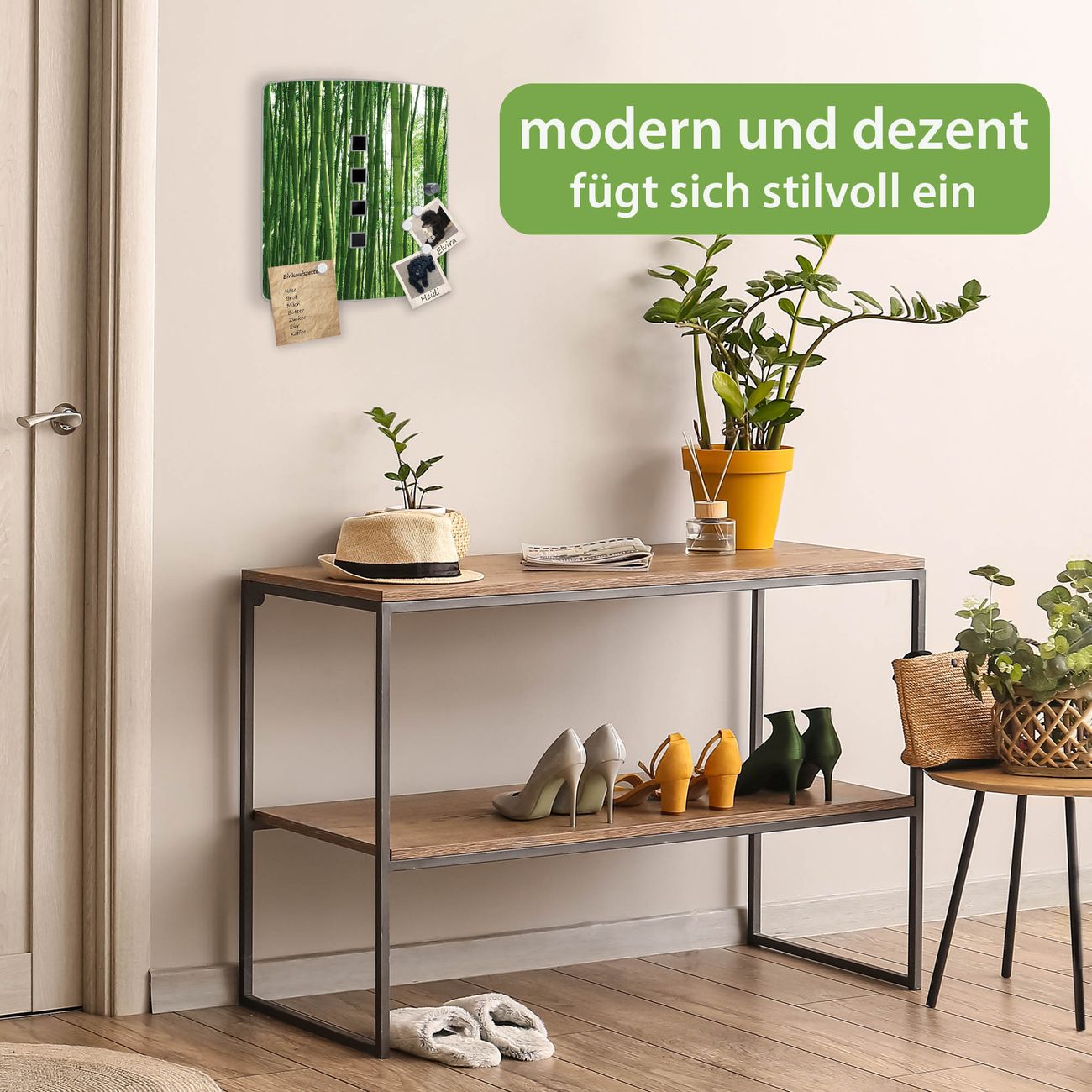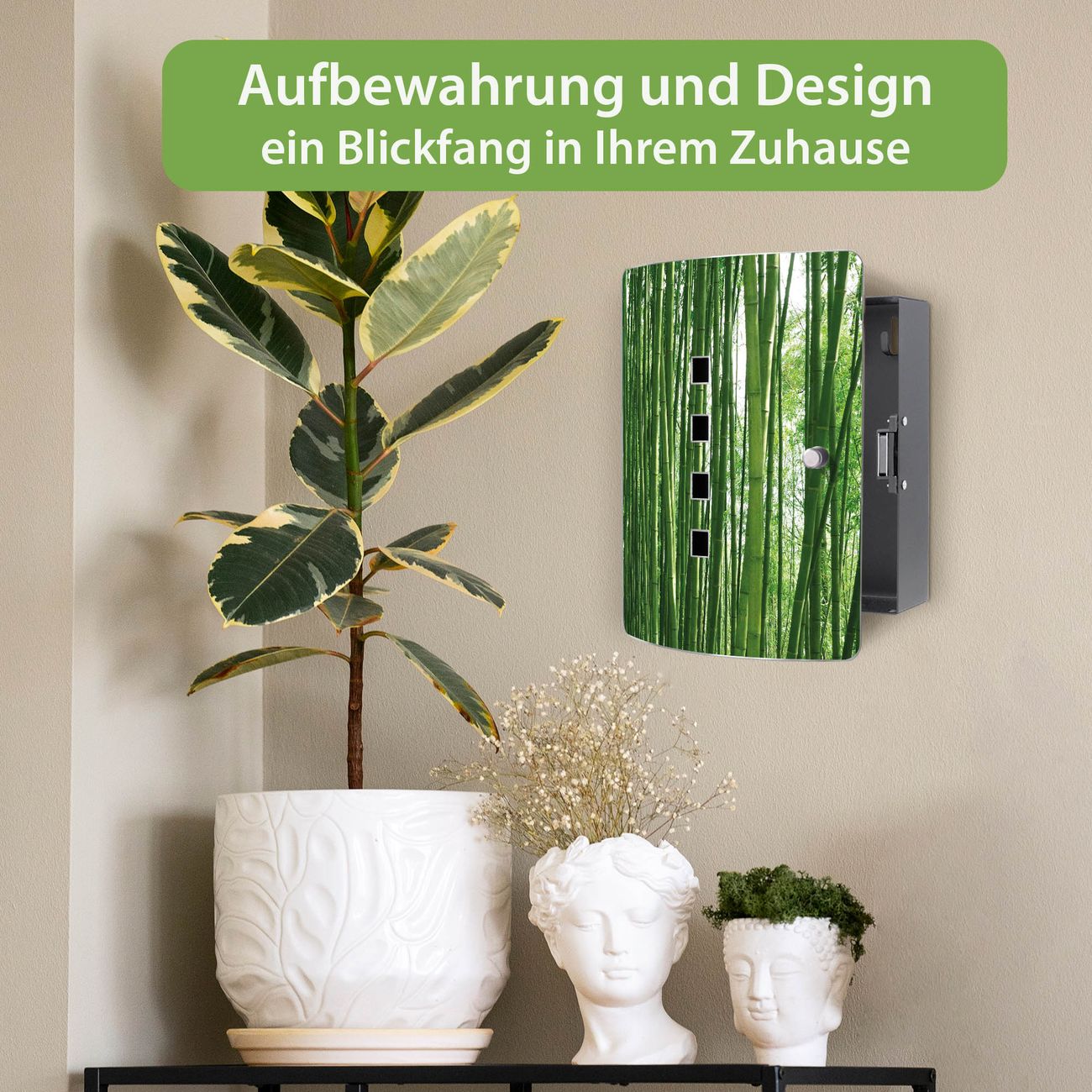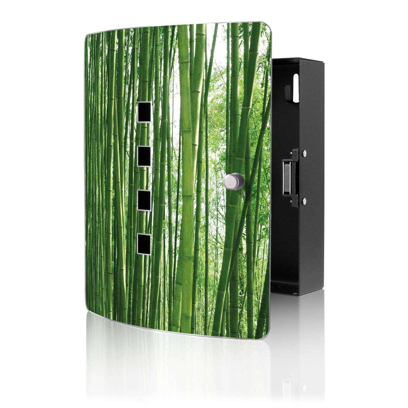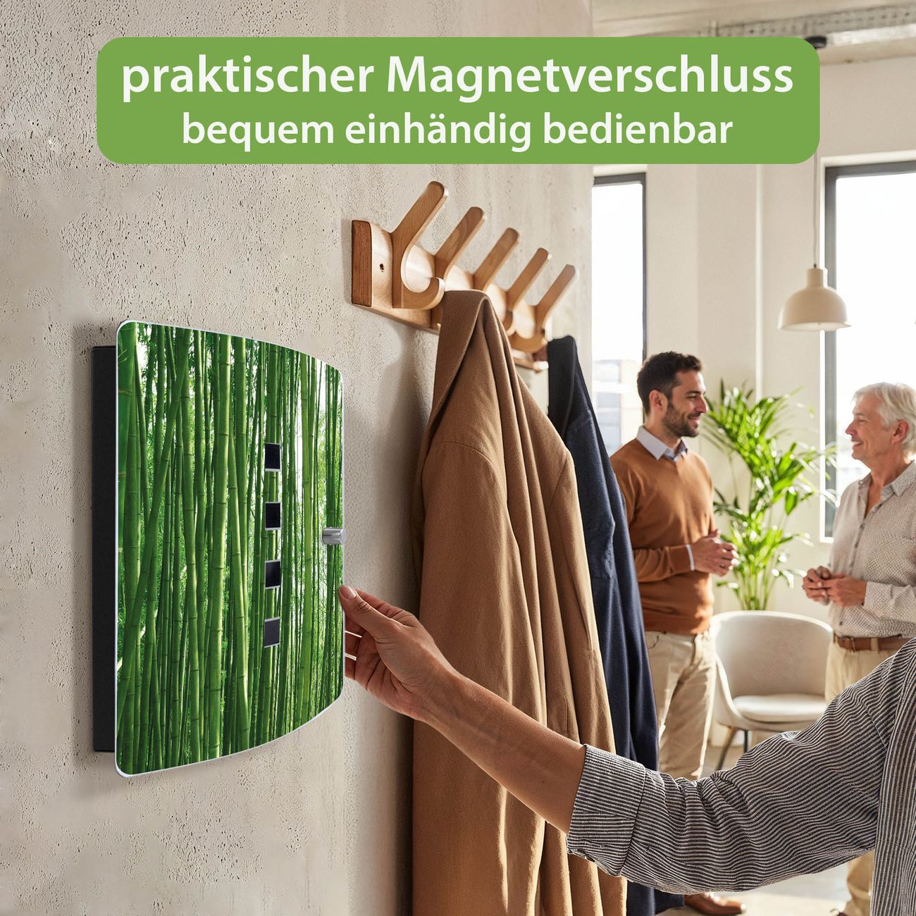 Funktion / Nutzen: Die leicht geschwungene Edelstahltür ist mit einer hochwertigen Motivfolie und dem Motiv Motiv Bambus kaschiert. Ein praktischer Magnetverschluss ermöglicht Ihnen ein schnelles Öffnen und Schließen. Befestigt wird der Schlüsselkasten an 2 Stellen auf der Rückseite, passendes Montagematerial fügen wir bereits bei.