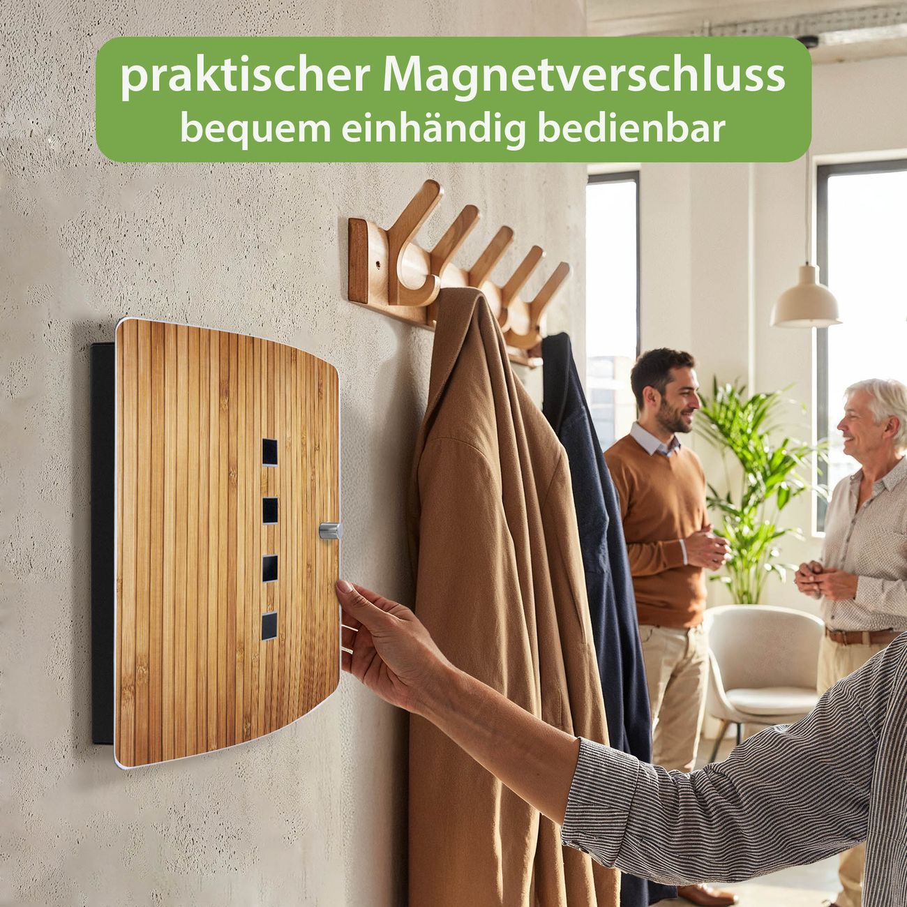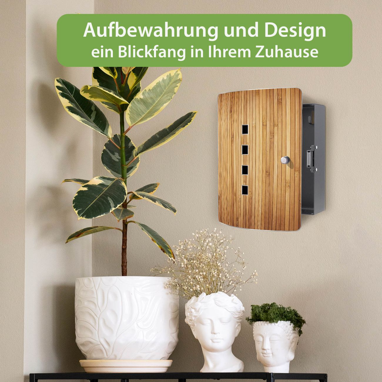 Funktion / Nutzen: Die leicht geschwungene Edelstahltür ist mit einer hochwertigen Motivfolie und dem Motiv Motiv Bambusholz kaschiert. Ein praktischer Magnetverschluss ermöglicht Ihnen ein schnelles Öffnen und Schließen. Befestigt wird der Schlüsselkasten an 2 Stellen auf der Rückseite, passendes Montagematerial fügen wir bereits bei.
