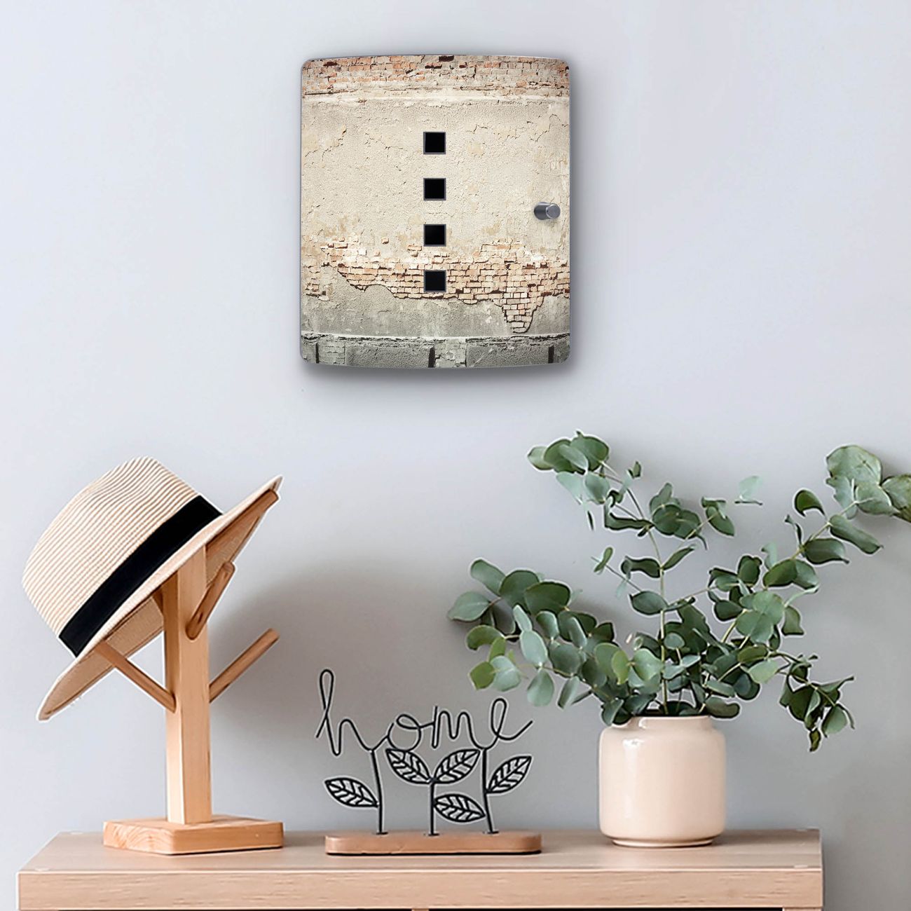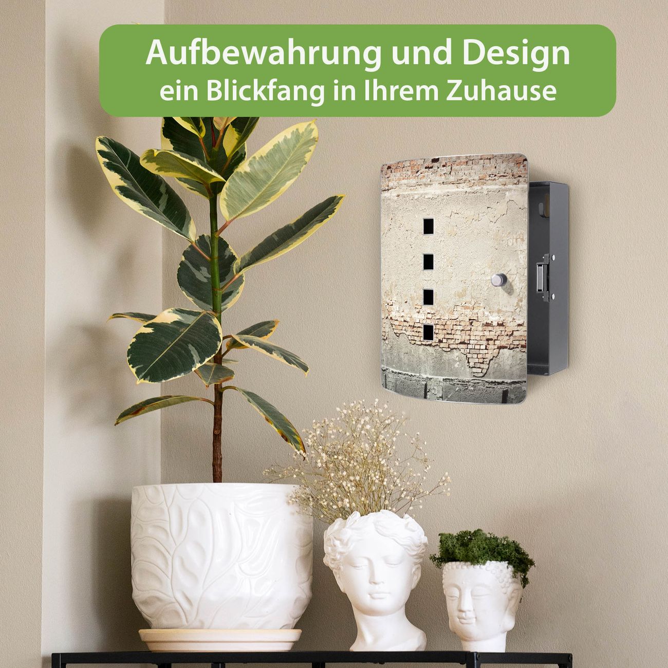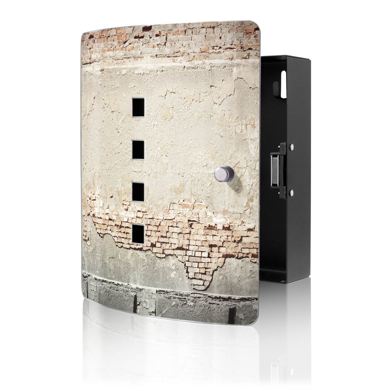 Funktion / Nutzen: Die leicht geschwungene Edelstahltür ist mit einer hochwertigen Motivfolie und dem Motiv Motiv Baulücke kaschiert. Ein praktischer Magnetverschluss ermöglicht Ihnen ein schnelles Öffnen und Schließen. Befestigt wird der Schlüsselkasten an 2 Stellen auf der Rückseite, passendes Montagematerial fügen wir bereits bei.