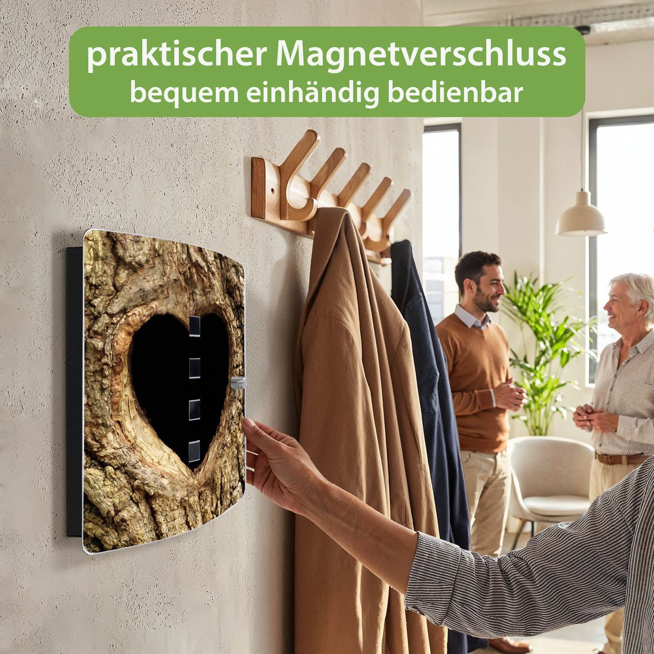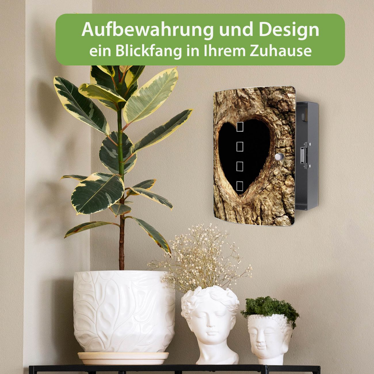 Funktion / Nutzen: Die leicht geschwungene Edelstahltür ist mit einer hochwertigen Motivfolie und dem Motiv Motiv Baumherz kaschiert. Ein praktischer Magnetverschluss ermöglicht Ihnen ein schnelles Öffnen und Schließen. Befestigt wird der Schlüsselkasten an 2 Stellen auf der Rückseite, passendes Montagematerial fügen wir bereits bei.