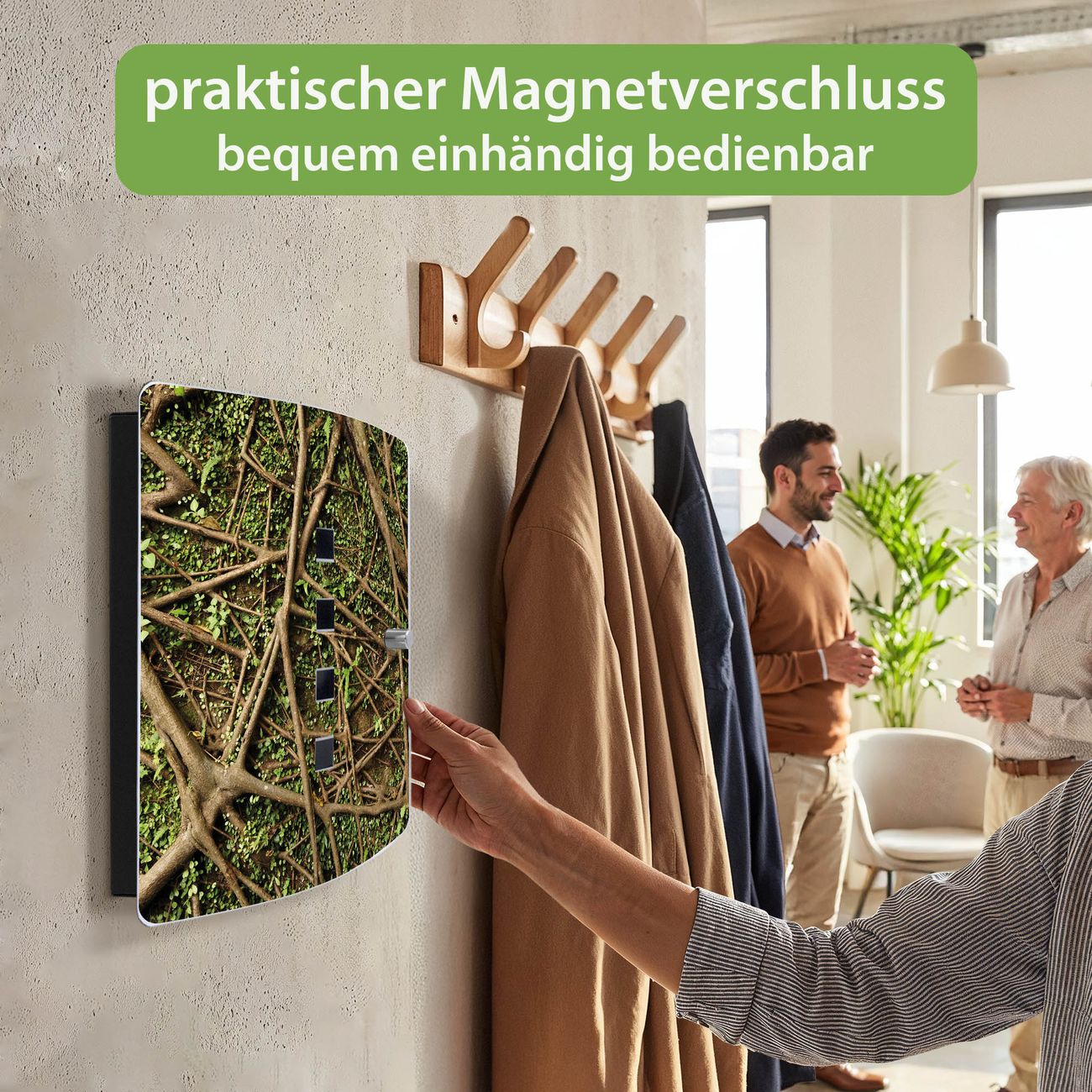 Funktion / Nutzen: Die leicht geschwungene Edelstahltür ist mit einer hochwertigen Motivfolie und dem Motiv Motiv Baumwurzel kaschiert. Ein praktischer Magnetverschluss ermöglicht Ihnen ein schnelles Öffnen und Schließen. Befestigt wird der Schlüsselkasten an 2 Stellen auf der Rückseite, passendes Montagematerial fügen wir bereits bei.