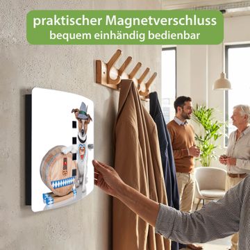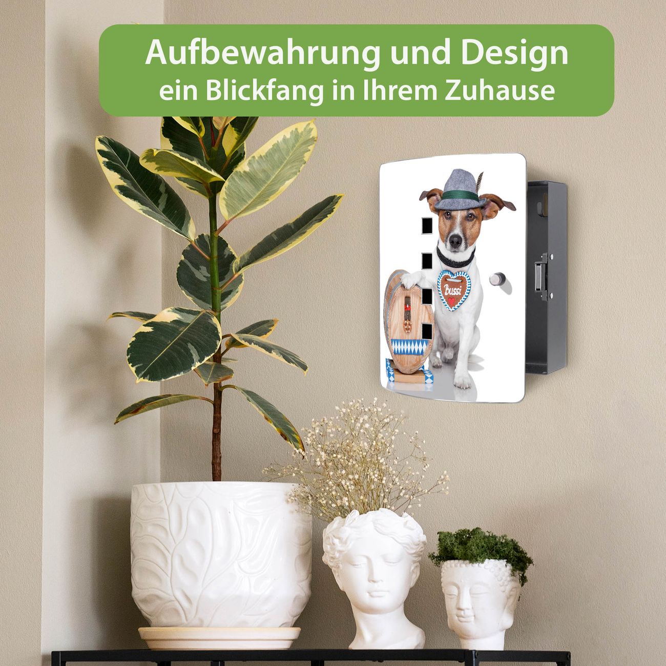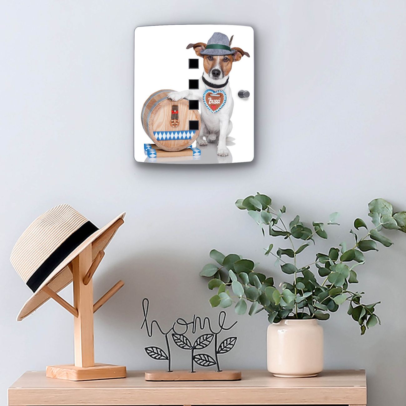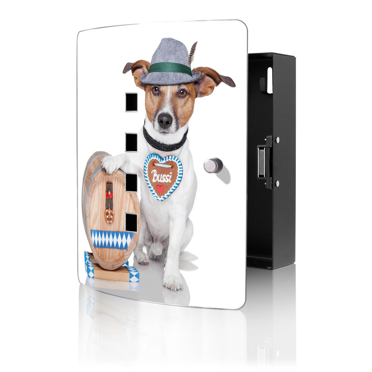 Funktion / Nutzen: Die leicht geschwungene Edelstahltür ist mit einer hochwertigen Motivfolie und dem Motiv Motiv Bayer Jack Russel kaschiert. Ein praktischer Magnetverschluss ermöglicht Ihnen ein schnelles Öffnen und Schließen. Befestigt wird der Schlüsselkasten an 2 Stellen auf der Rückseite, passendes Montagematerial fügen wir bereits bei.