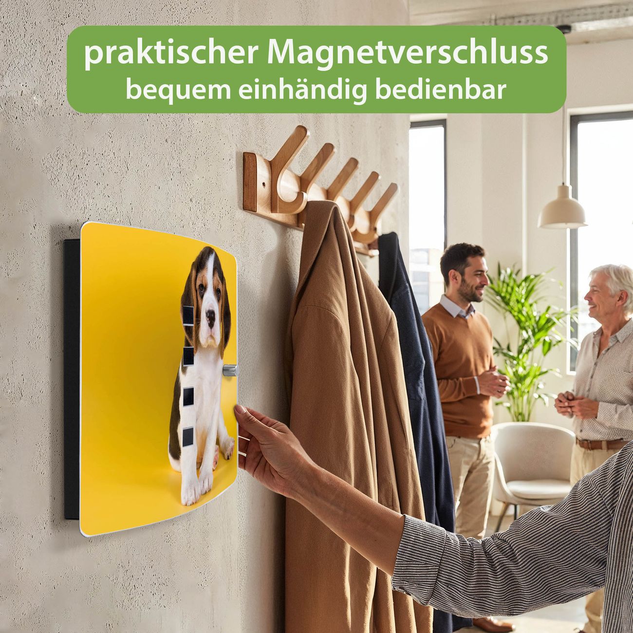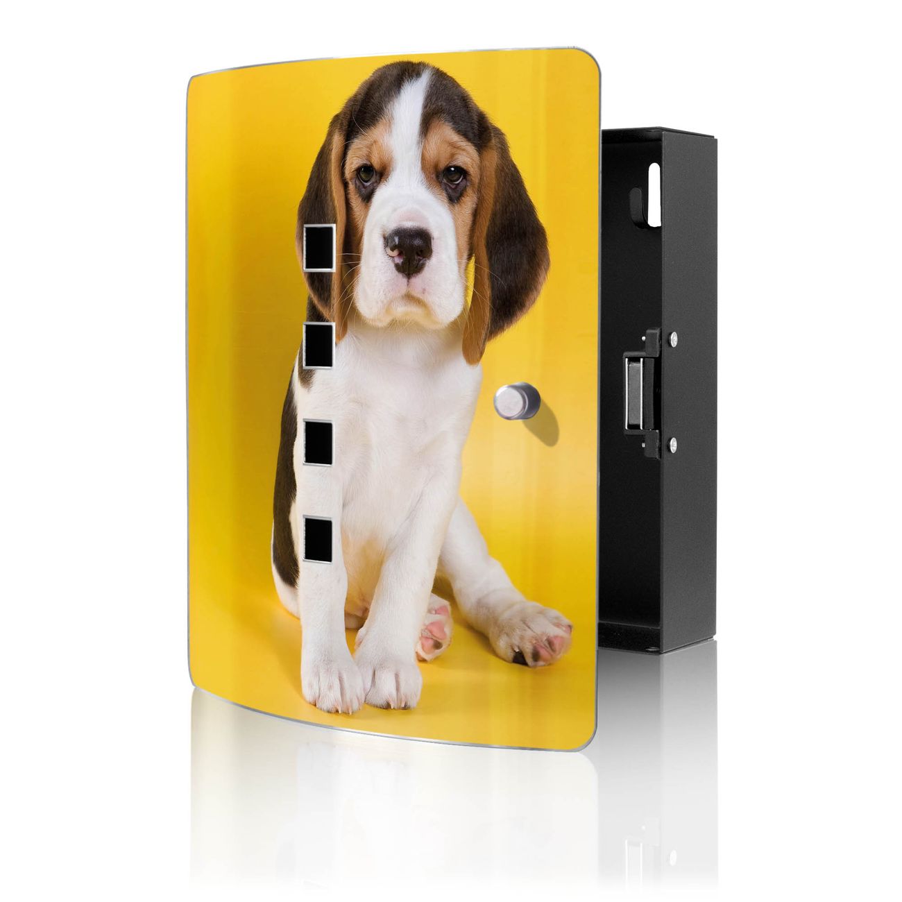 Funktion / Nutzen: Die leicht geschwungene Edelstahltür ist mit einer hochwertigen Motivfolie und dem Motiv Motiv Beagle kaschiert. Ein praktischer Magnetverschluss ermöglicht Ihnen ein schnelles Öffnen und Schließen. Befestigt wird der Schlüsselkasten an 2 Stellen auf der Rückseite, passendes Montagematerial fügen wir bereits bei.