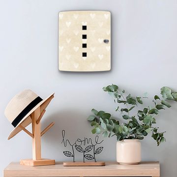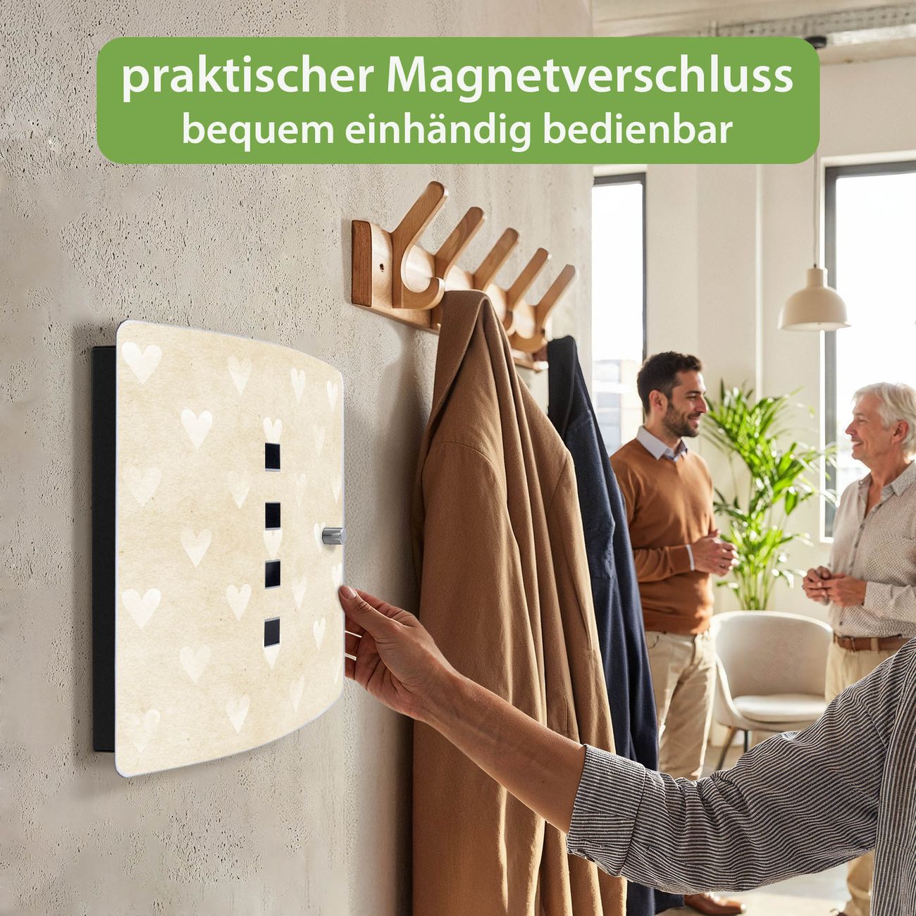 Funktion / Nutzen: Die leicht geschwungene Edelstahltür ist mit einer hochwertigen Motivfolie und dem Motiv Motiv Beige Herzen kaschiert. Ein praktischer Magnetverschluss ermöglicht Ihnen ein schnelles Öffnen und Schließen. Befestigt wird der Schlüsselkasten an 2 Stellen auf der Rückseite, passendes Montagematerial fügen wir bereits bei.