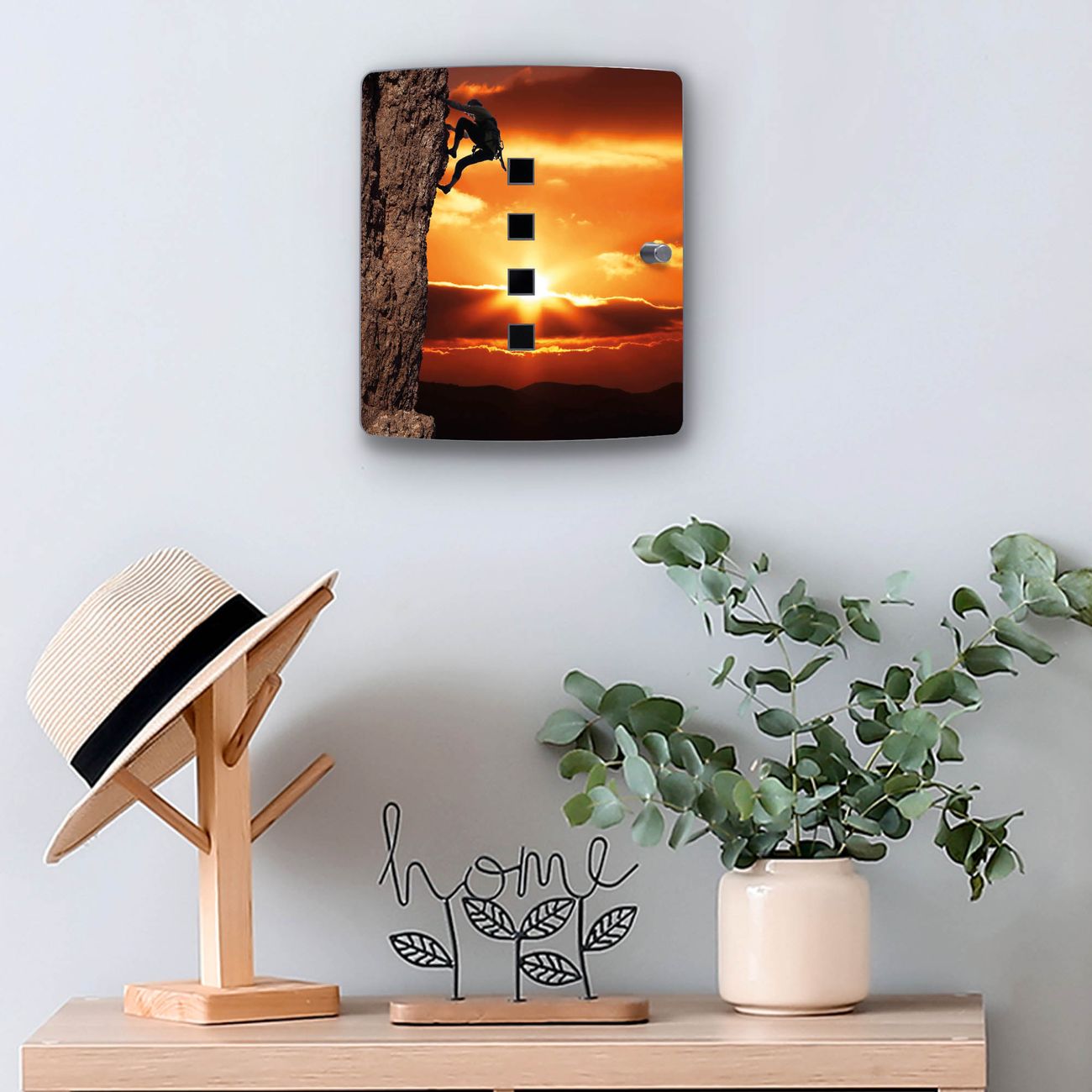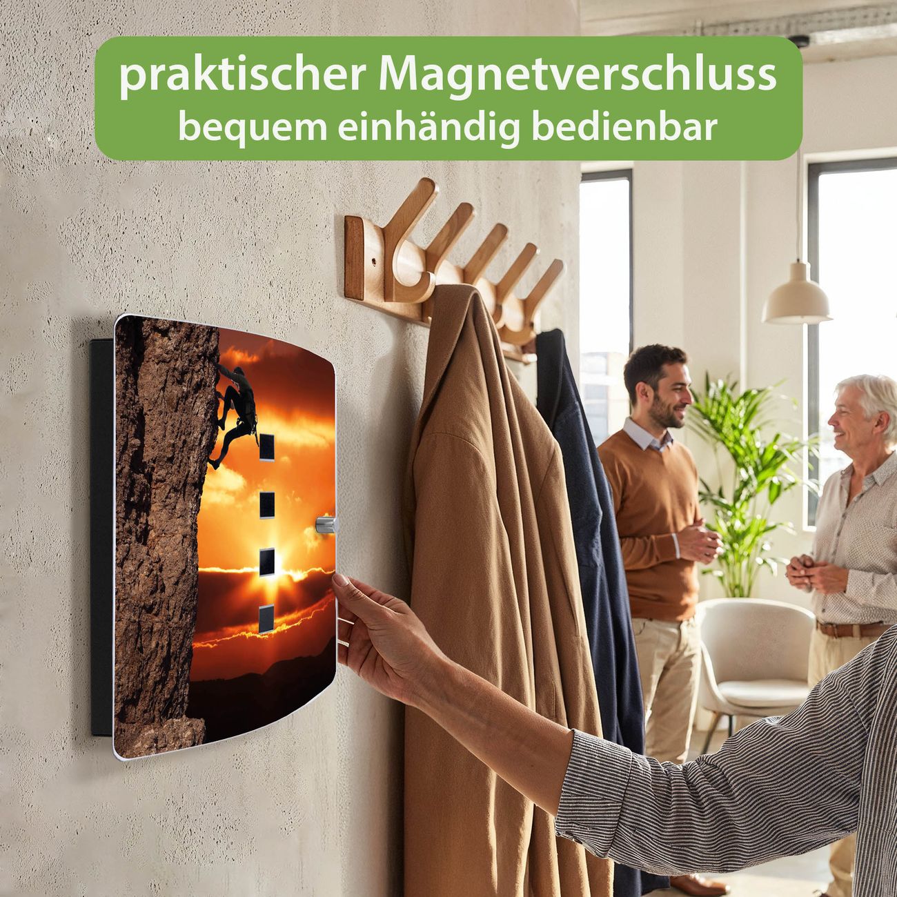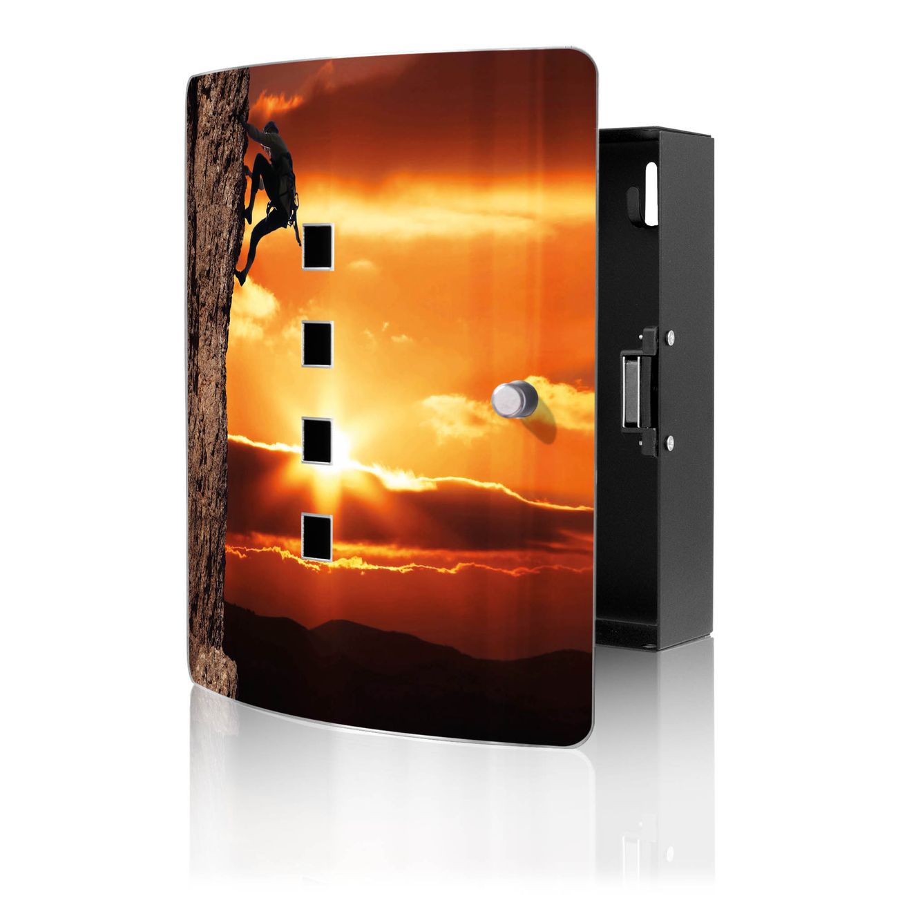 Funktion / Nutzen: Die leicht geschwungene Edelstahltür ist mit einer hochwertigen Motivfolie und dem Motiv Motiv Bergsteiger kaschiert. Ein praktischer Magnetverschluss ermöglicht Ihnen ein schnelles Öffnen und Schließen. Befestigt wird der Schlüsselkasten an 2 Stellen auf der Rückseite, passendes Montagematerial fügen wir bereits bei.