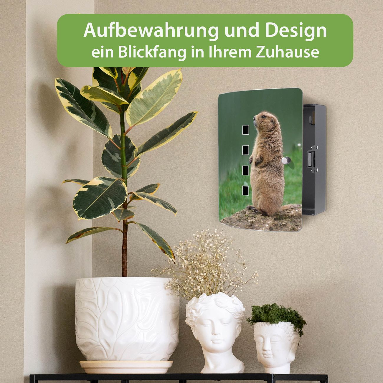 Funktion / Nutzen: Die leicht geschwungene Edelstahltür ist mit einer hochwertigen Motivfolie und dem Motiv Motiv Biber kaschiert. Ein praktischer Magnetverschluss ermöglicht Ihnen ein schnelles Öffnen und Schließen. Befestigt wird der Schlüsselkasten an 2 Stellen auf der Rückseite, passendes Montagematerial fügen wir bereits bei.