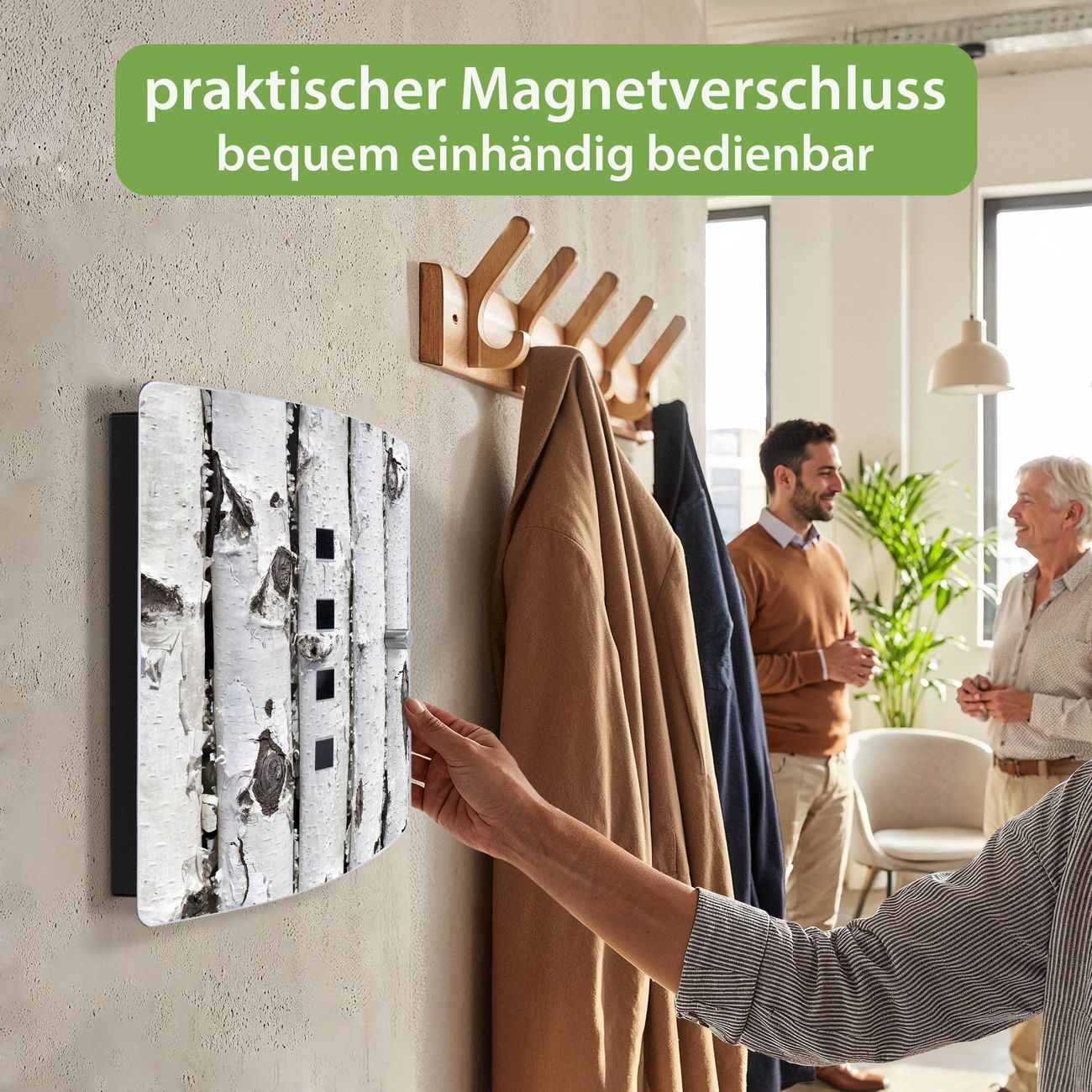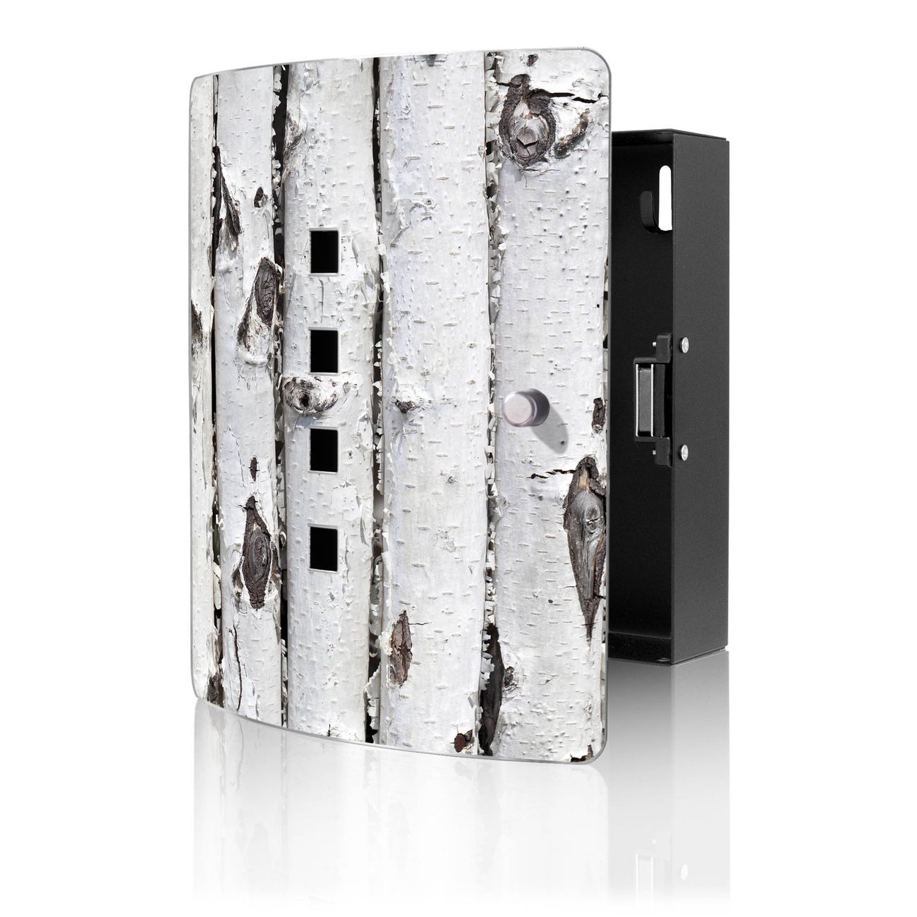 Funktion / Nutzen: Die leicht geschwungene Edelstahltür ist mit einer hochwertigen Motivfolie und dem Motiv Motiv Birkenrinde kaschiert. Ein praktischer Magnetverschluss ermöglicht Ihnen ein schnelles Öffnen und Schließen. Befestigt wird der Schlüsselkasten an 2 Stellen auf der Rückseite, passendes Montagematerial fügen wir bereits bei.
