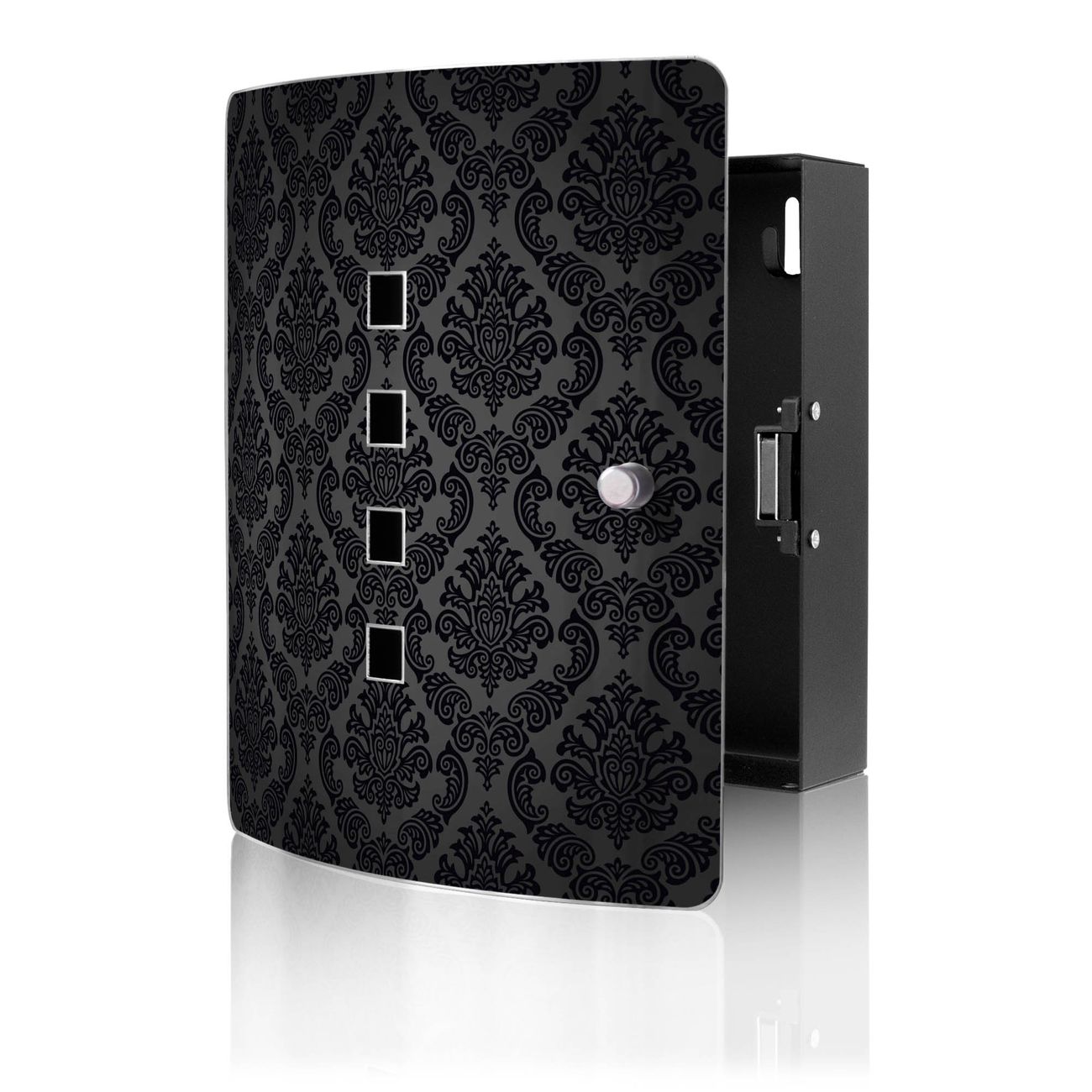Funktion / Nutzen: Die leicht geschwungene Edelstahltür ist mit einer hochwertigen Motivfolie und dem Motiv Motiv Black Deluxe kaschiert. Ein praktischer Magnetverschluss ermöglicht Ihnen ein schnelles Öffnen und Schließen. Befestigt wird der Schlüsselkasten an 2 Stellen auf der Rückseite, passendes Montagematerial fügen wir bereits bei.