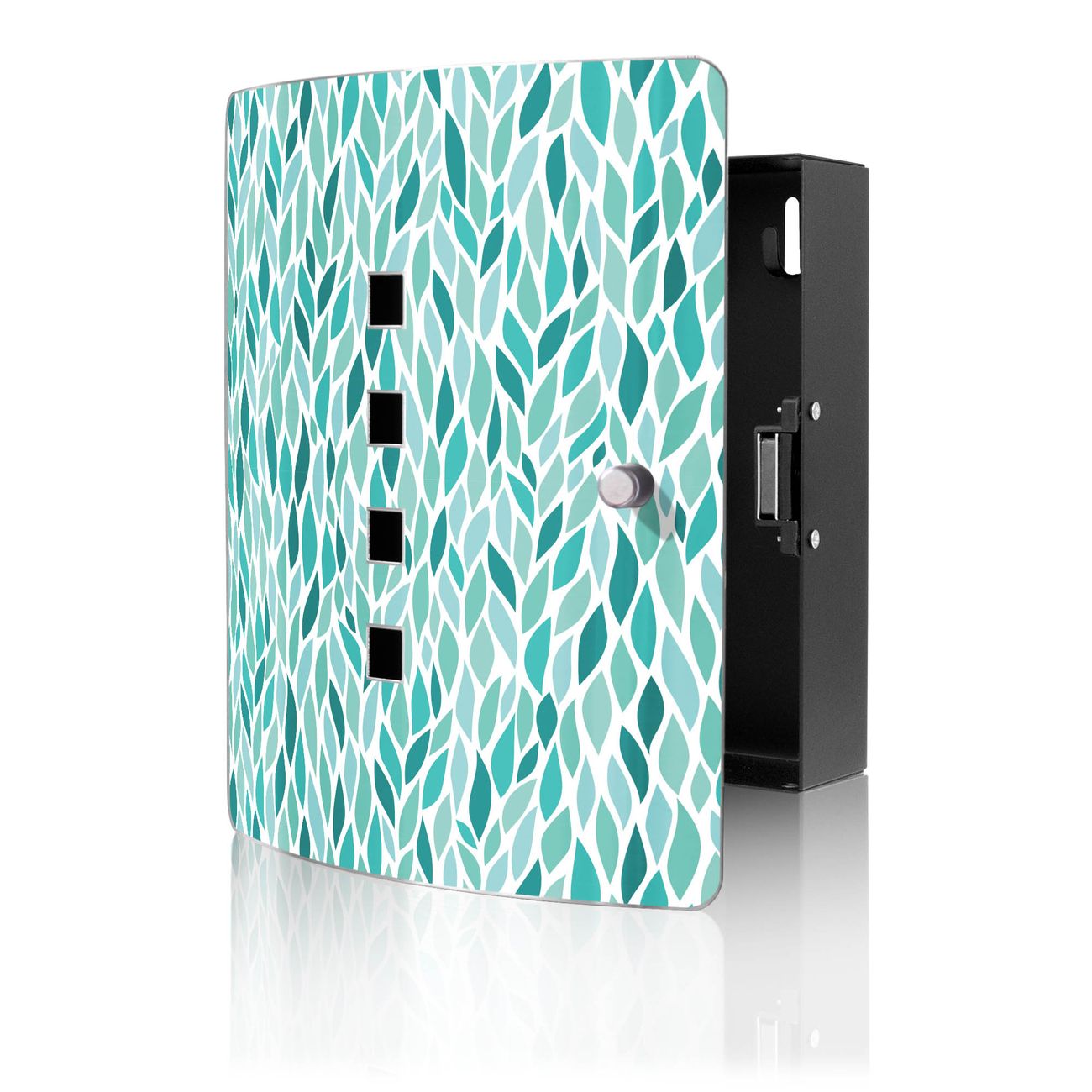 Funktion / Nutzen: Die leicht geschwungene Edelstahltür ist mit einer hochwertigen Motivfolie und dem Motiv Motiv Blätter Mint kaschiert. Ein praktischer Magnetverschluss ermöglicht Ihnen ein schnelles Öffnen und Schließen. Befestigt wird der Schlüsselkasten an 2 Stellen auf der Rückseite, passendes Montagematerial fügen wir bereits bei.