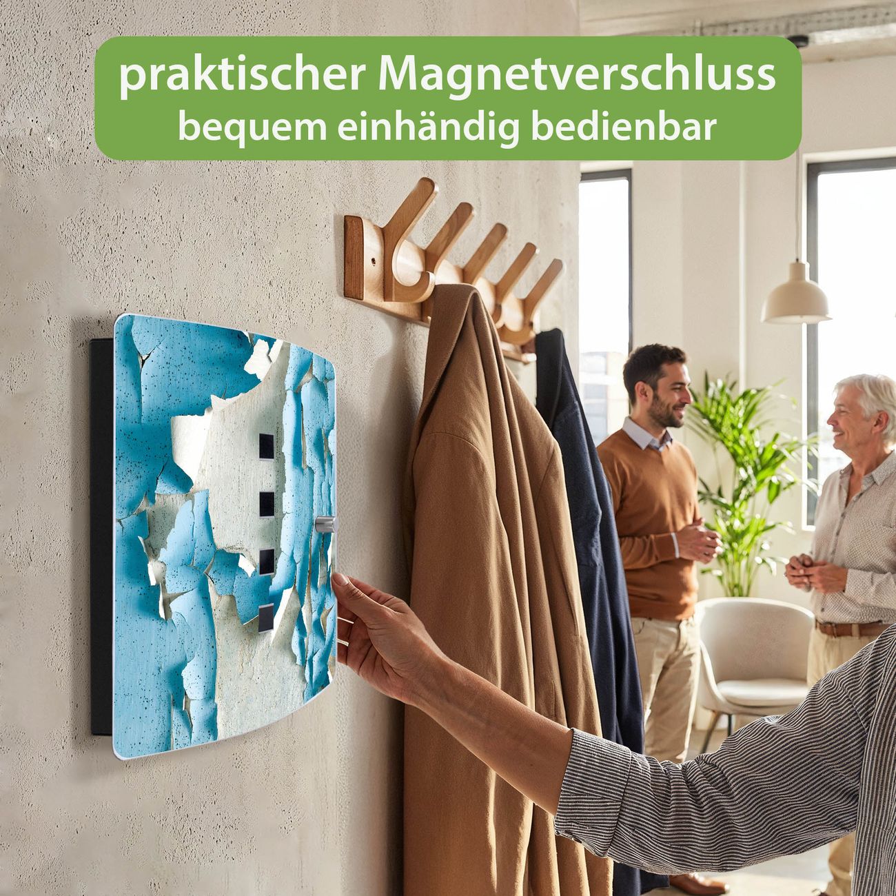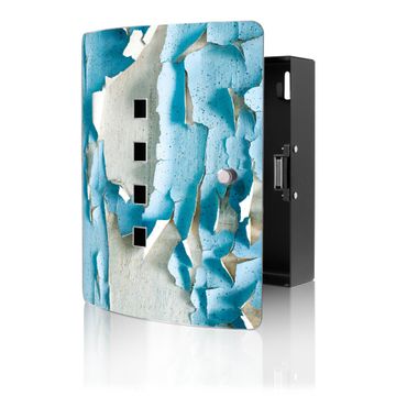 Funktion / Nutzen: Die leicht geschwungene Edelstahltür ist mit einer hochwertigen Motivfolie und dem Motiv Motiv Blätternde Farbe kaschiert. Ein praktischer Magnetverschluss ermöglicht Ihnen ein schnelles Öffnen und Schließen. Befestigt wird der Schlüsselkasten an 2 Stellen auf der Rückseite, passendes Montagematerial fügen wir bereits bei.