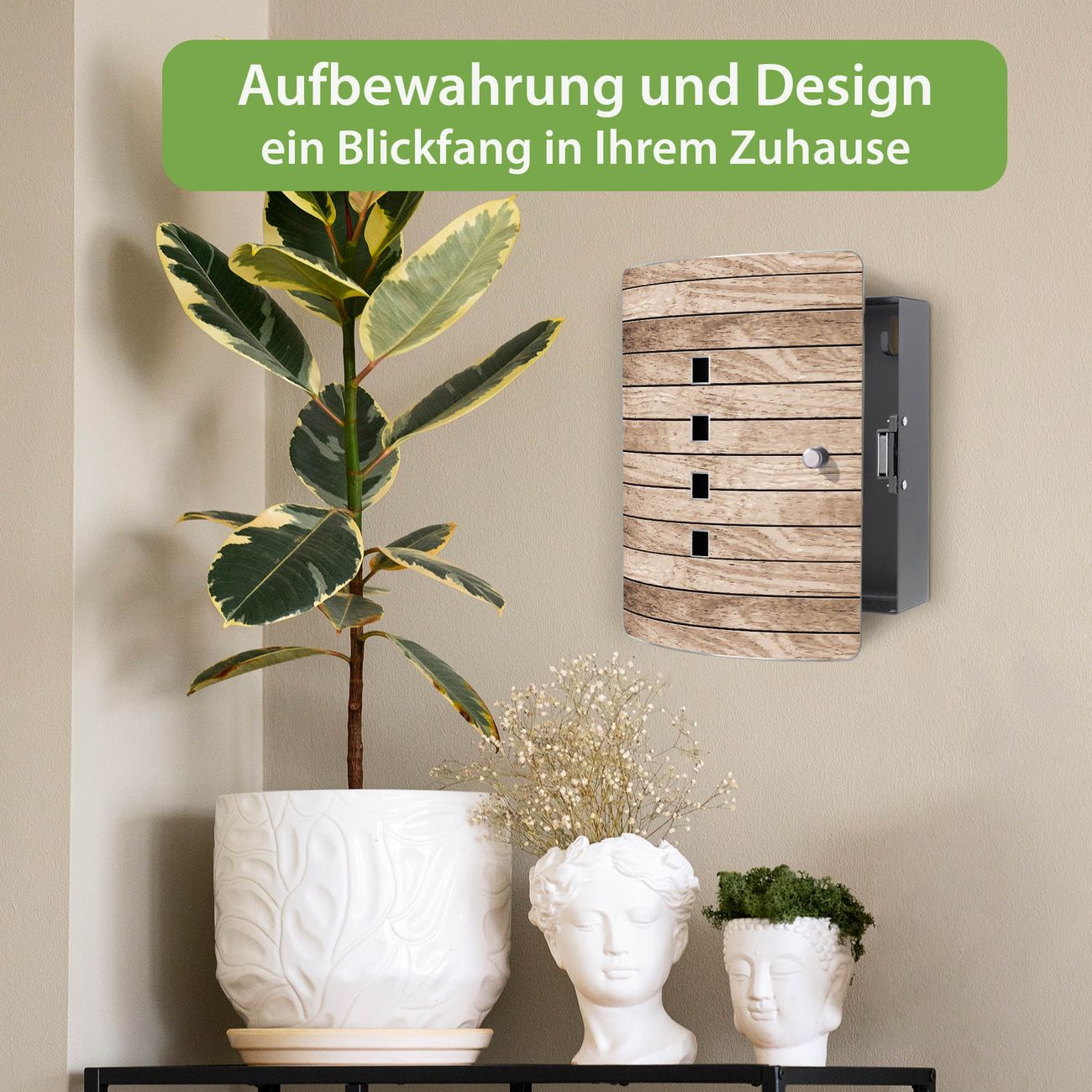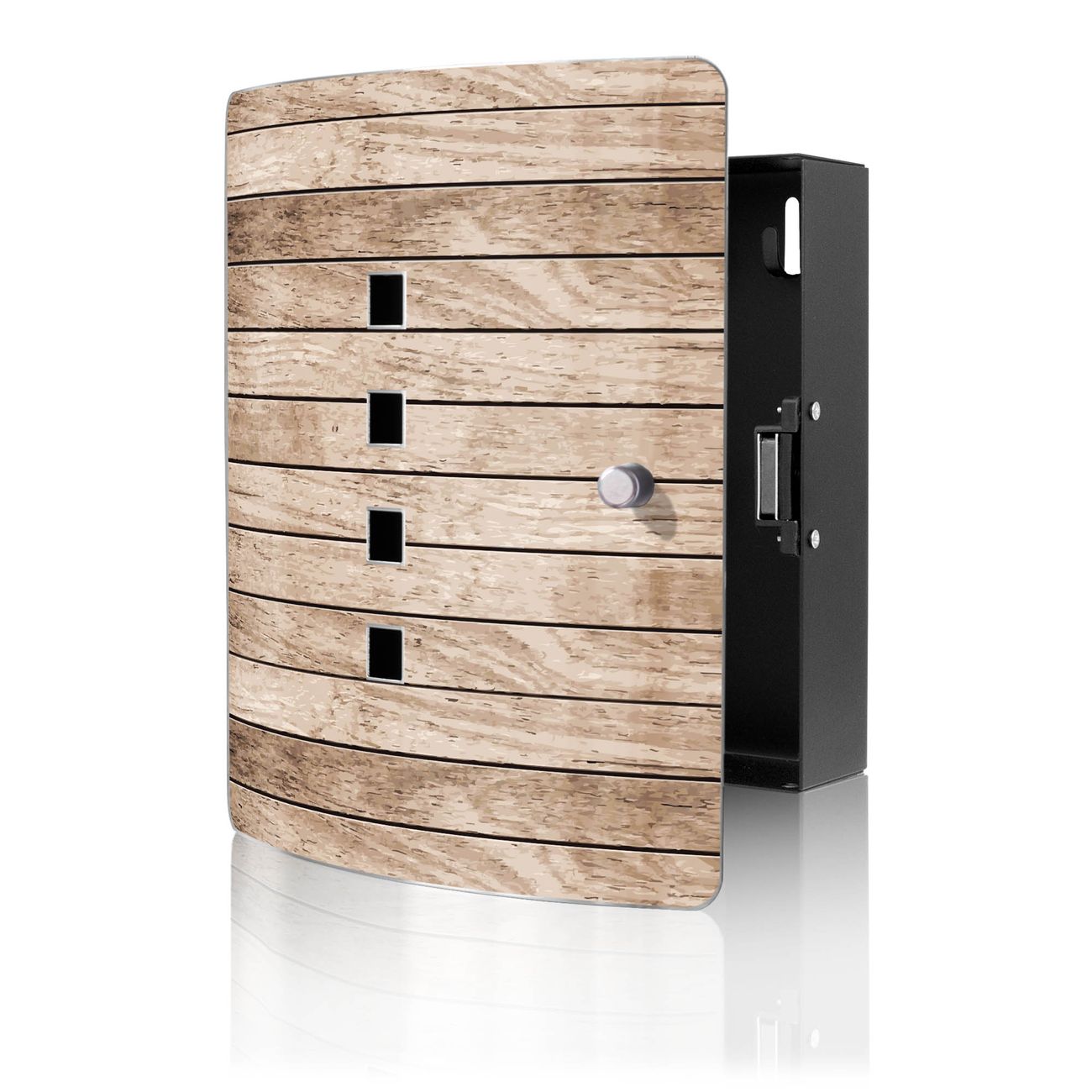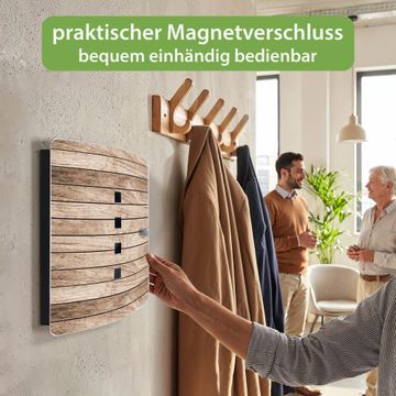 Funktion / Nutzen: Die leicht geschwungene Edelstahltür ist mit einer hochwertigen Motivfolie und dem Motiv Motiv Blasse Holzlatten kaschiert. Ein praktischer Magnetverschluss ermöglicht Ihnen ein schnelles Öffnen und Schließen. Befestigt wird der Schlüsselkasten an 2 Stellen auf der Rückseite, passendes Montagematerial fügen wir bereits bei.
