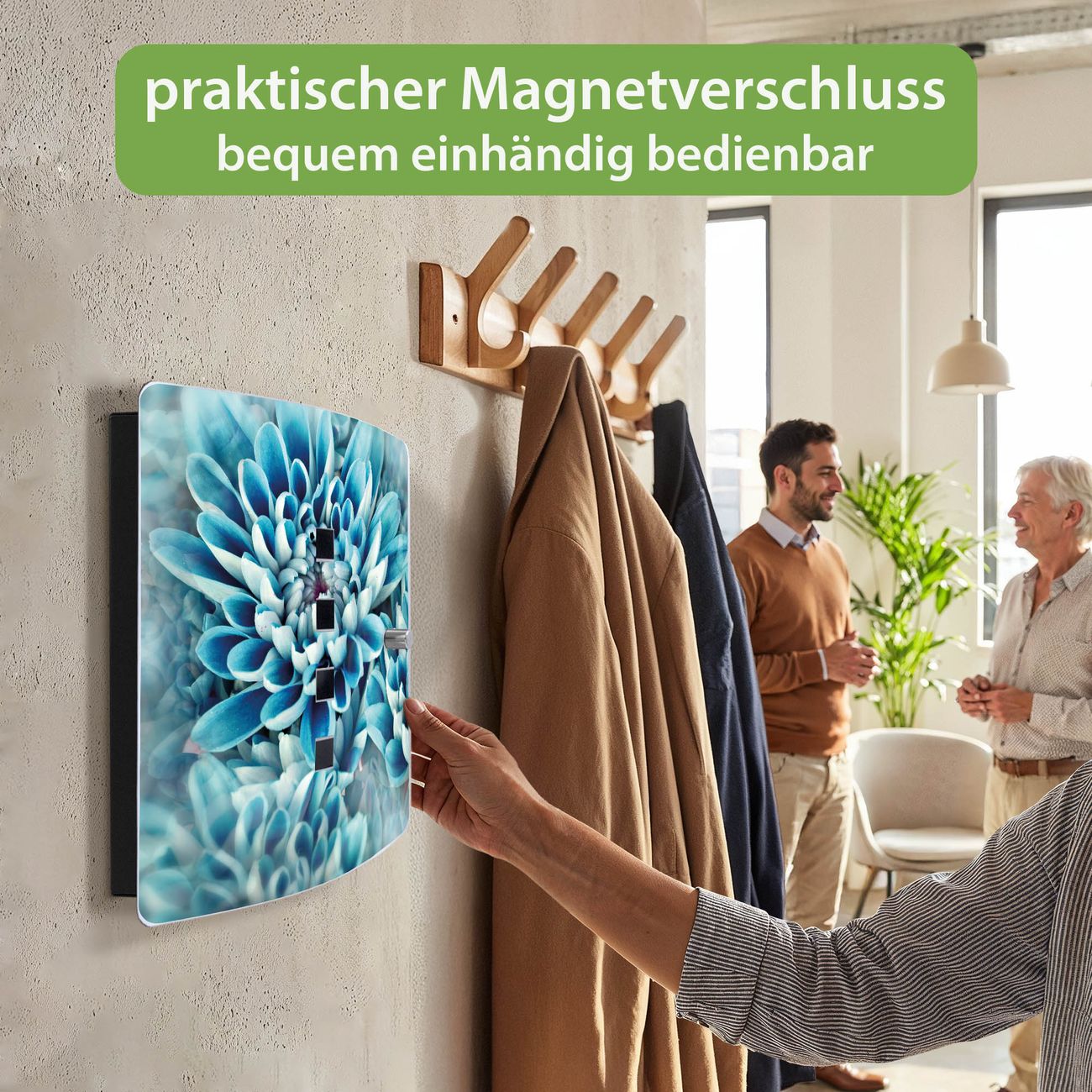 Funktion / Nutzen: Die leicht geschwungene Edelstahltür ist mit einer hochwertigen Motivfolie und dem Motiv Motiv Blaue Blüten kaschiert. Ein praktischer Magnetverschluss ermöglicht Ihnen ein schnelles Öffnen und Schließen. Befestigt wird der Schlüsselkasten an 2 Stellen auf der Rückseite, passendes Montagematerial fügen wir bereits bei.
