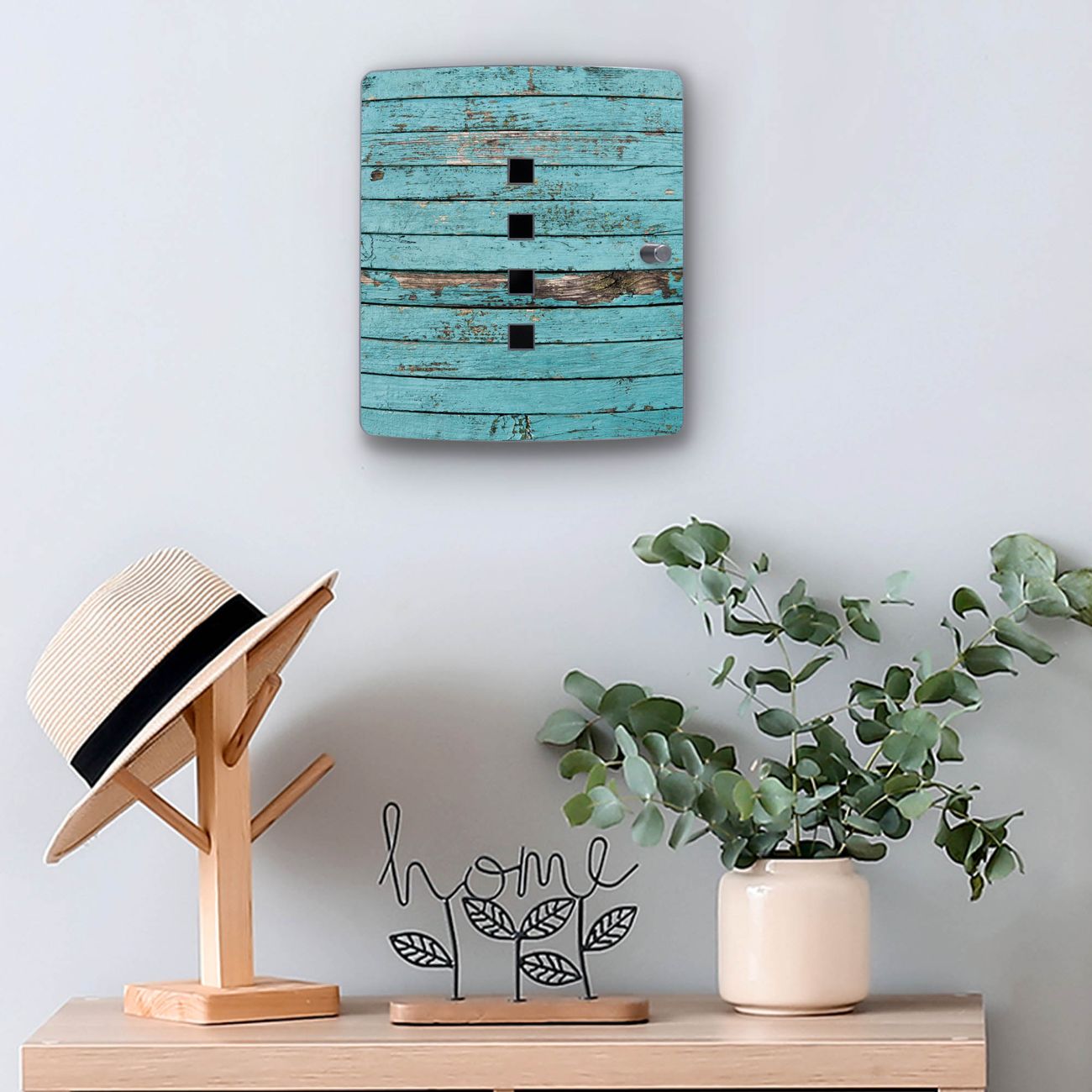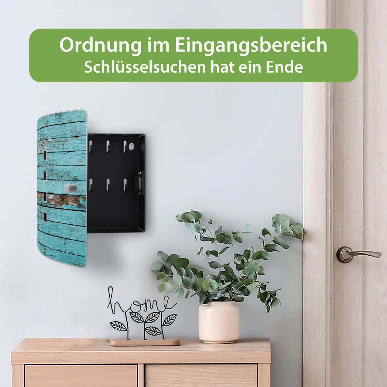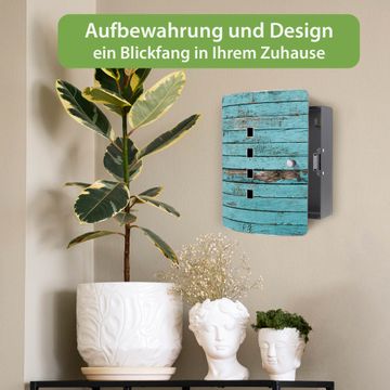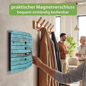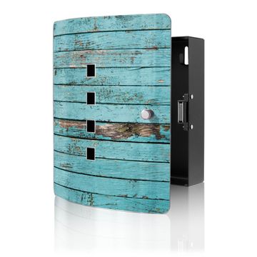 Funktion / Nutzen: Die leicht geschwungene Edelstahltür ist mit einer hochwertigen Motivfolie und dem Motiv Motiv Blaue Holzlatten kaschiert. Ein praktischer Magnetverschluss ermöglicht Ihnen ein schnelles Öffnen und Schließen. Befestigt wird der Schlüsselkasten an 2 Stellen auf der Rückseite, passendes Montagematerial fügen wir bereits bei.