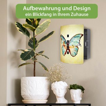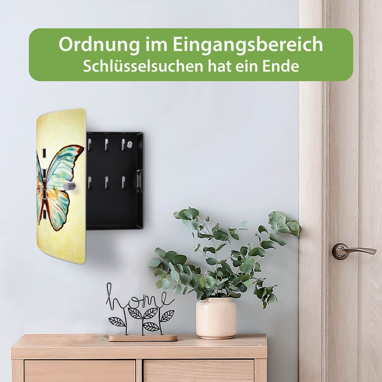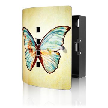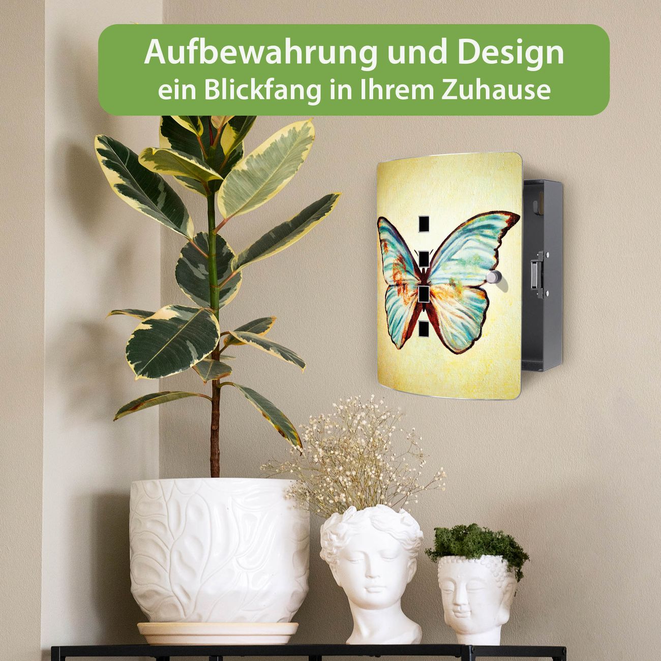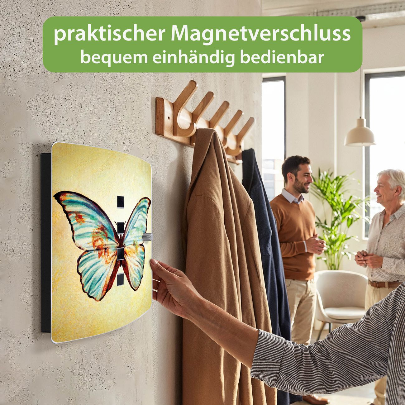 Funktion / Nutzen: Die leicht geschwungene Edelstahltür ist mit einer hochwertigen Motivfolie und dem Motiv Motiv Blauer Falter kaschiert. Ein praktischer Magnetverschluss ermöglicht Ihnen ein schnelles Öffnen und Schließen. Befestigt wird der Schlüsselkasten an 2 Stellen auf der Rückseite, passendes Montagematerial fügen wir bereits bei.