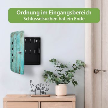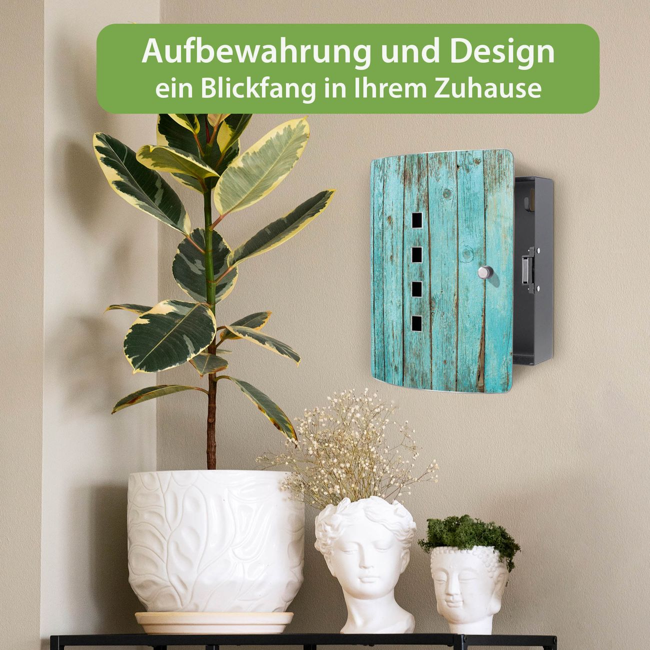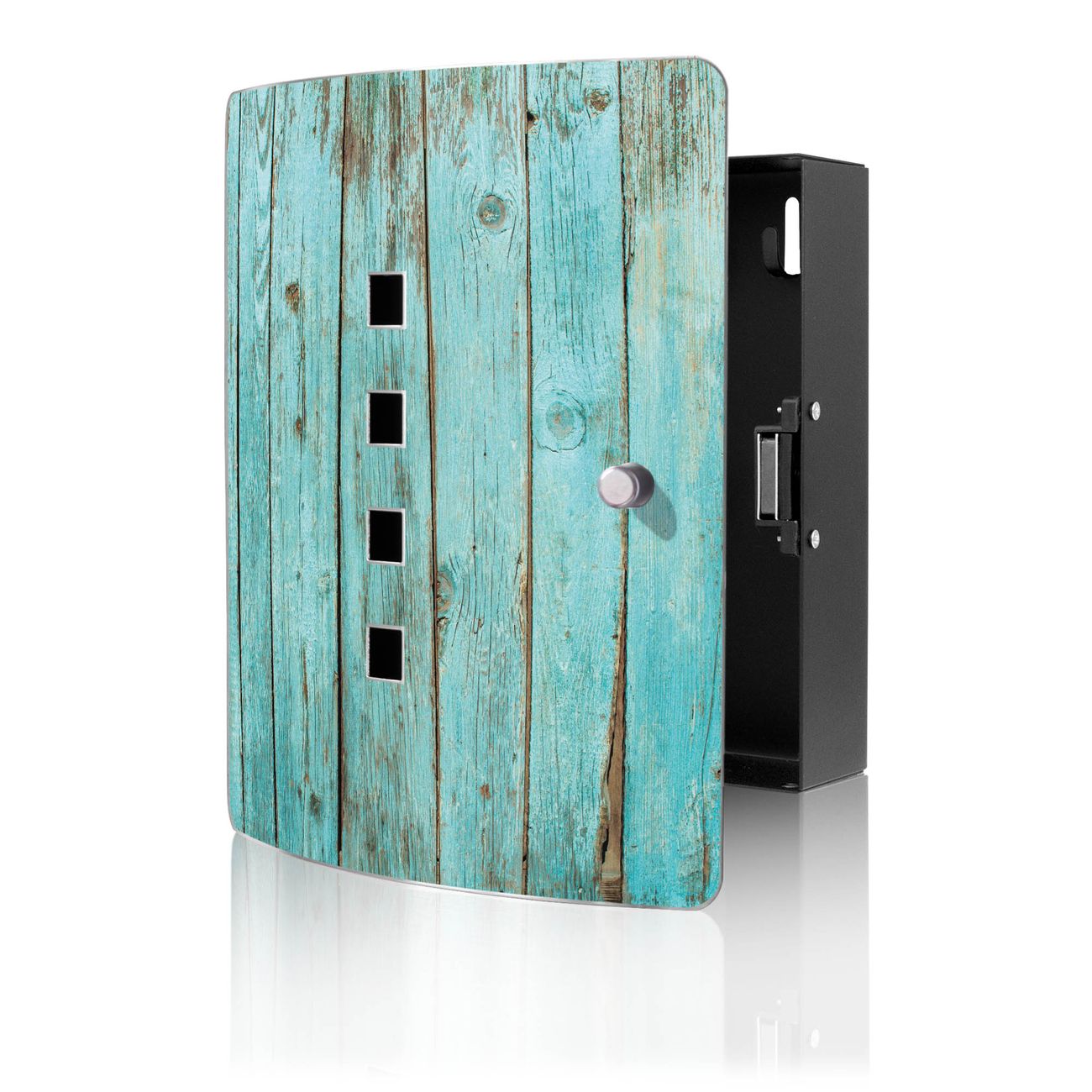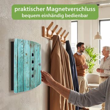 Funktion / Nutzen: Die leicht geschwungene Edelstahltür ist mit einer hochwertigen Motivfolie und dem Motiv Motiv Blaues Holz kaschiert. Ein praktischer Magnetverschluss ermöglicht Ihnen ein schnelles Öffnen und Schließen. Befestigt wird der Schlüsselkasten an 2 Stellen auf der Rückseite, passendes Montagematerial fügen wir bereits bei.