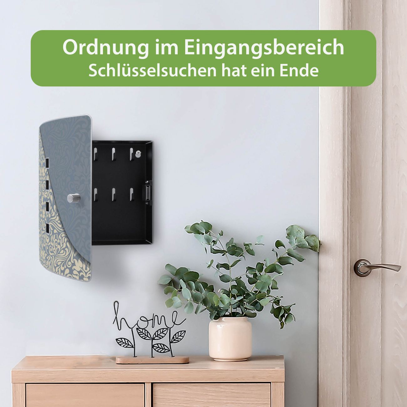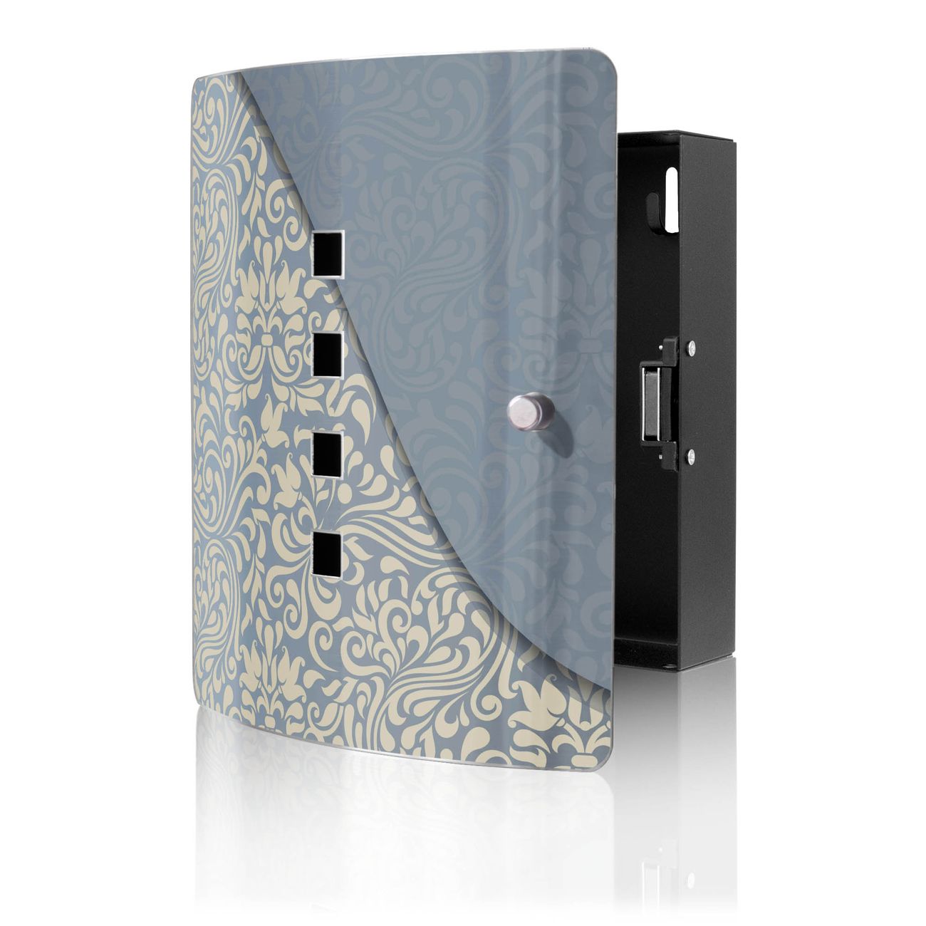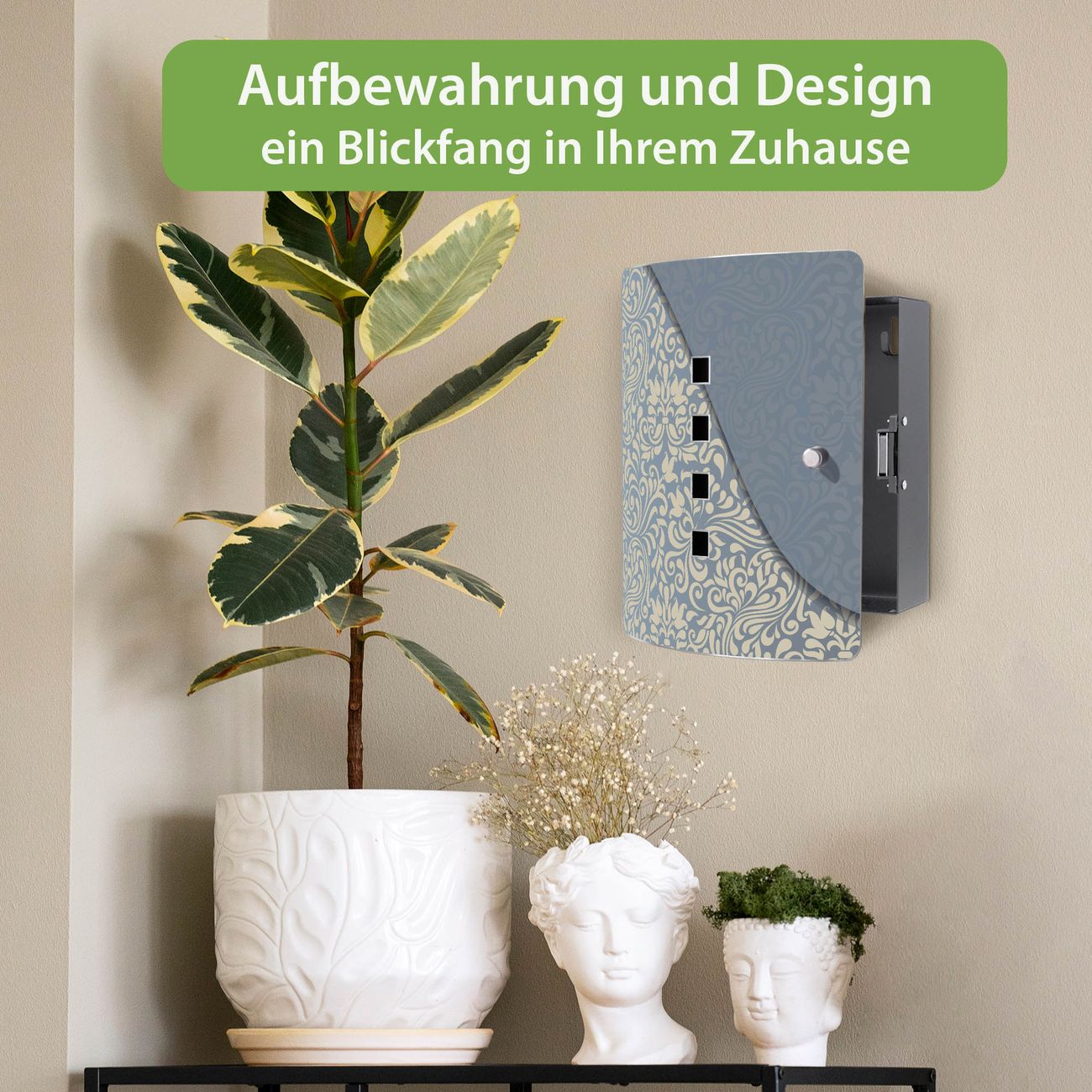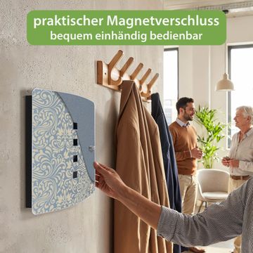 Funktion / Nutzen: Die leicht geschwungene Edelstahltür ist mit einer hochwertigen Motivfolie und dem Motiv Motiv Blaues Ornament kaschiert. Ein praktischer Magnetverschluss ermöglicht Ihnen ein schnelles Öffnen und Schließen. Befestigt wird der Schlüsselkasten an 2 Stellen auf der Rückseite, passendes Montagematerial fügen wir bereits bei.