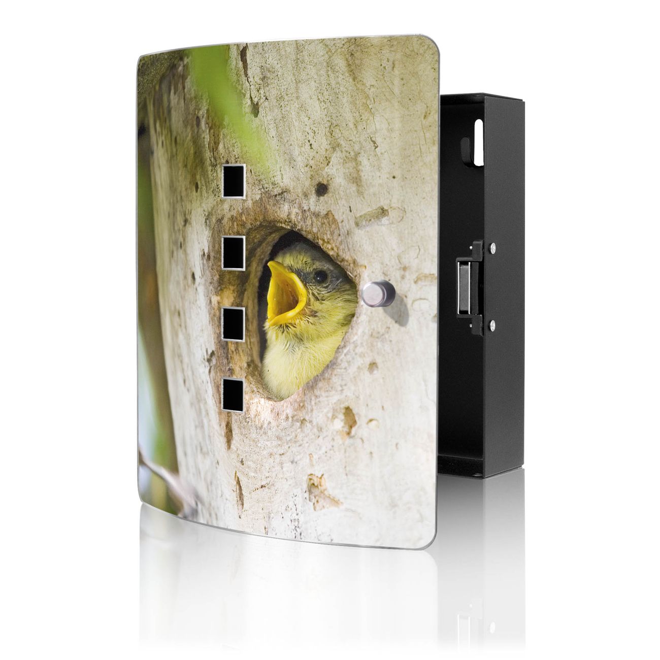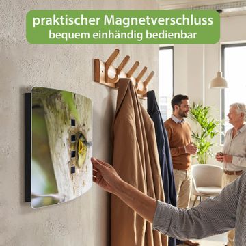 Funktion / Nutzen: Die leicht geschwungene Edelstahltür ist mit einer hochwertigen Motivfolie und dem Motiv Motiv Blaumeise kaschiert. Ein praktischer Magnetverschluss ermöglicht Ihnen ein schnelles Öffnen und Schließen. Befestigt wird der Schlüsselkasten an 2 Stellen auf der Rückseite, passendes Montagematerial fügen wir bereits bei.