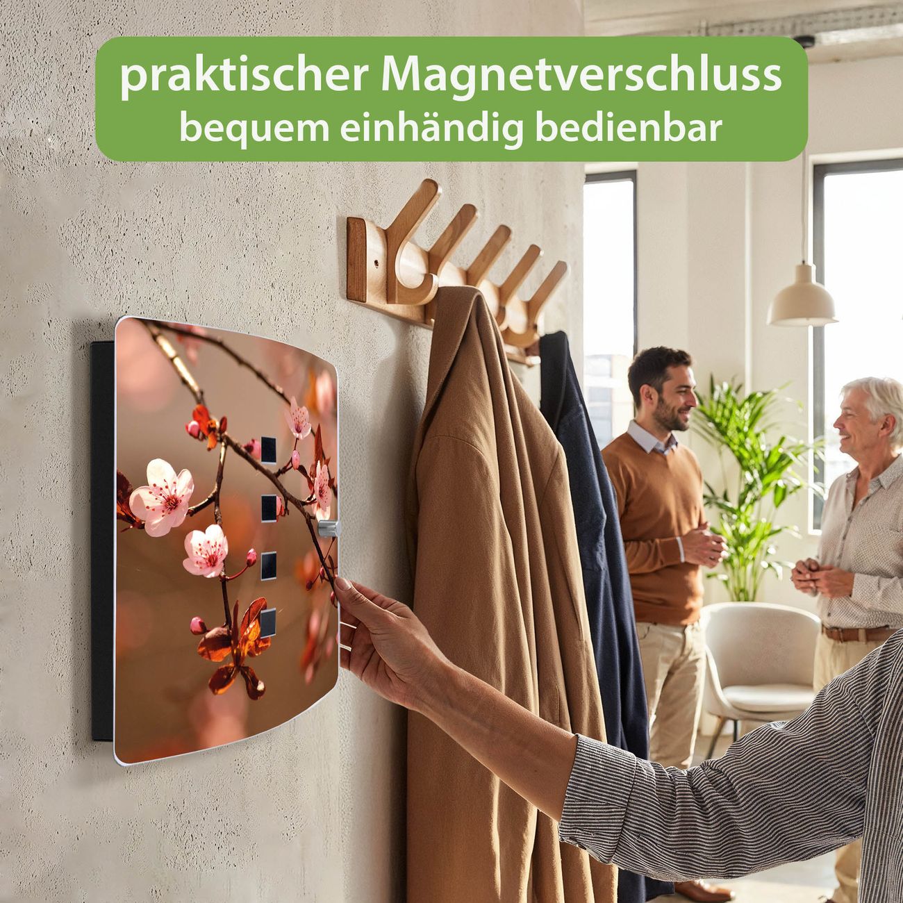 Funktion / Nutzen: Die leicht geschwungene Edelstahltür ist mit einer hochwertigen Motivfolie und dem Motiv Motiv Blühender Kirschzweig kaschiert. Ein praktischer Magnetverschluss ermöglicht Ihnen ein schnelles Öffnen und Schließen. Befestigt wird der Schlüsselkasten an 2 Stellen auf der Rückseite, passendes Montagematerial fügen wir bereits bei.
