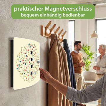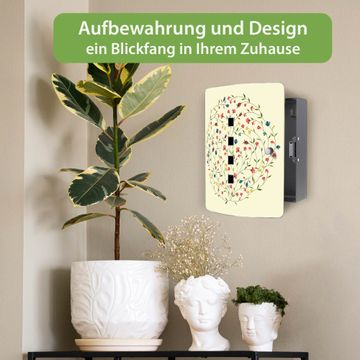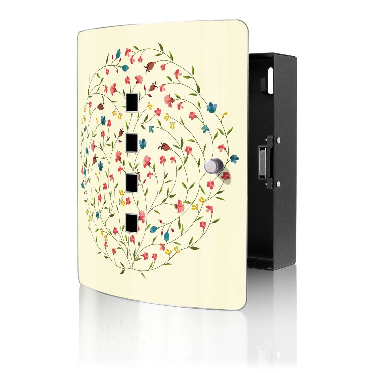Funktion / Nutzen: Die leicht geschwungene Edelstahltür ist mit einer hochwertigen Motivfolie und dem Motiv Motiv Blumenreigen kaschiert. Ein praktischer Magnetverschluss ermöglicht Ihnen ein schnelles Öffnen und Schließen. Befestigt wird der Schlüsselkasten an 2 Stellen auf der Rückseite, passendes Montagematerial fügen wir bereits bei.