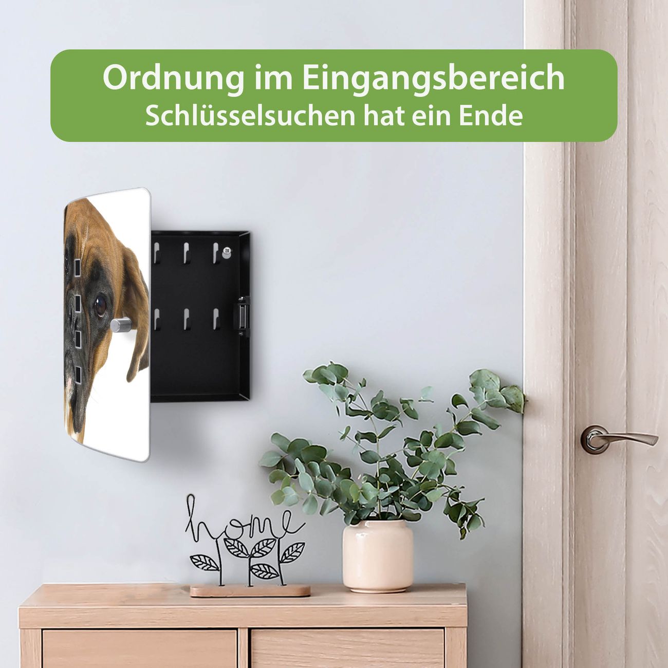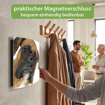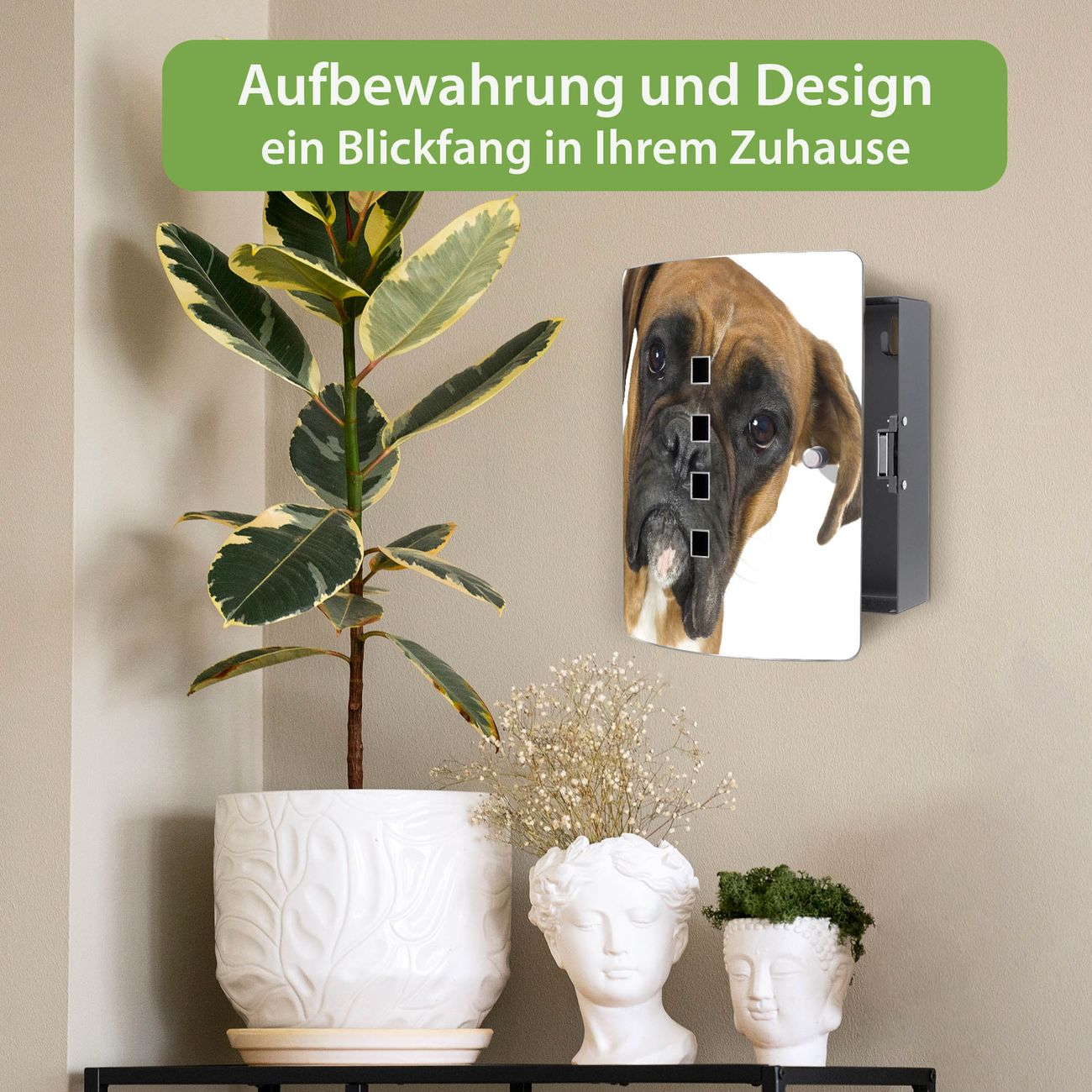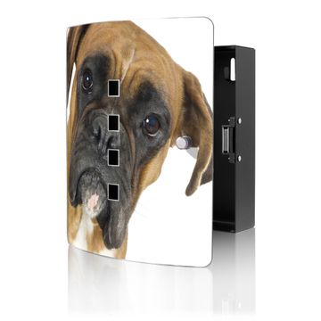 Funktion / Nutzen: Die leicht geschwungene Edelstahltür ist mit einer hochwertigen Motivfolie und dem Motiv Motiv Boxer kaschiert. Ein praktischer Magnetverschluss ermöglicht Ihnen ein schnelles Öffnen und Schließen. Befestigt wird der Schlüsselkasten an 2 Stellen auf der Rückseite, passendes Montagematerial fügen wir bereits bei.