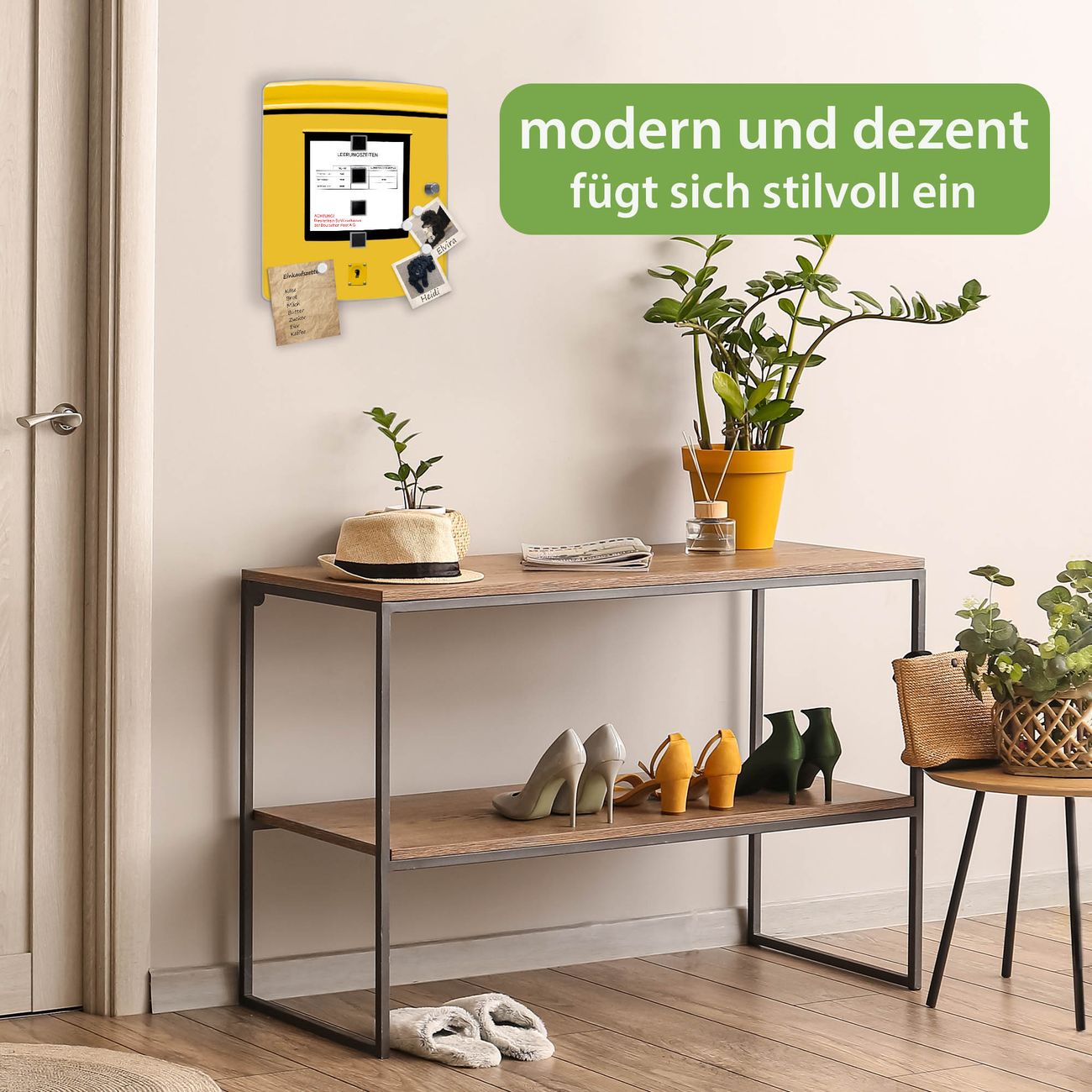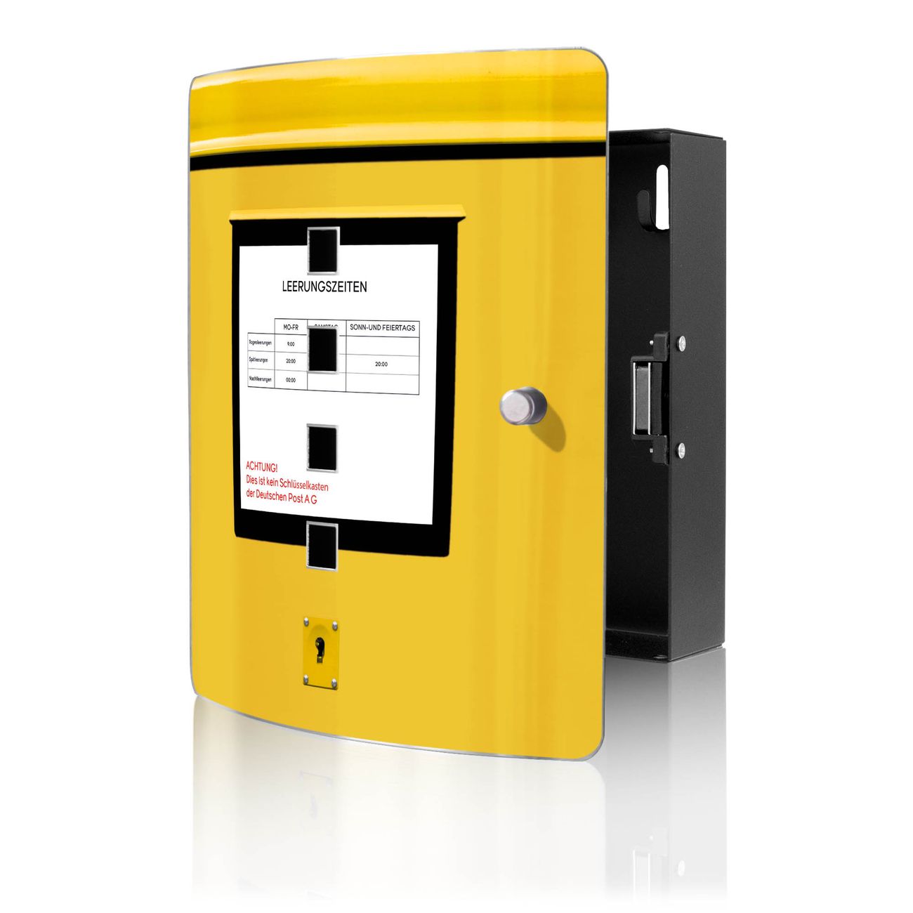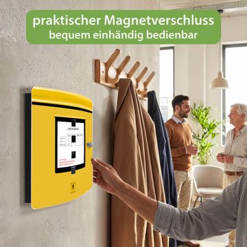 Funktion / Nutzen: Die leicht geschwungene Edelstahltür ist mit einer hochwertigen Motivfolie und dem Motiv Motiv Briefkasten Gelb kaschiert. Ein praktischer Magnetverschluss ermöglicht Ihnen ein schnelles Öffnen und Schließen. Befestigt wird der Schlüsselkasten an 2 Stellen auf der Rückseite, passendes Montagematerial fügen wir bereits bei.