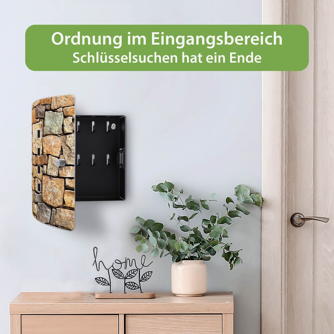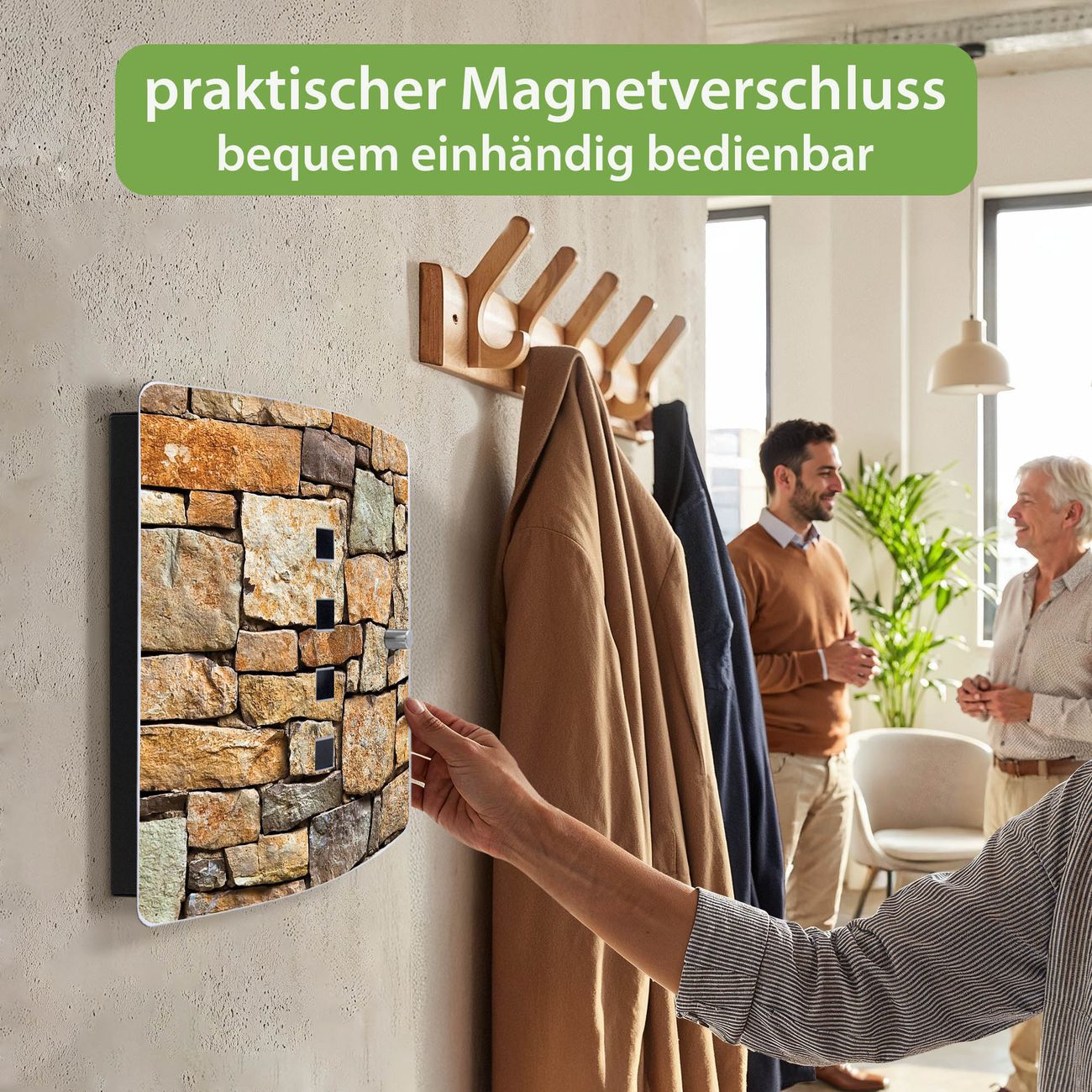 Funktion / Nutzen: Die leicht geschwungene Edelstahltür ist mit einer hochwertigen Motivfolie und dem Motiv Motiv Bruchsteinmauer kaschiert. Ein praktischer Magnetverschluss ermöglicht Ihnen ein schnelles Öffnen und Schließen. Befestigt wird der Schlüsselkasten an 2 Stellen auf der Rückseite, passendes Montagematerial fügen wir bereits bei.