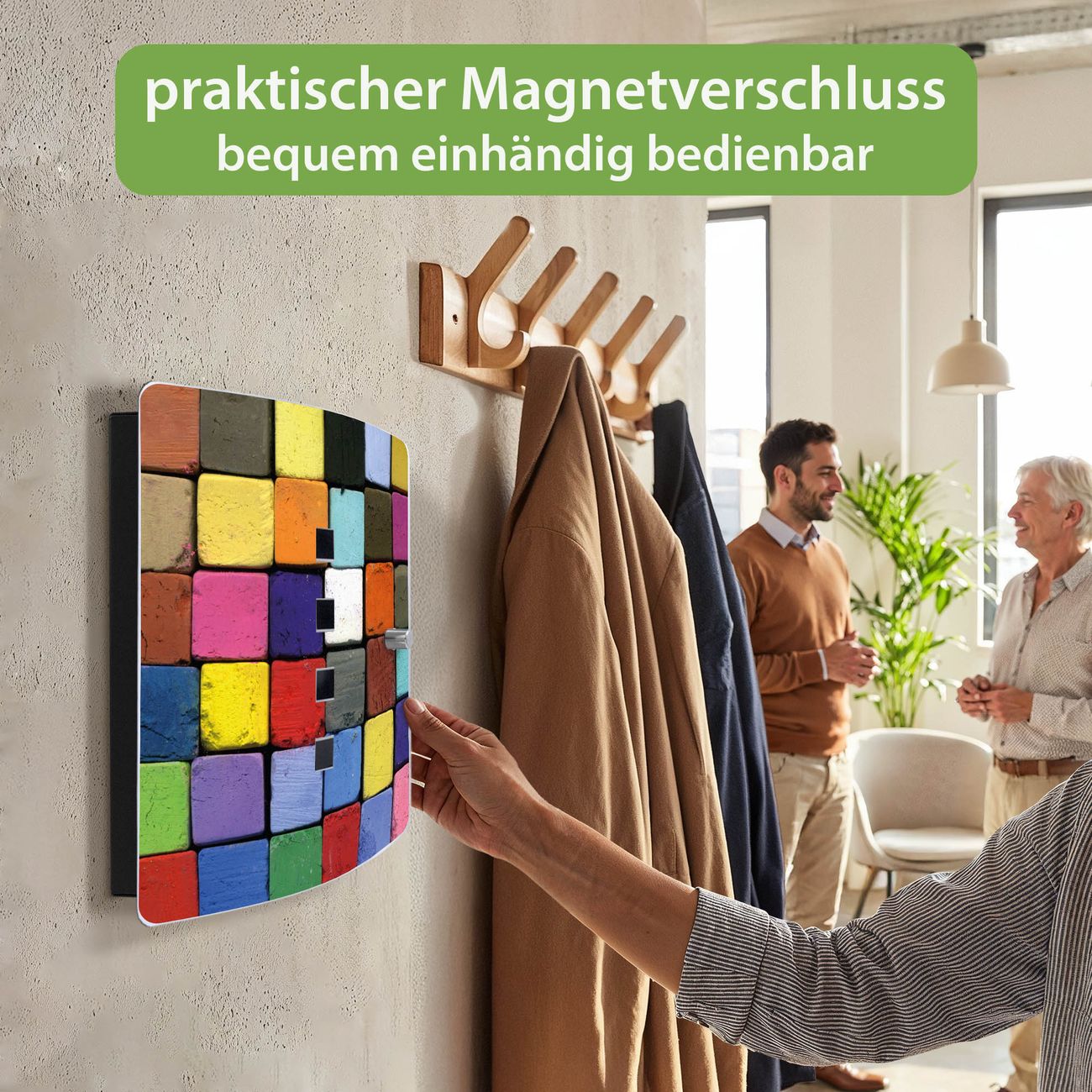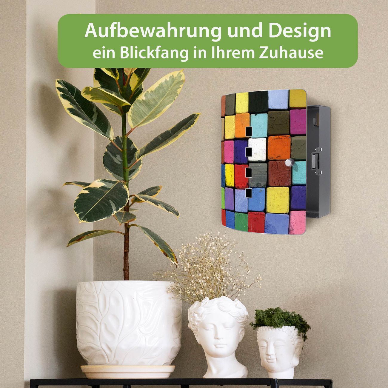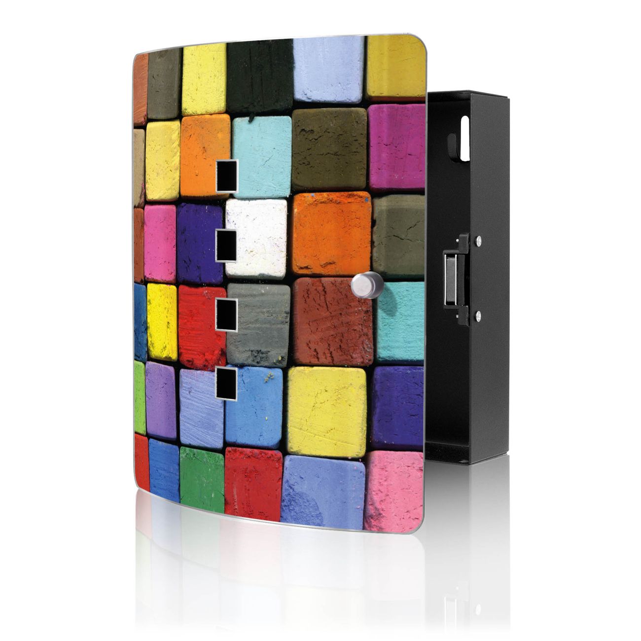 Funktion / Nutzen: Die leicht geschwungene Edelstahltür ist mit einer hochwertigen Motivfolie und dem Motiv Motiv Bunte Kreide kaschiert. Ein praktischer Magnetverschluss ermöglicht Ihnen ein schnelles Öffnen und Schließen. Befestigt wird der Schlüsselkasten an 2 Stellen auf der Rückseite, passendes Montagematerial fügen wir bereits bei.