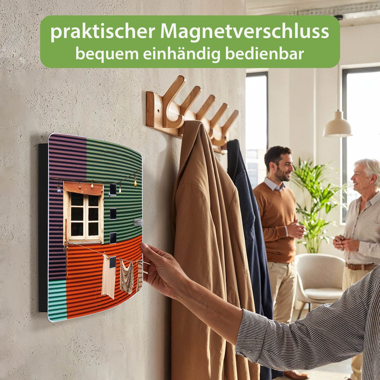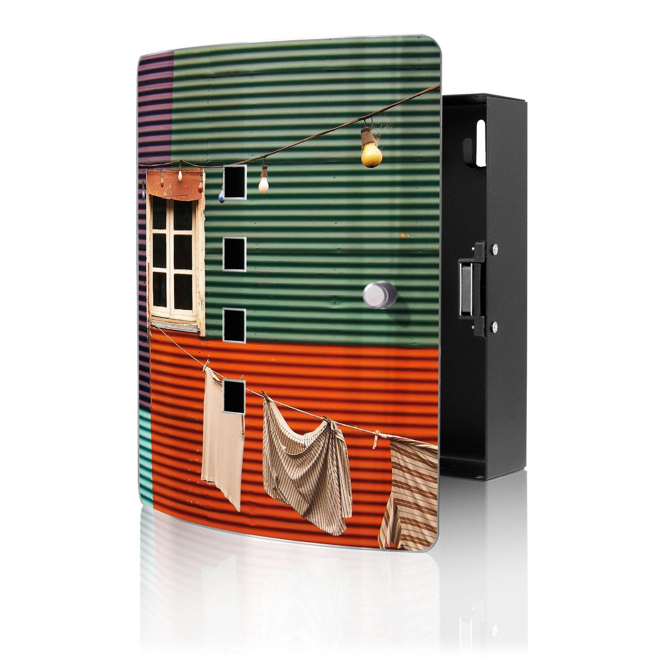 Funktion / Nutzen: Die leicht geschwungene Edelstahltür ist mit einer hochwertigen Motivfolie und dem Motiv Motiv Buntes Haus kaschiert. Ein praktischer Magnetverschluss ermöglicht Ihnen ein schnelles Öffnen und Schließen. Befestigt wird der Schlüsselkasten an 2 Stellen auf der Rückseite, passendes Montagematerial fügen wir bereits bei.