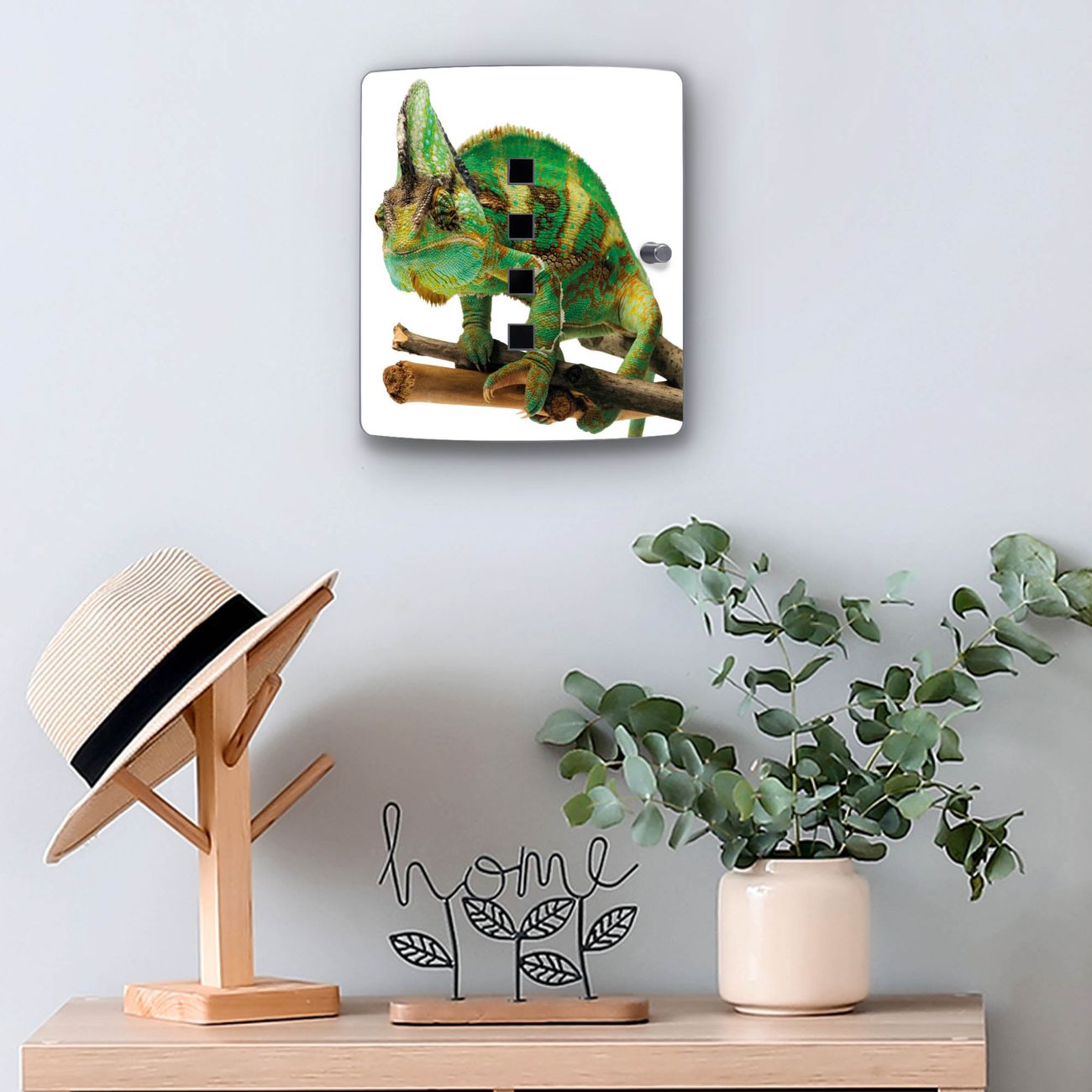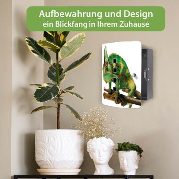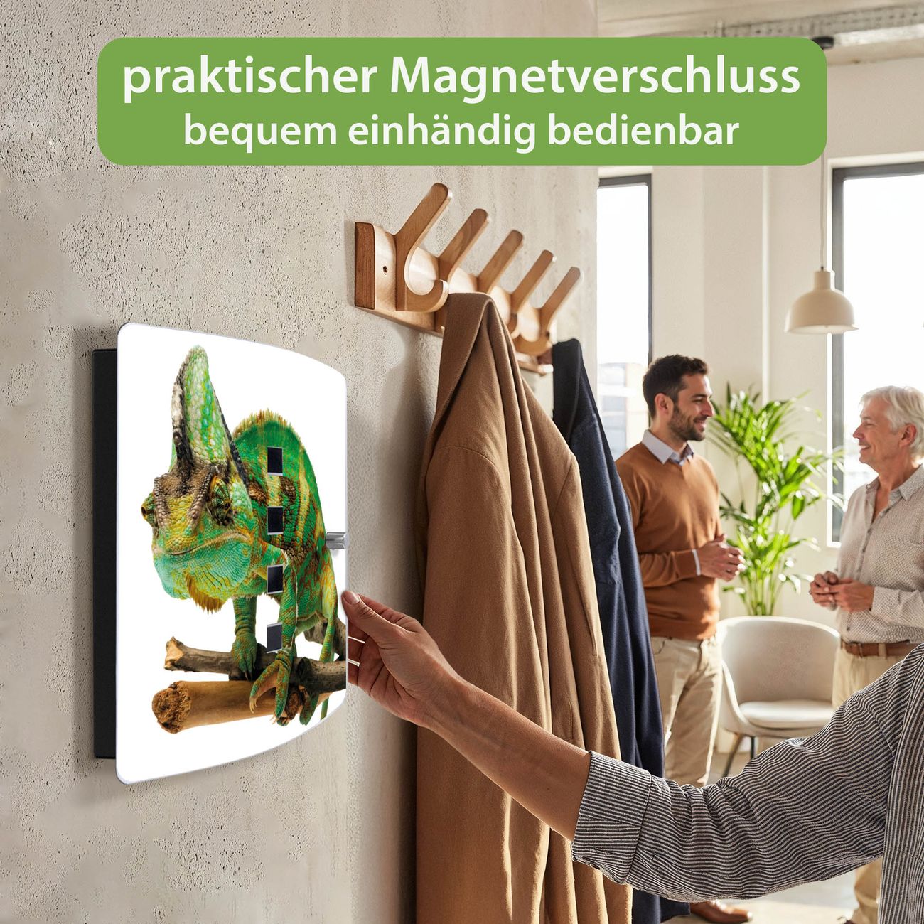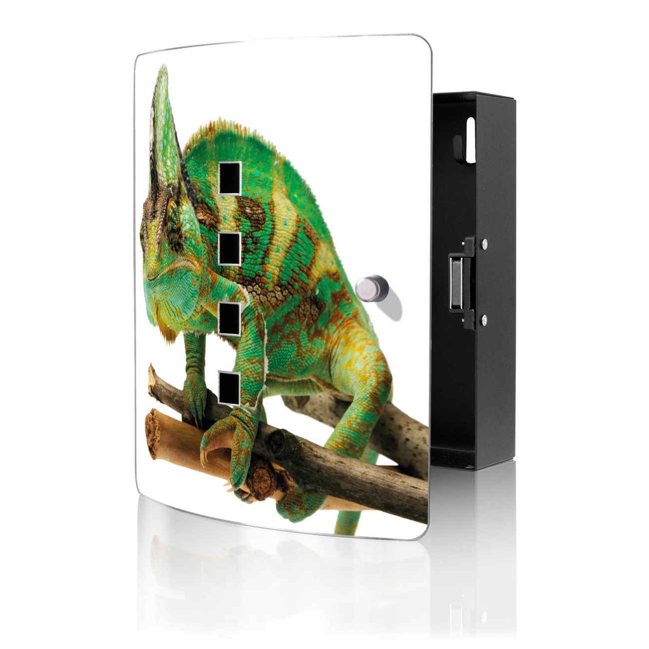 Funktion / Nutzen: Die leicht geschwungene Edelstahltür ist mit einer hochwertigen Motivfolie und dem Motiv Motiv Chamäleon kaschiert. Ein praktischer Magnetverschluss ermöglicht Ihnen ein schnelles Öffnen und Schließen. Befestigt wird der Schlüsselkasten an 2 Stellen auf der Rückseite, passendes Montagematerial fügen wir bereits bei.