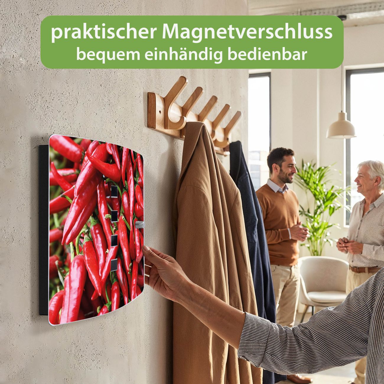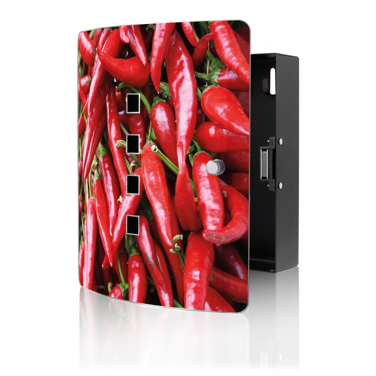 Funktion / Nutzen: Die leicht geschwungene Edelstahltür ist mit einer hochwertigen Motivfolie und dem Motiv Motiv Chilli kaschiert. Ein praktischer Magnetverschluss ermöglicht Ihnen ein schnelles Öffnen und Schließen. Befestigt wird der Schlüsselkasten an 2 Stellen auf der Rückseite, passendes Montagematerial fügen wir bereits bei.