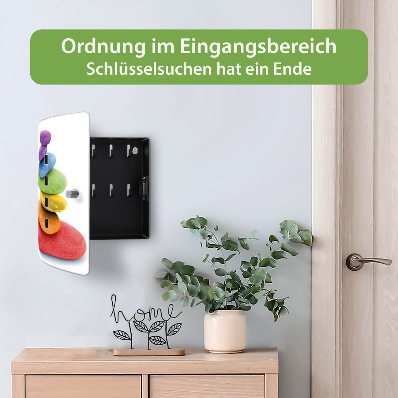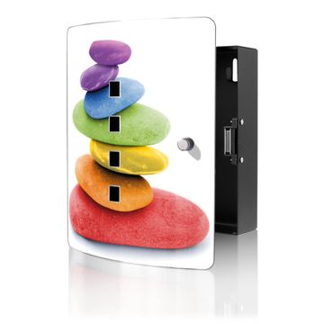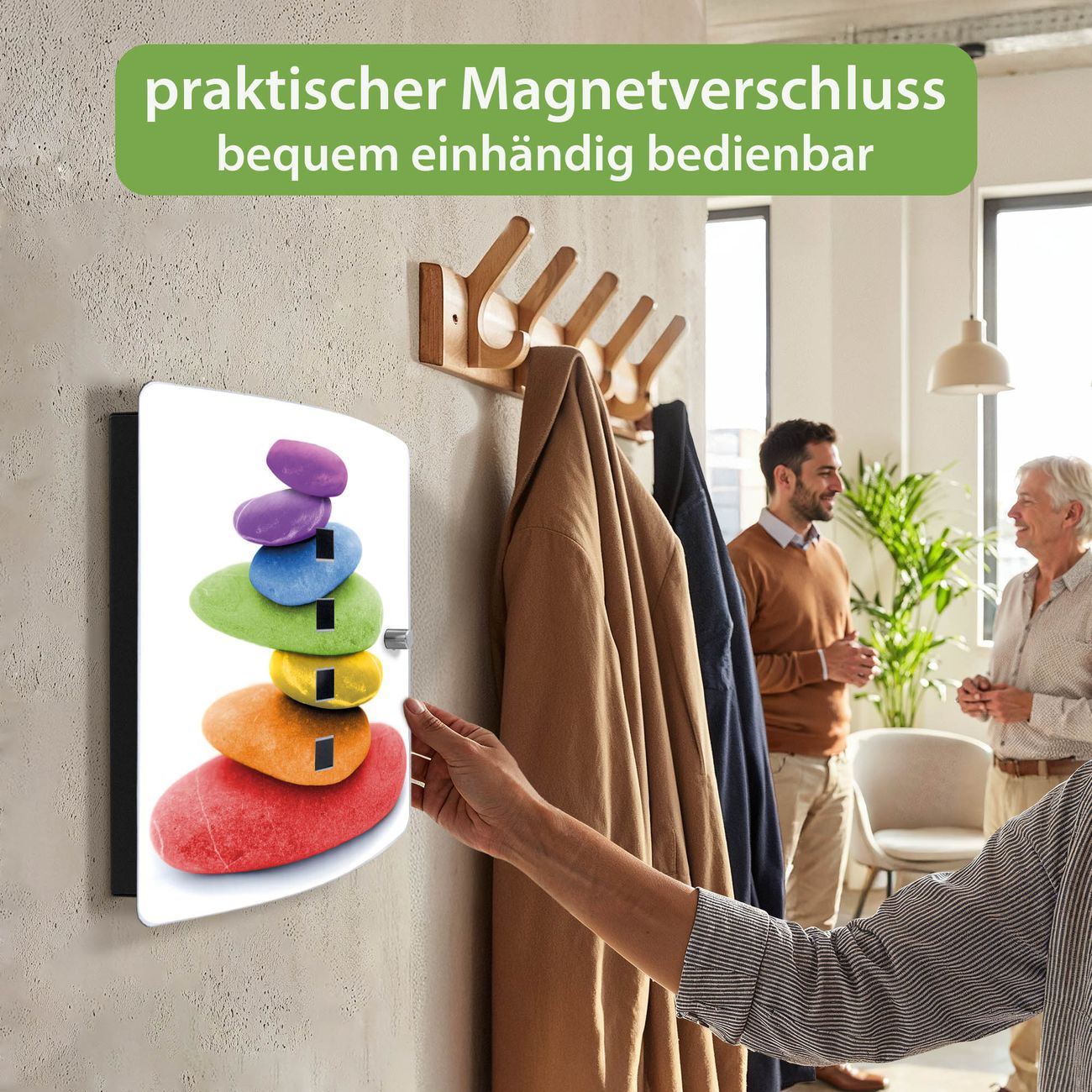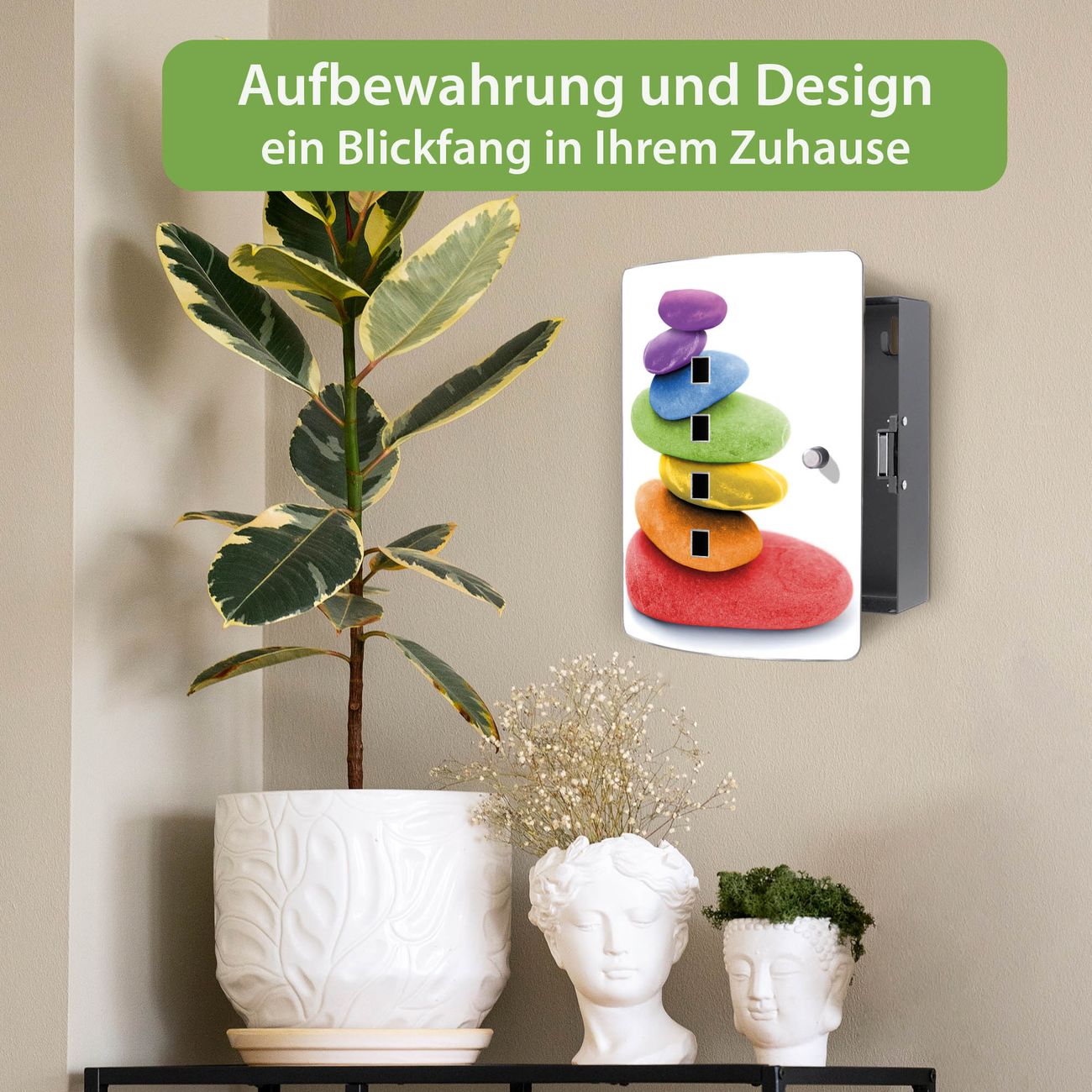 Funktion / Nutzen: Die leicht geschwungene Edelstahltür ist mit einer hochwertigen Motivfolie und dem Motiv Motiv Coloured Stone kaschiert. Ein praktischer Magnetverschluss ermöglicht Ihnen ein schnelles Öffnen und Schließen. Befestigt wird der Schlüsselkasten an 2 Stellen auf der Rückseite, passendes Montagematerial fügen wir bereits bei.