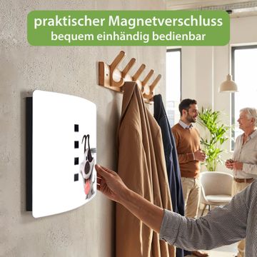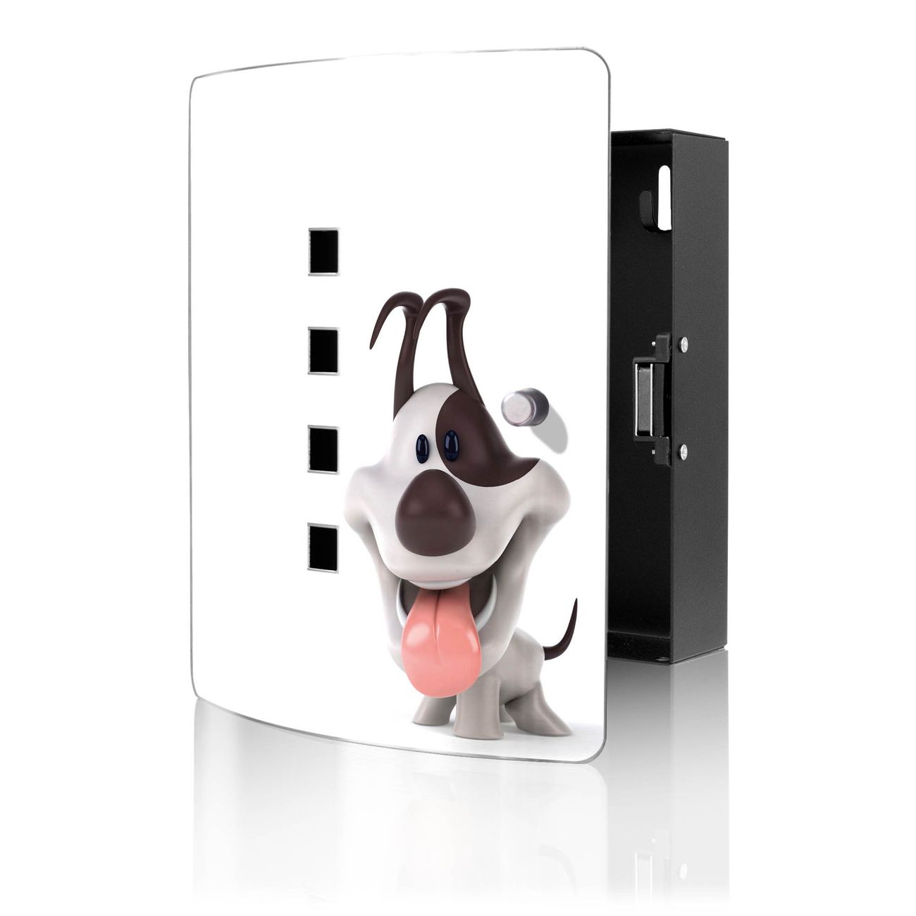 Funktion / Nutzen: Die leicht geschwungene Edelstahltür ist mit einer hochwertigen Motivfolie und dem Motiv Motiv Comic-Hund kaschiert. Ein praktischer Magnetverschluss ermöglicht Ihnen ein schnelles Öffnen und Schließen. Befestigt wird der Schlüsselkasten an 2 Stellen auf der Rückseite, passendes Montagematerial fügen wir bereits bei.