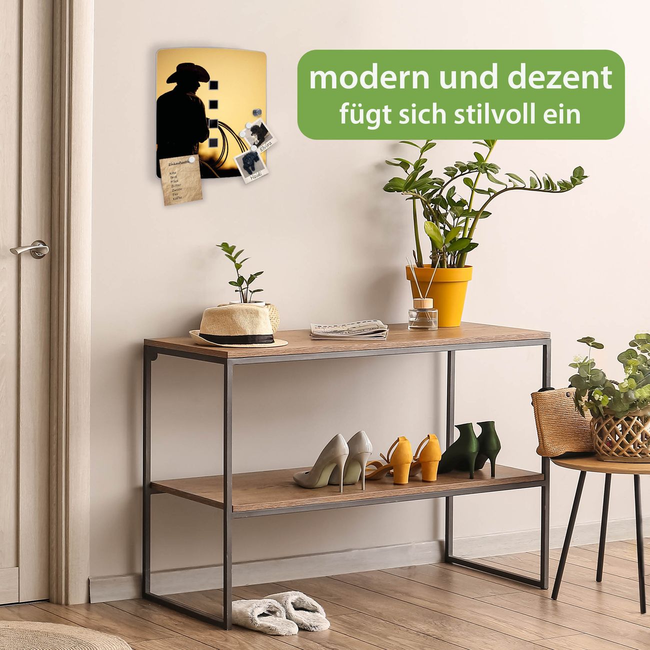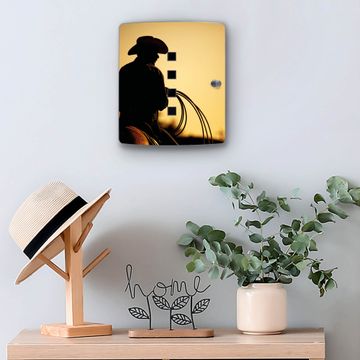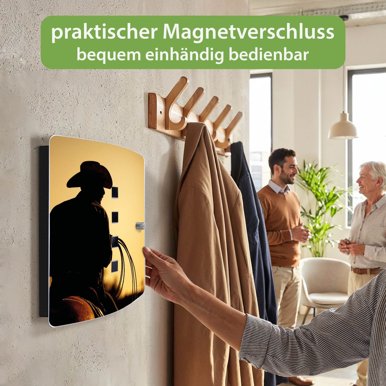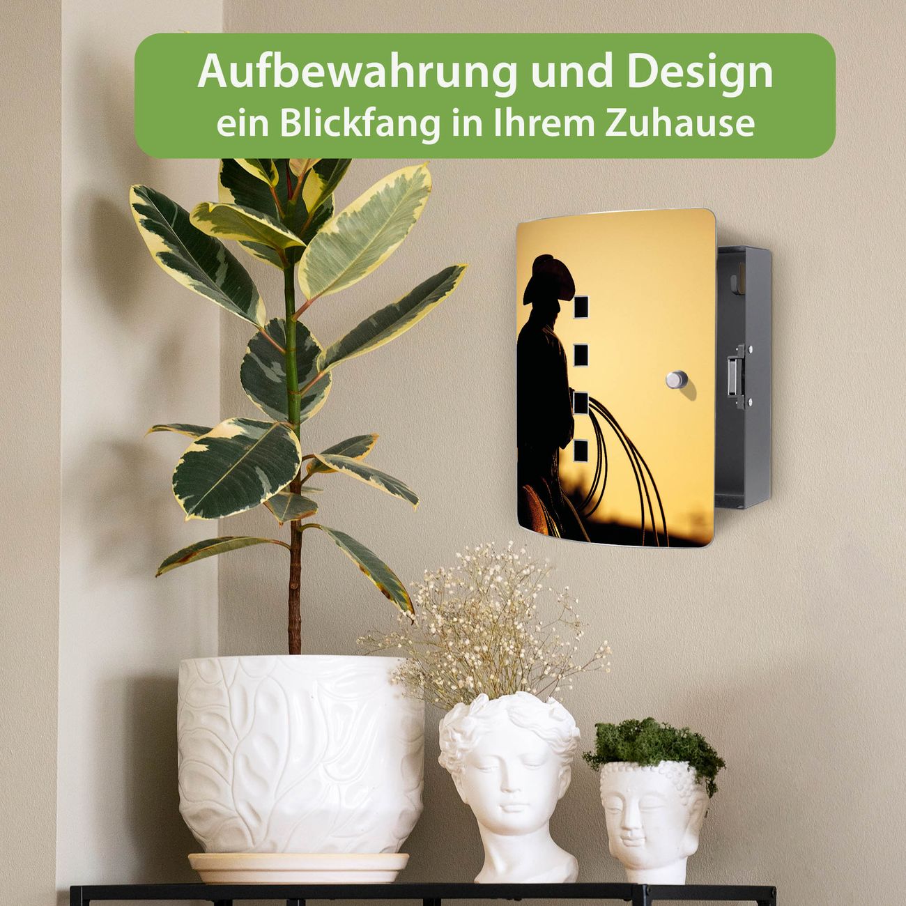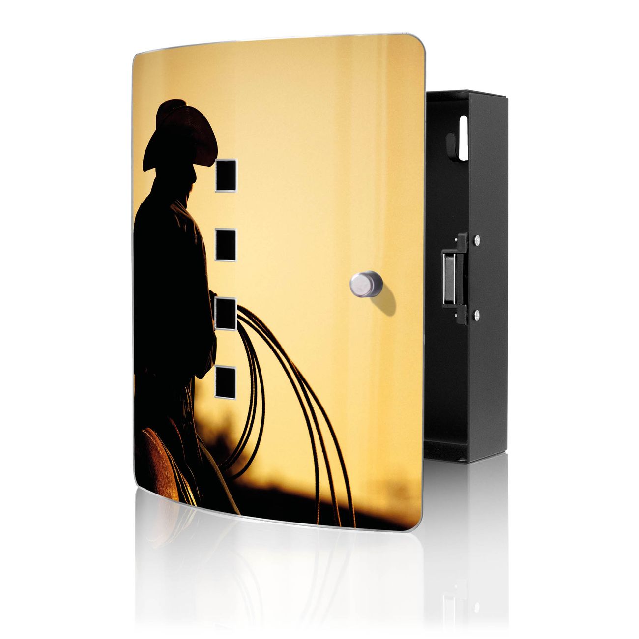 Funktion / Nutzen: Die leicht geschwungene Edelstahltür ist mit einer hochwertigen Motivfolie und dem Motiv Motiv Cowboy kaschiert. Ein praktischer Magnetverschluss ermöglicht Ihnen ein schnelles Öffnen und Schließen. Befestigt wird der Schlüsselkasten an 2 Stellen auf der Rückseite, passendes Montagematerial fügen wir bereits bei.
